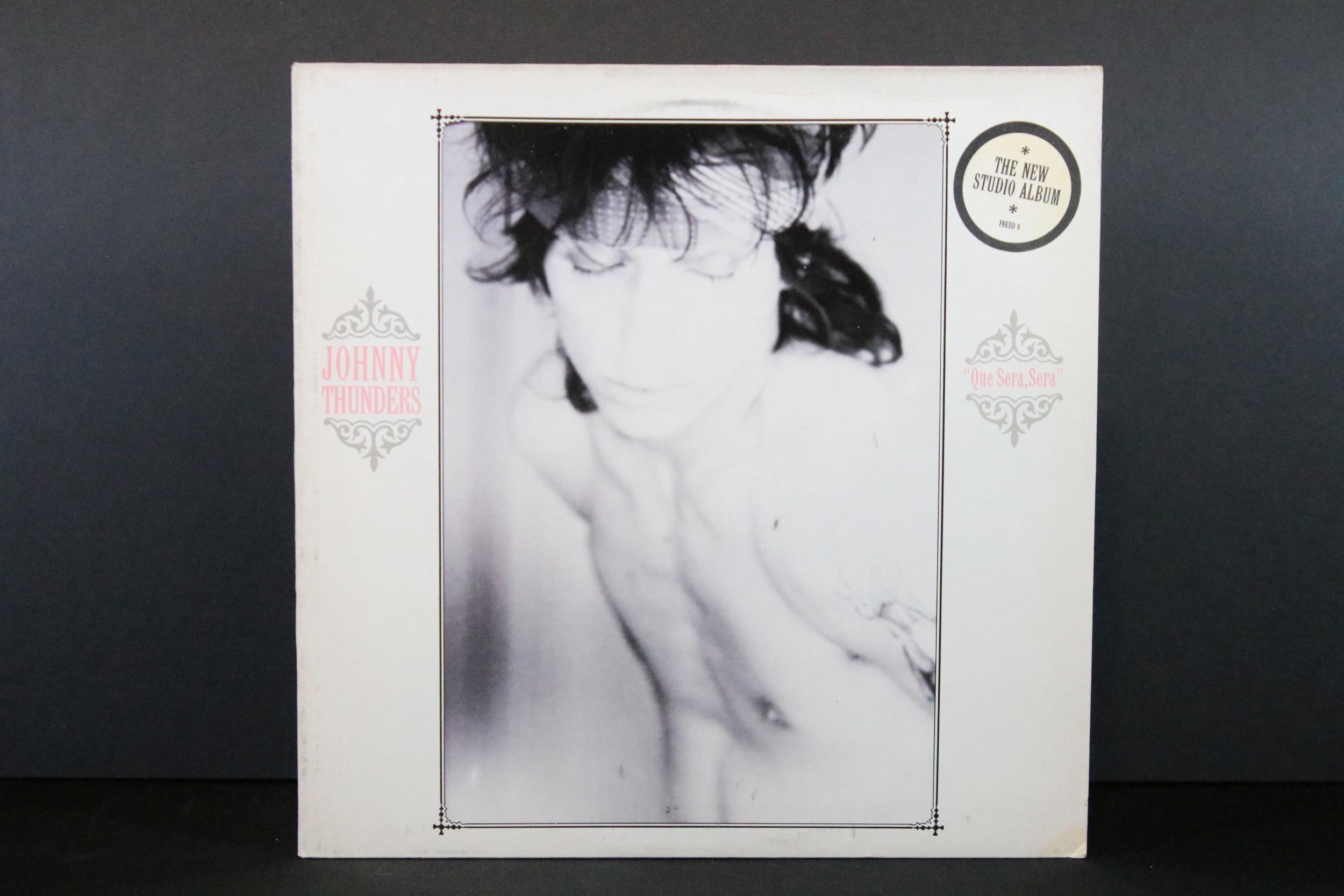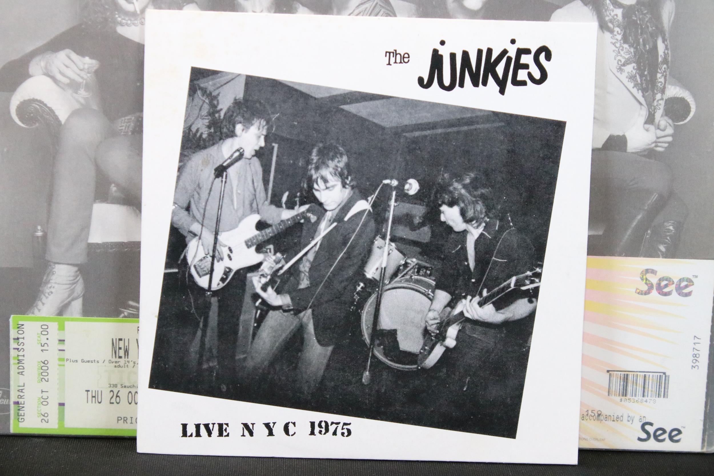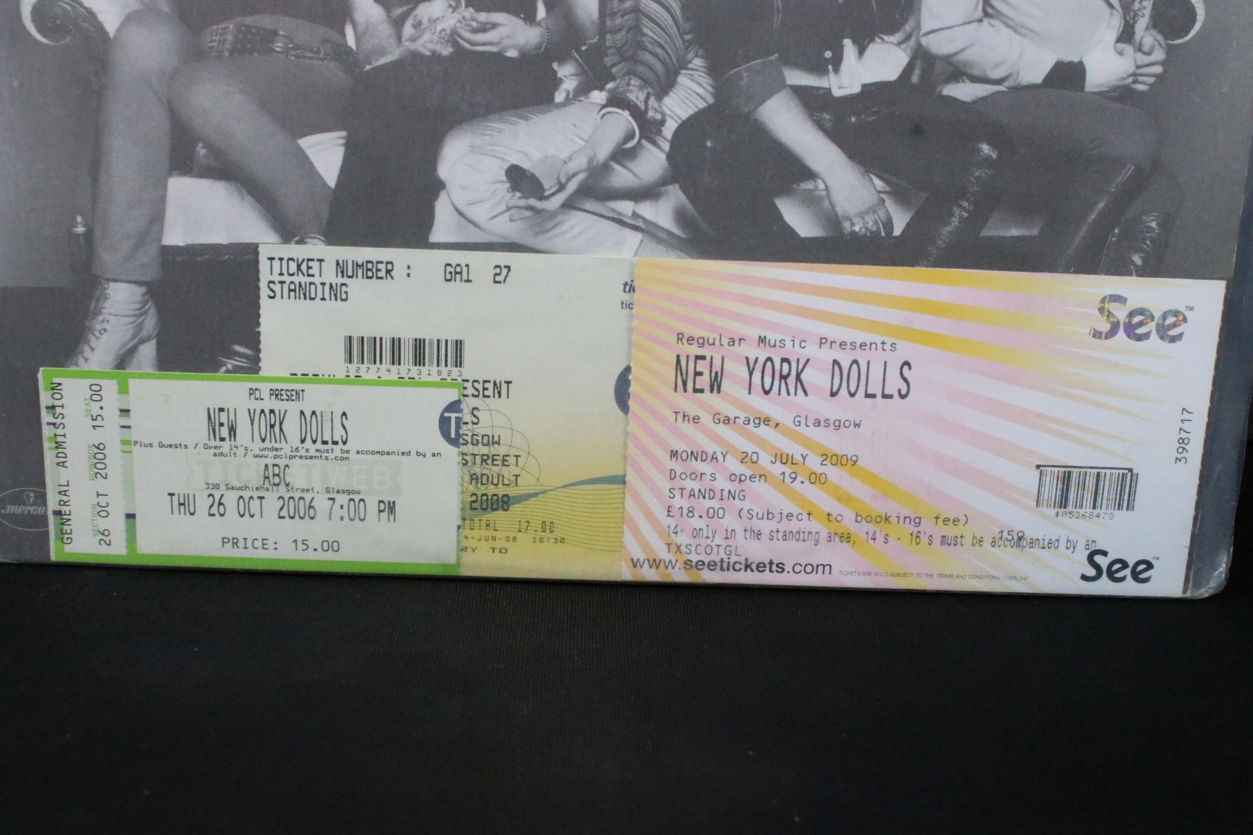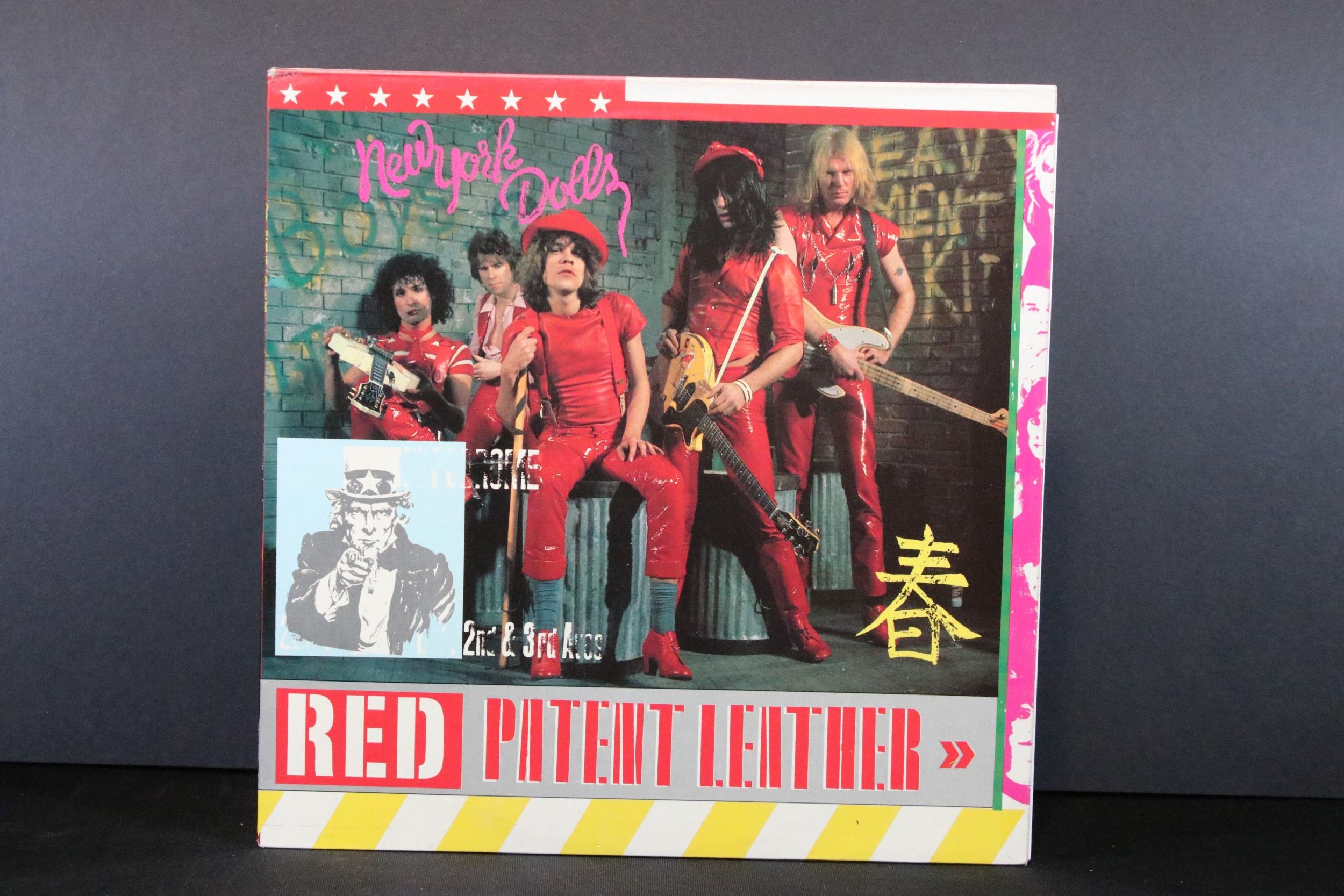 Vinyl - 6 The New York Dolls and members LPs, 1 7" and 3 UK ticket stubs from the 2000s to include Too Much Too Soon (Dutch pressing), self titled (Dutch pressing), Red Patent Leather (red vinyl French pressing) and three Johnny Thunders LPs, plus The Junkies Live NYC 1975 (7") Vg+ overall