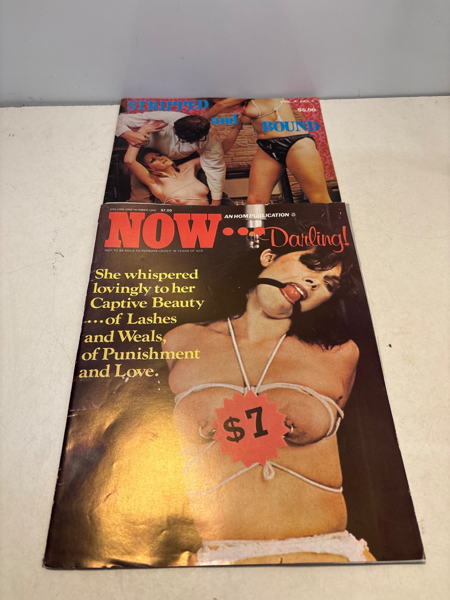 Two 1970s vintage adult magazines featuring themed covers, titles NOW and Bound.both volume 1 number 1