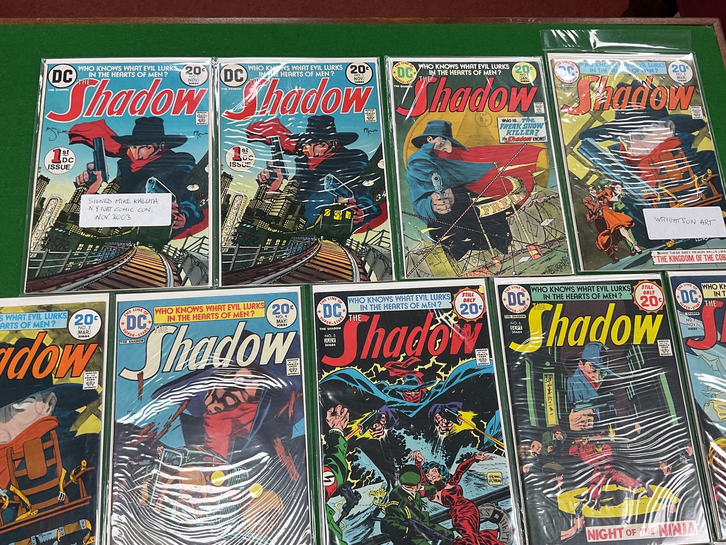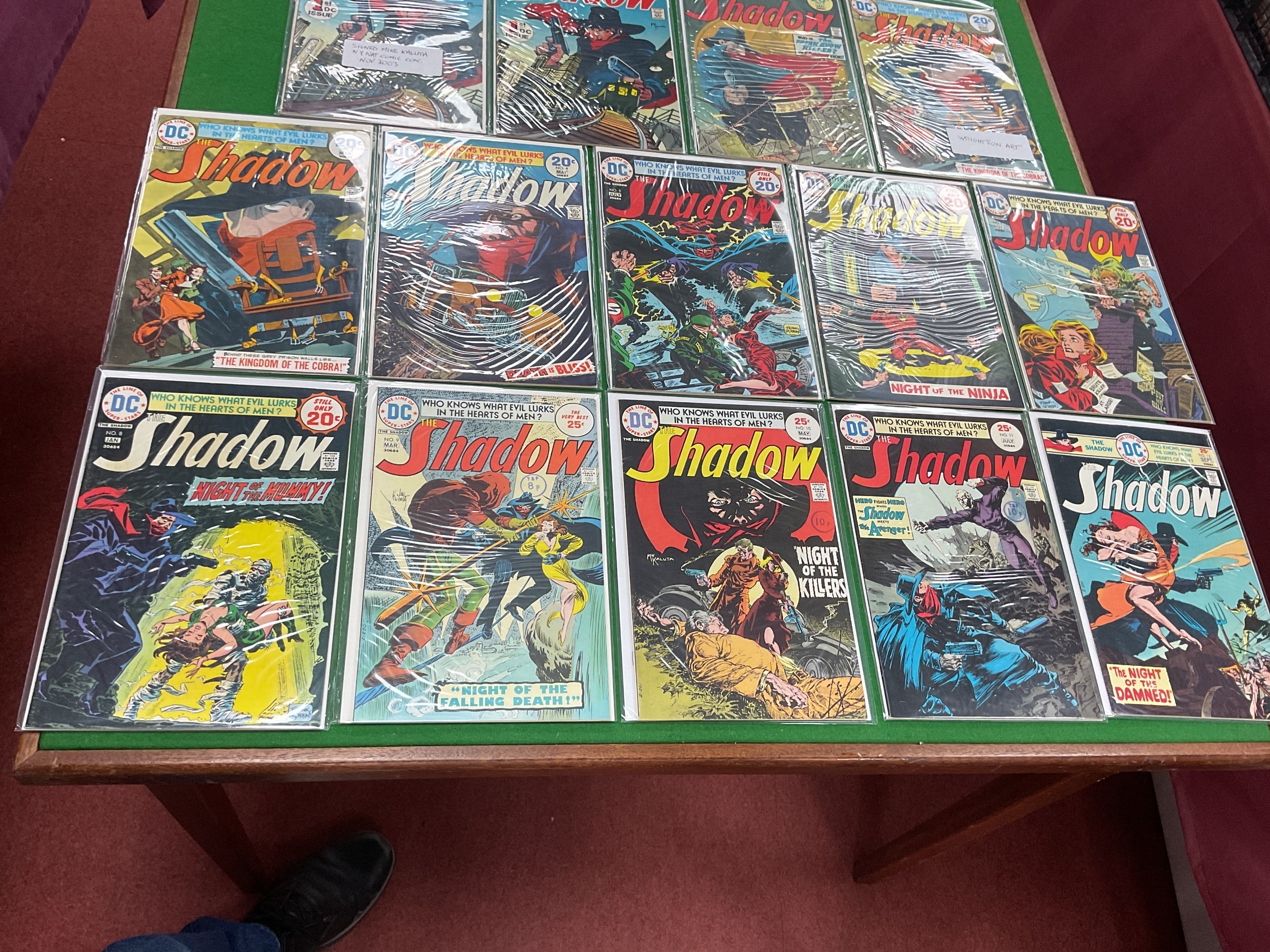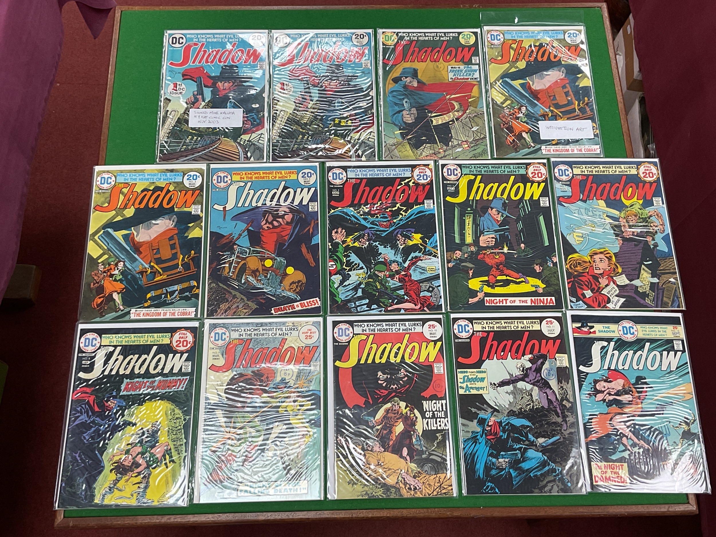 A complete run of The Shadow comics by DC. Comprising of issues #1 - #12. Which includes #1 signed Mike Kaluta to cover (unverified). Duplicate of #1 and #3 noted. Conditions of comics vary. Faults noted.