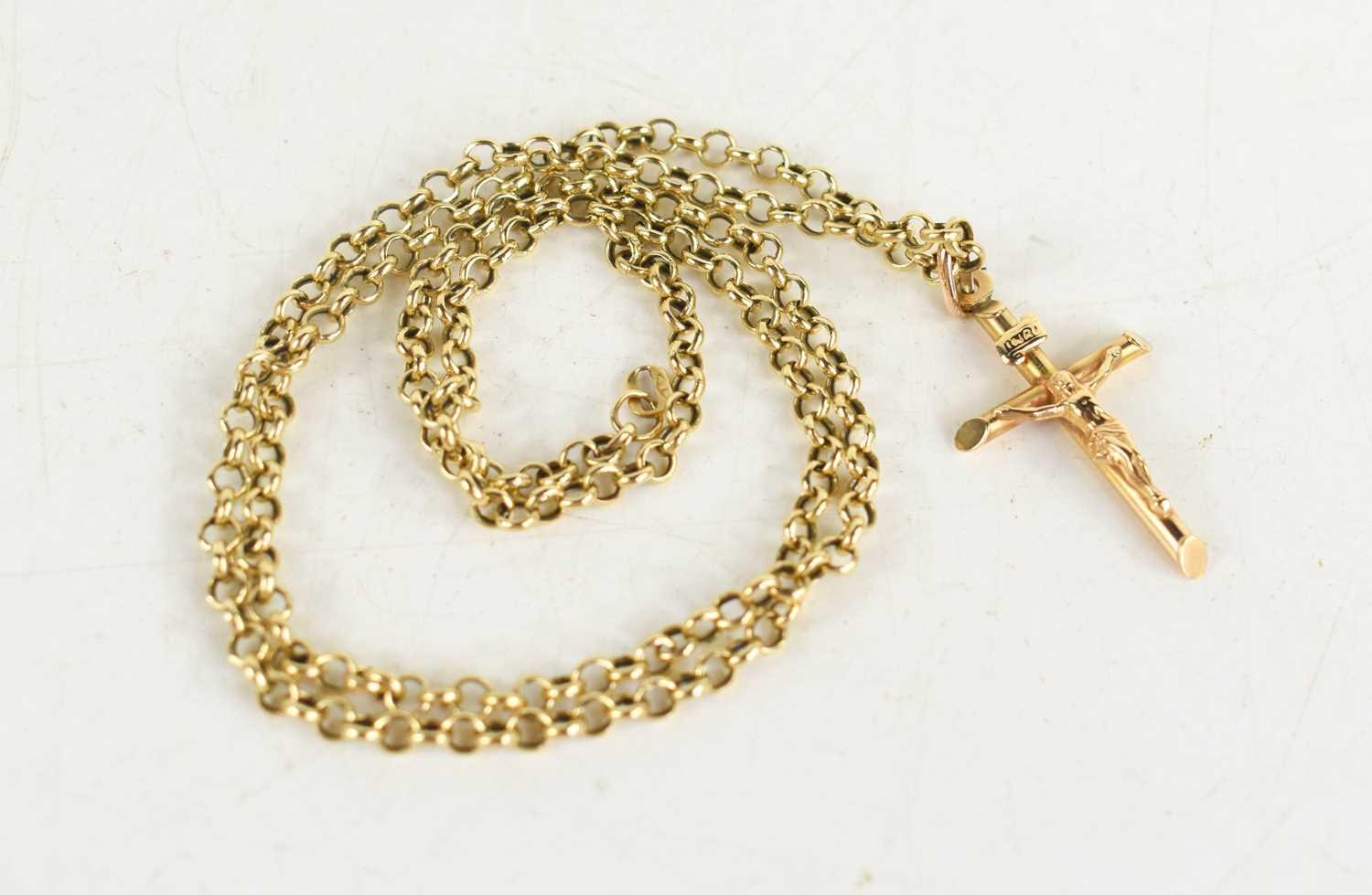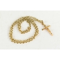 A 9ct gold crucifix with 9ct gold belcher chain, chain length 49cm long, a/f clasp missing, 4.5g.