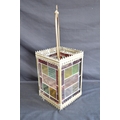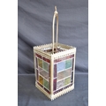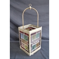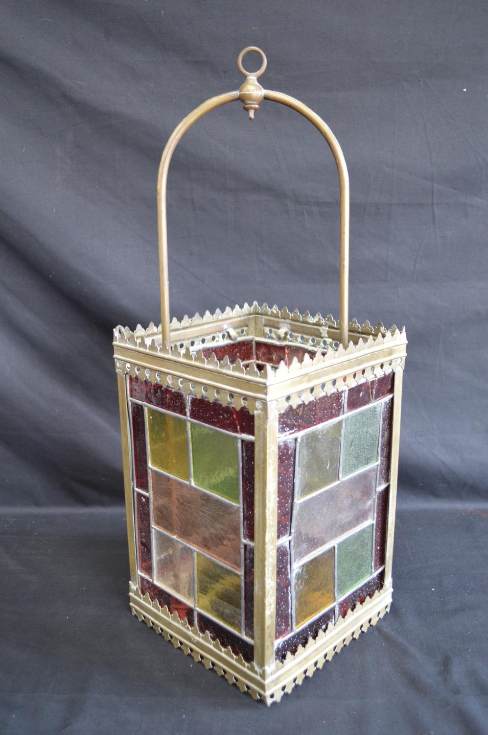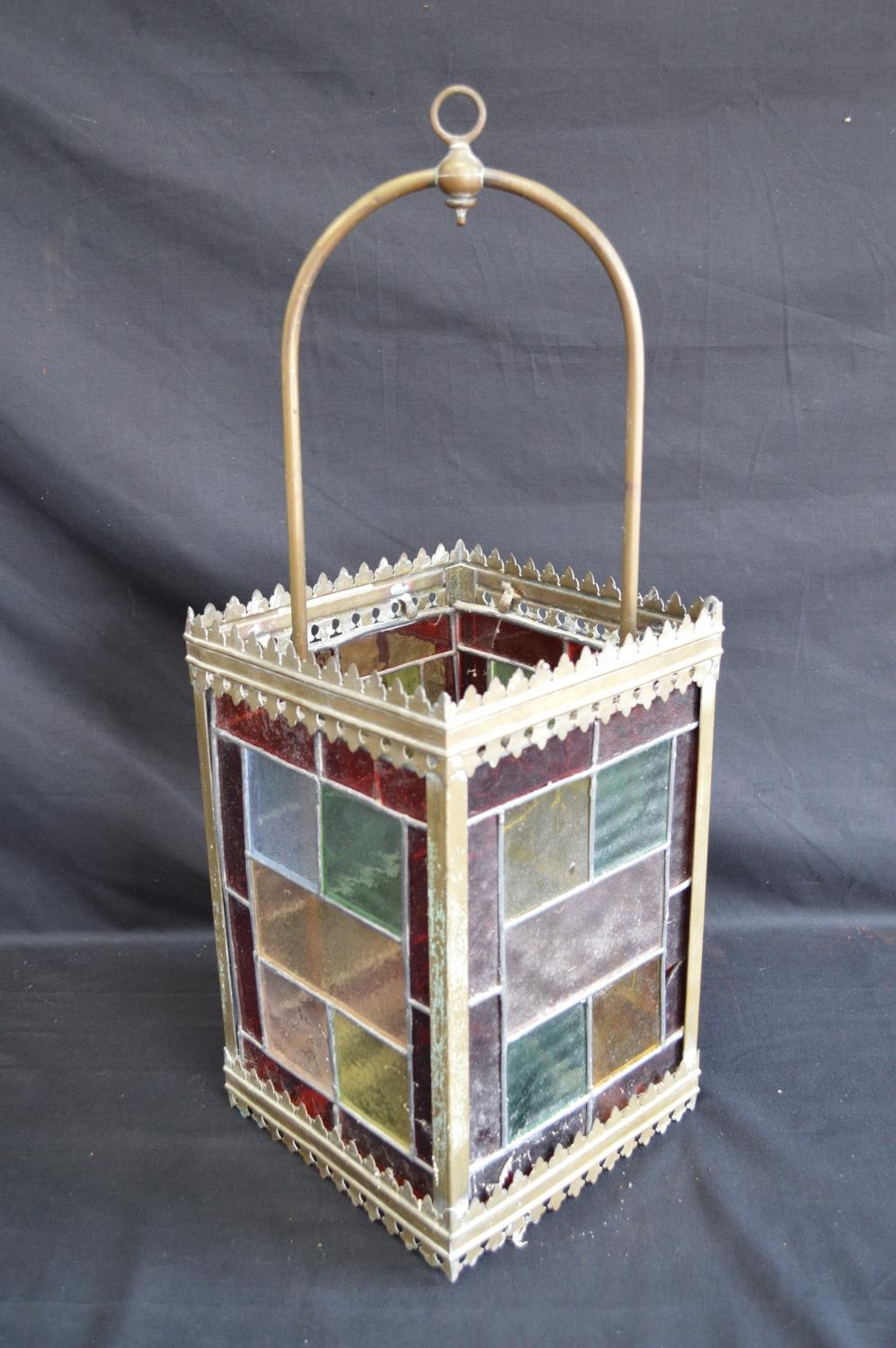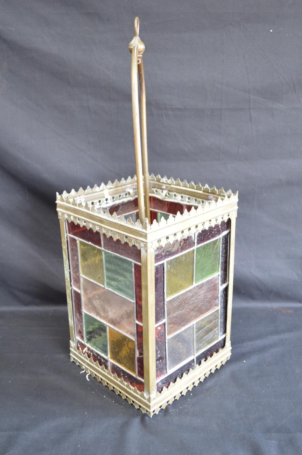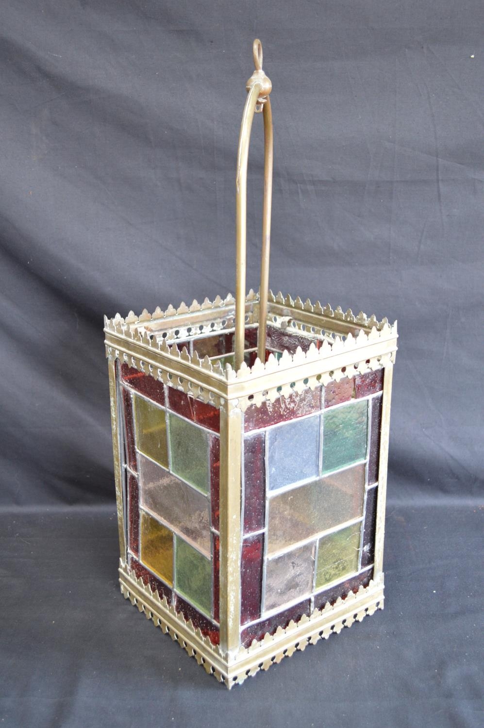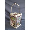 Brass framed lantern shade having four coloured lead light panels - 19.5cm x 19.5cm x 55cm tall