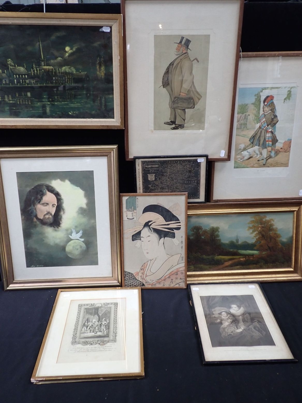 A JAPANESE PRINT OF A WOMAN, AND OTHER FRAMED PICTURES AND PRINTS including Guy Fawkes siezed by Knevet, a Vanity Fair print; 'Stuffy' and others