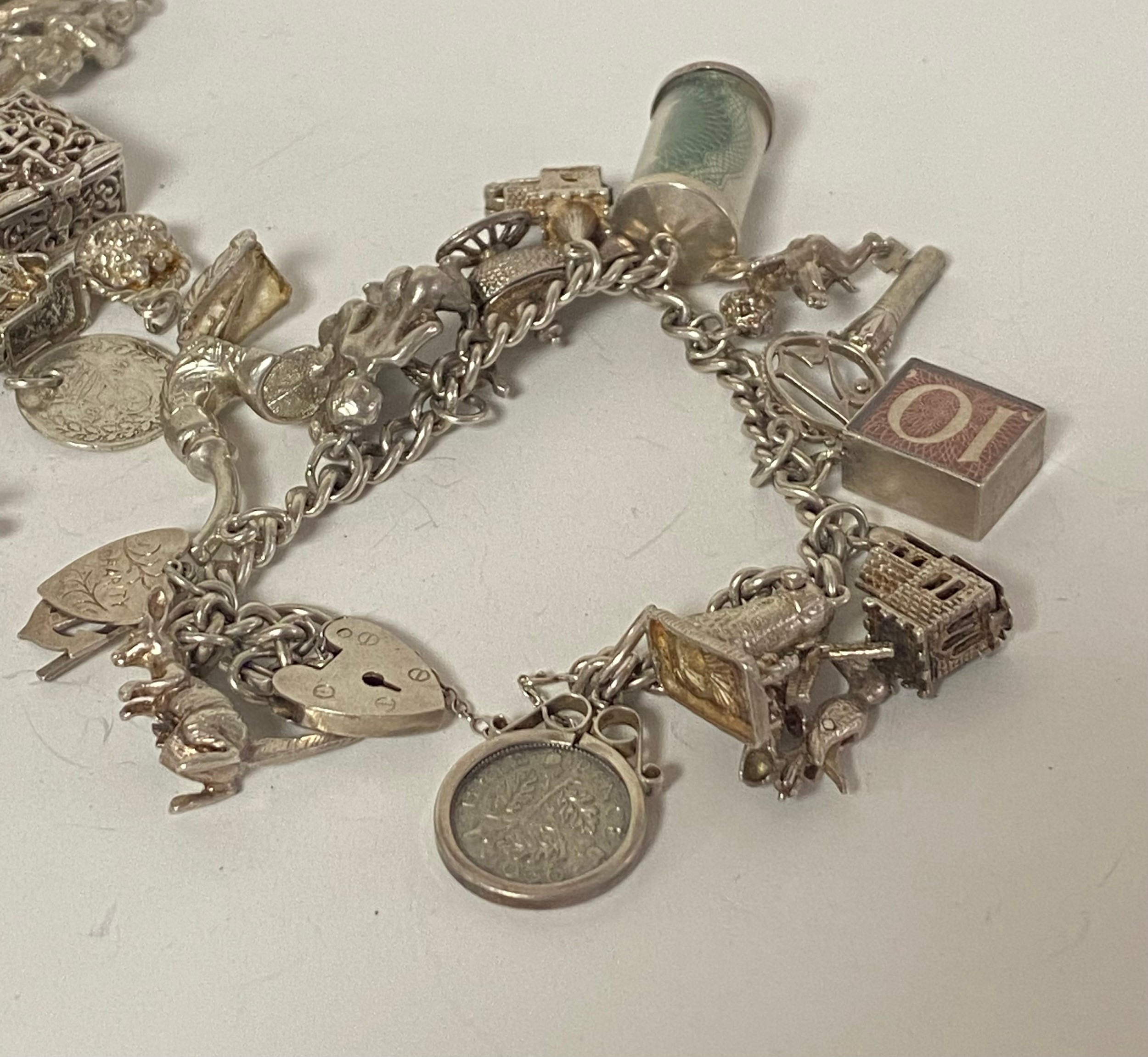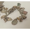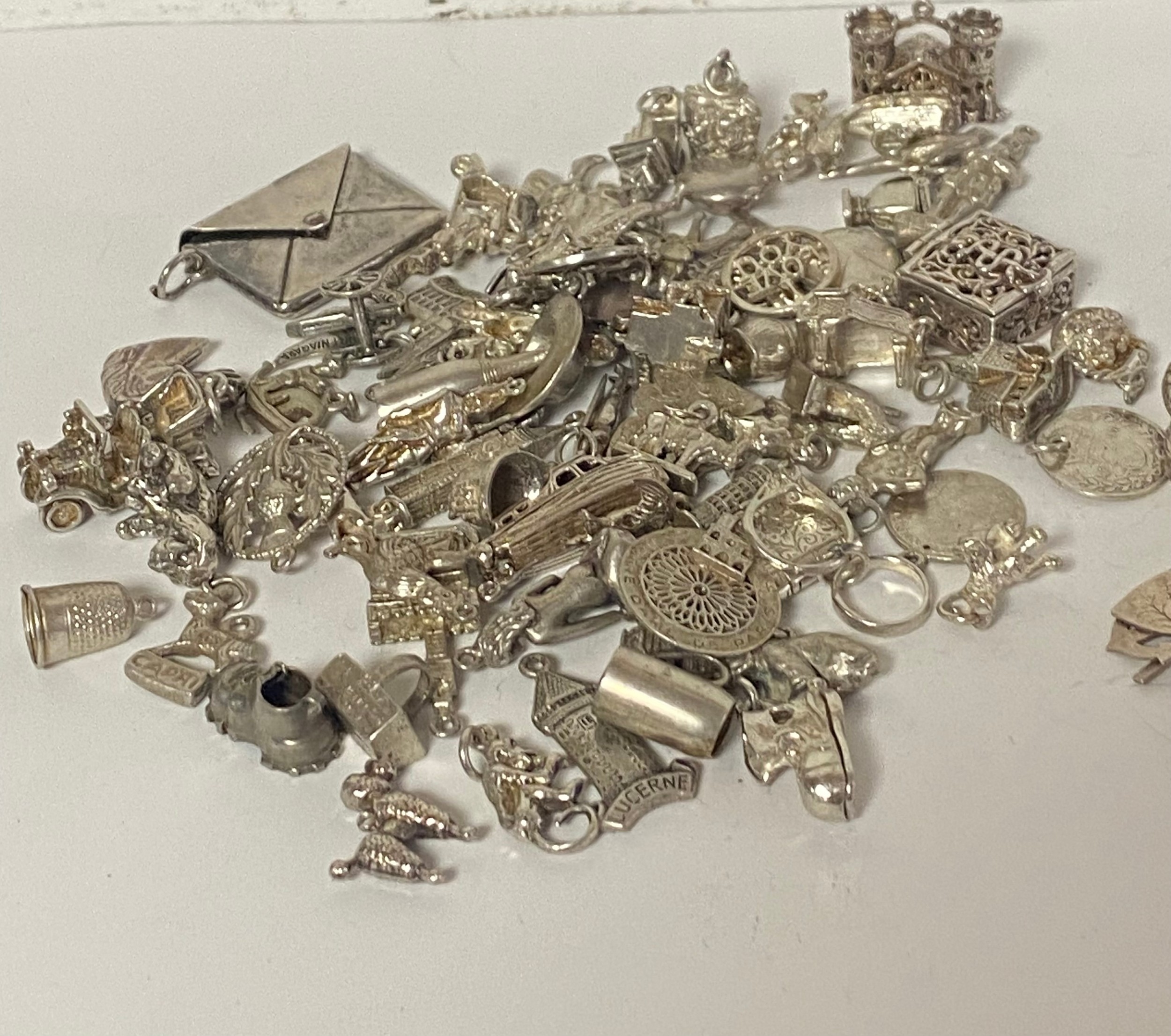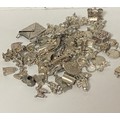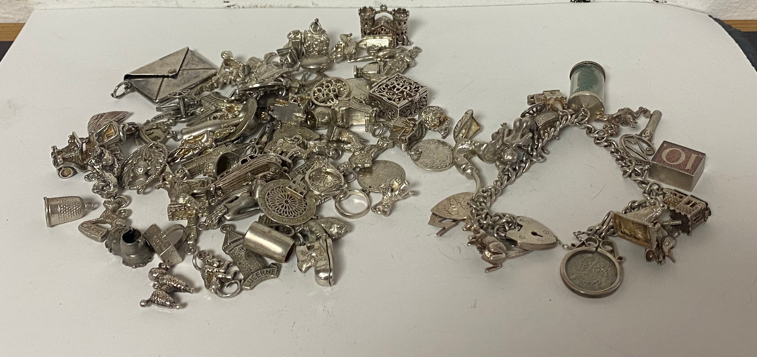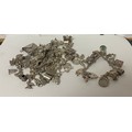 A silver charm bracelet, suspending and assortment of charms and a large quantity of loose silver charms -