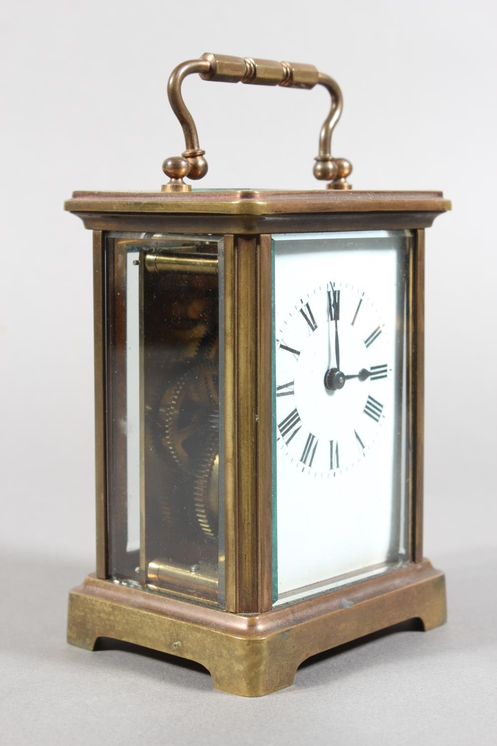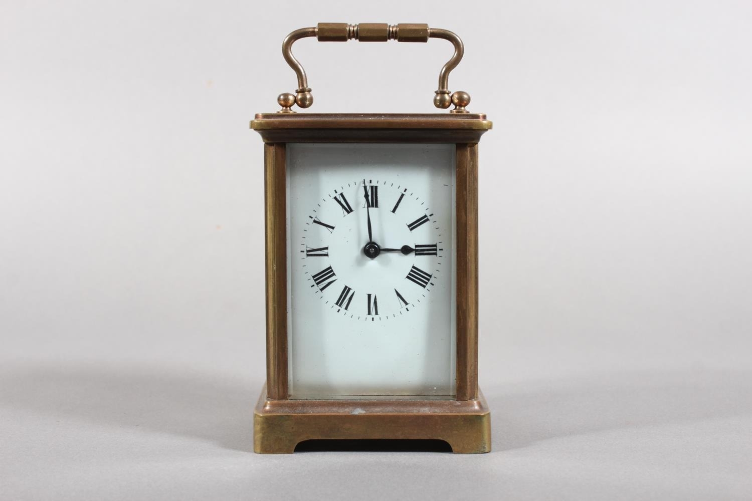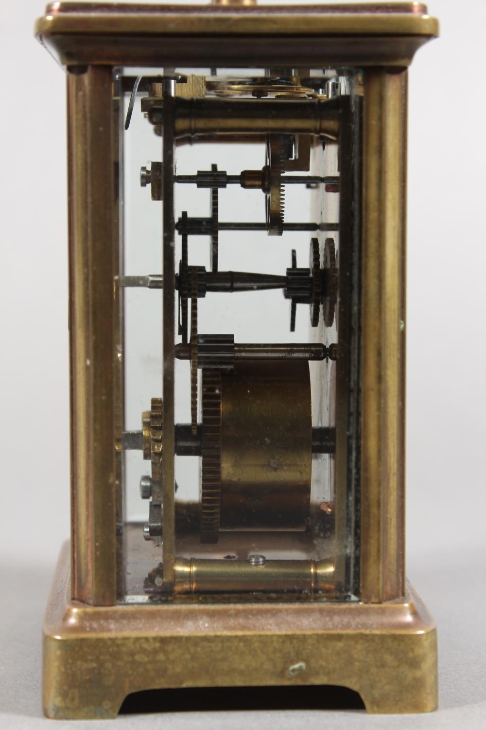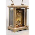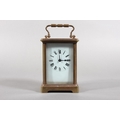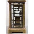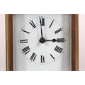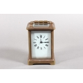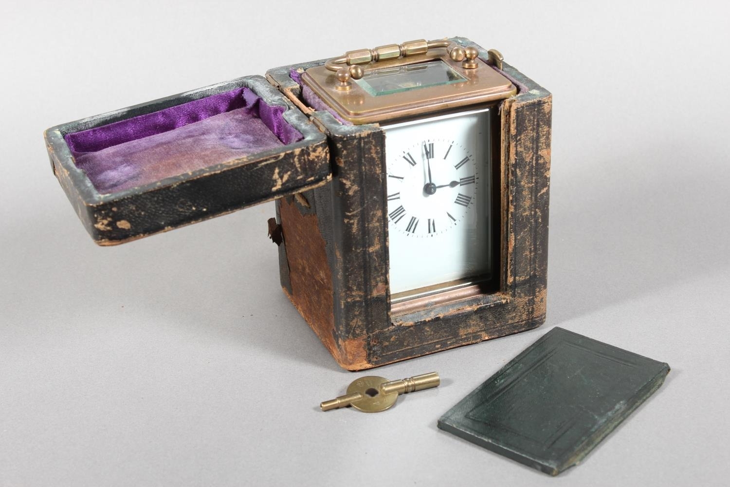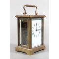 Brass and four glass cased carriage clock with white enamel dial, in fitted leather case.