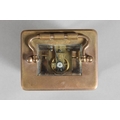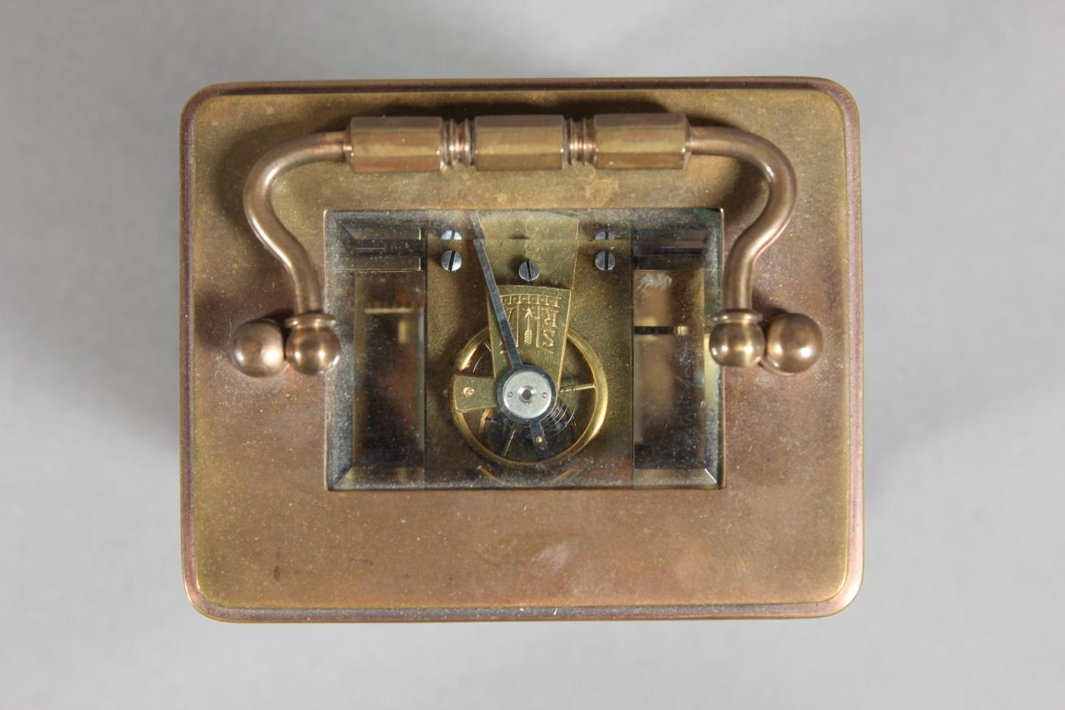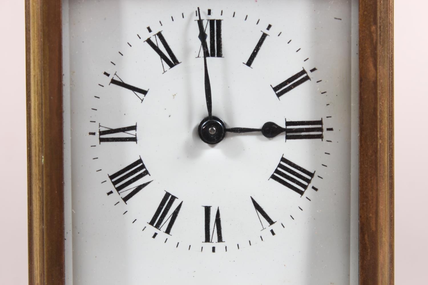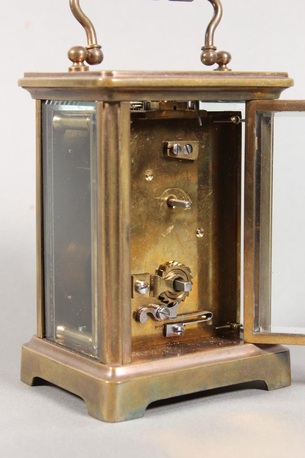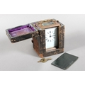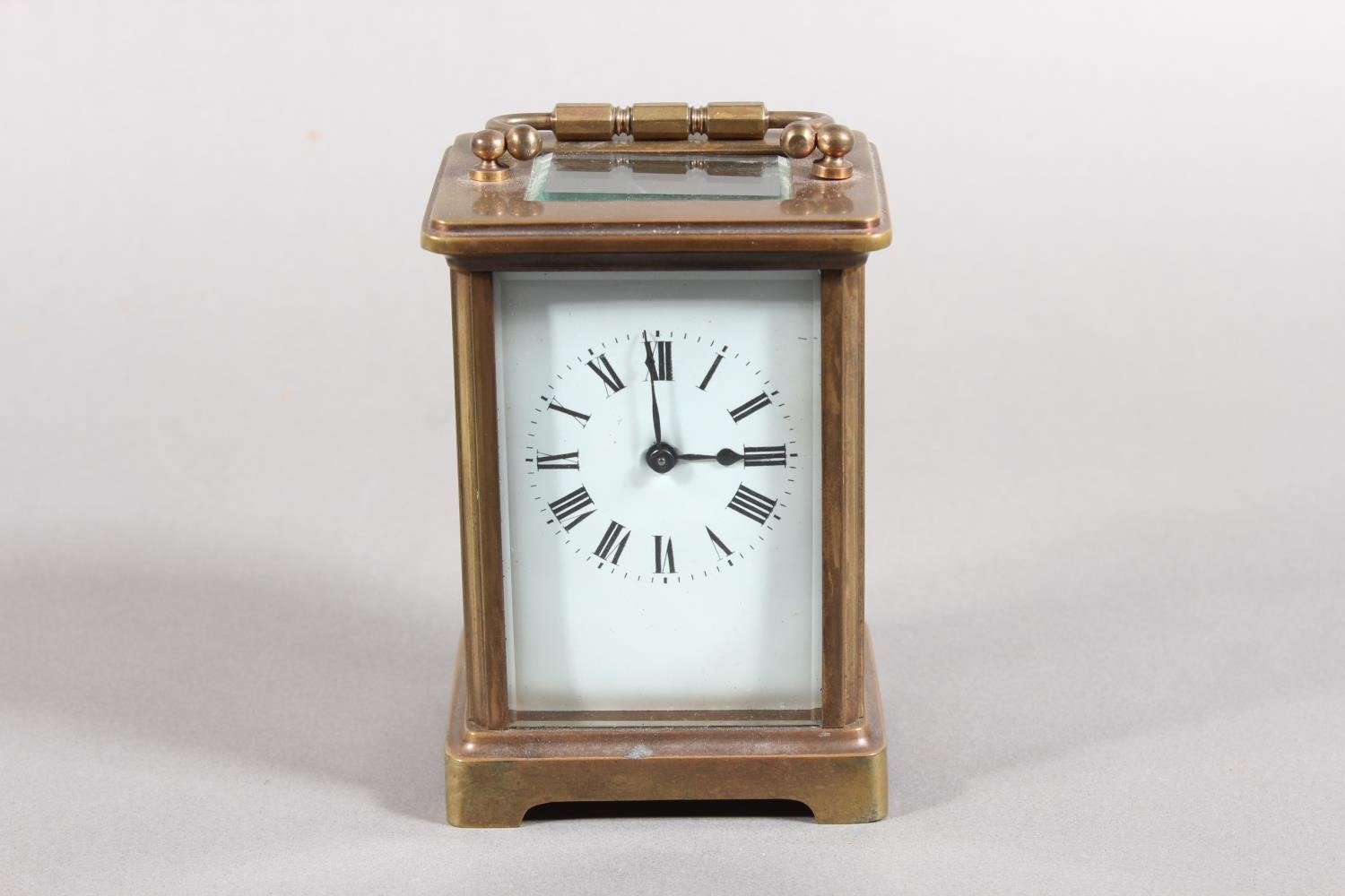 Brass and four glass cased carriage clock with white enamel dial, in fitted leather case.