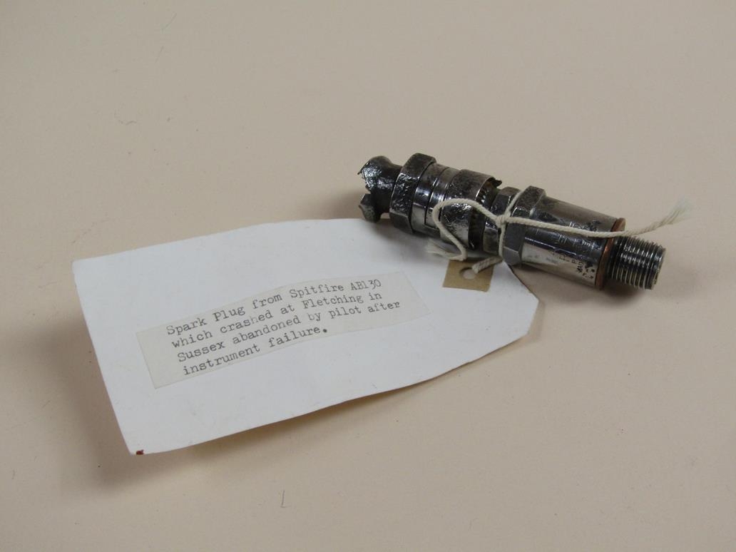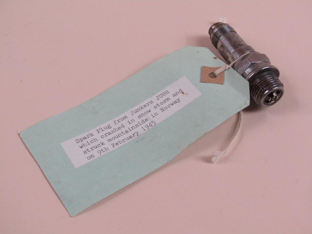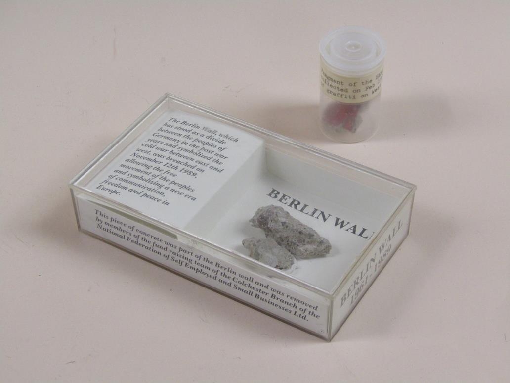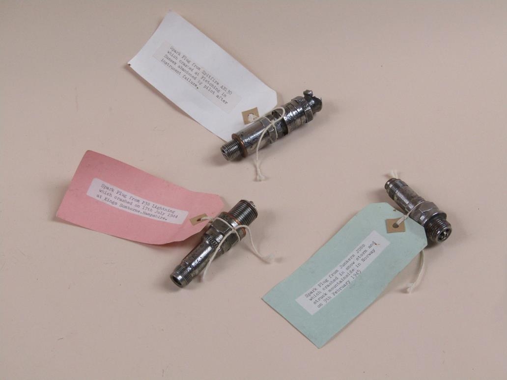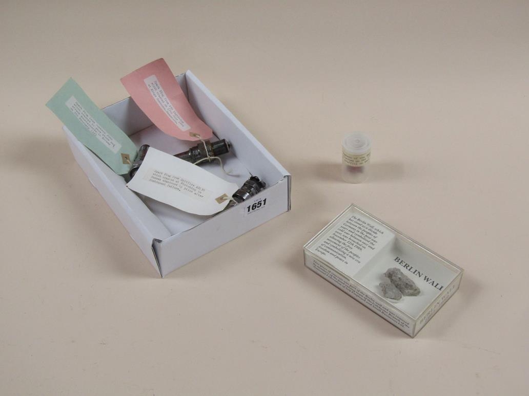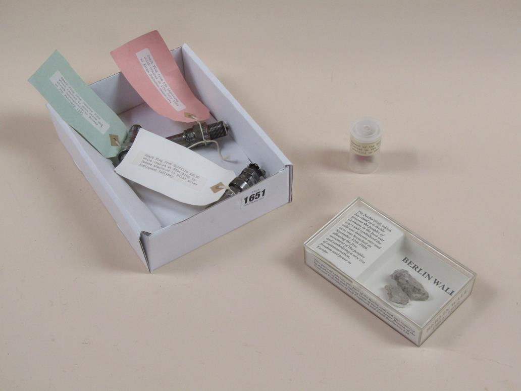 SMALL FRAGMENT OF BERLIN WALL; SPARK PLUGS FROM SPITFIRE, P38 & JUNKERS JU88