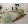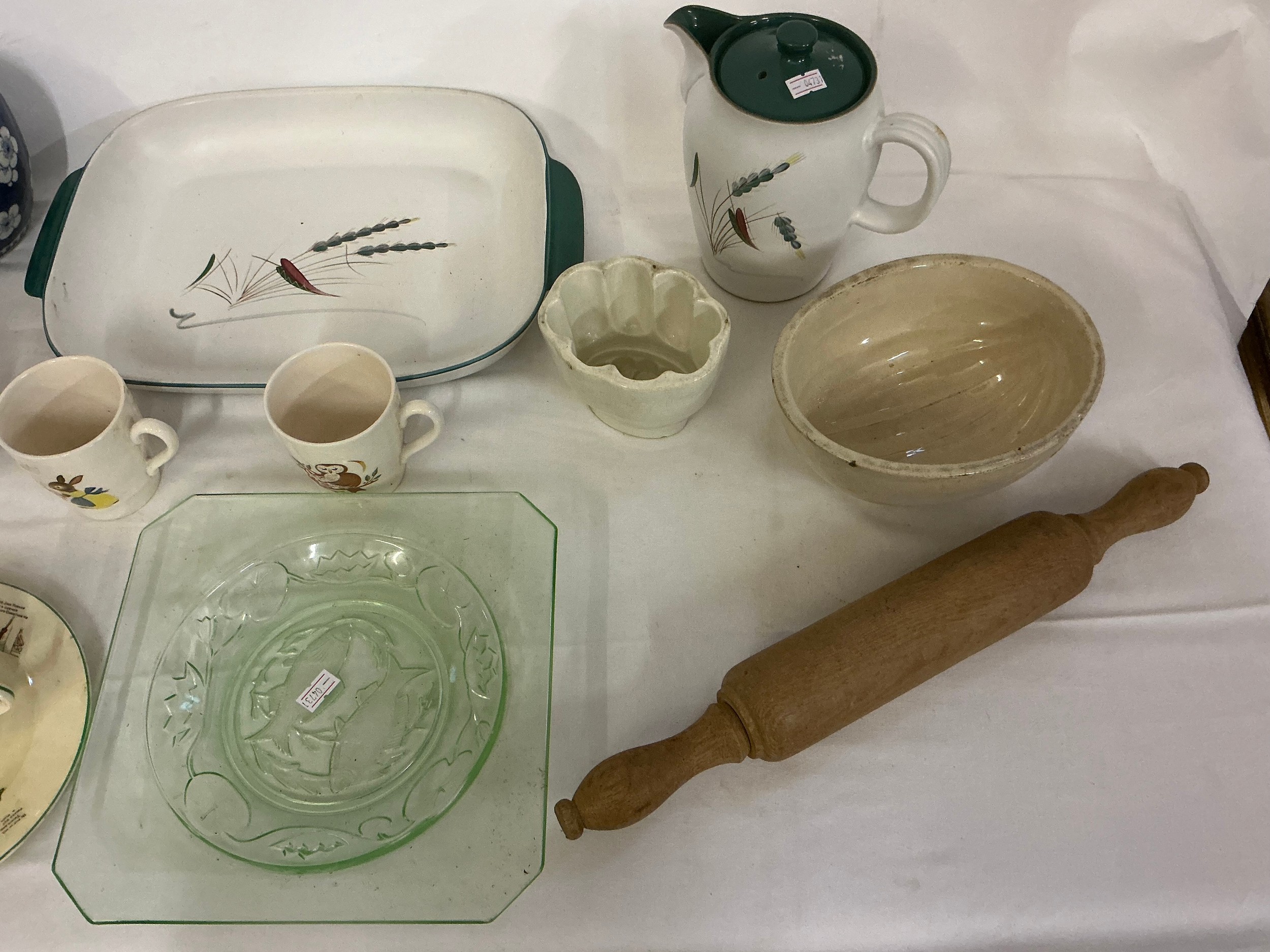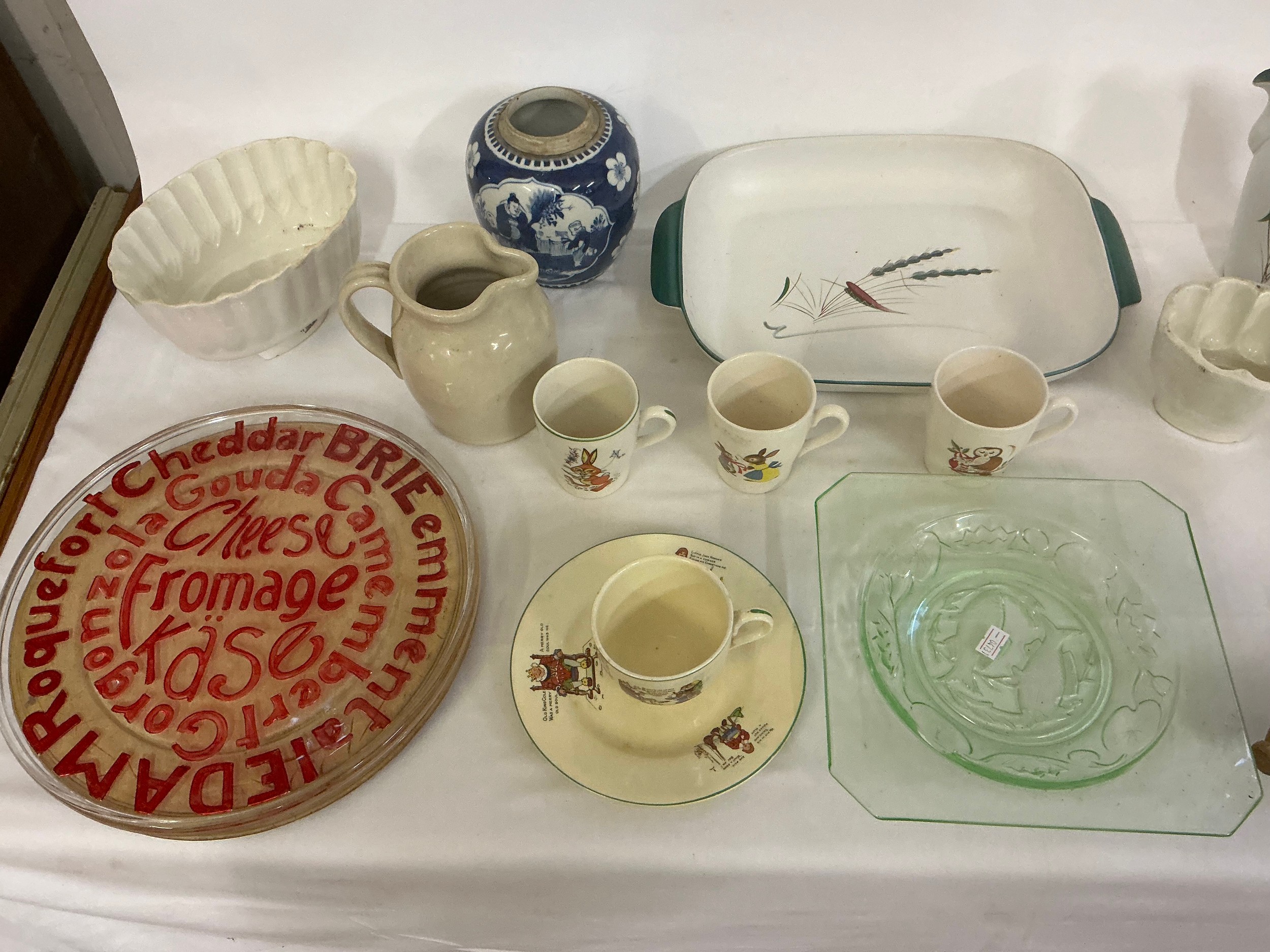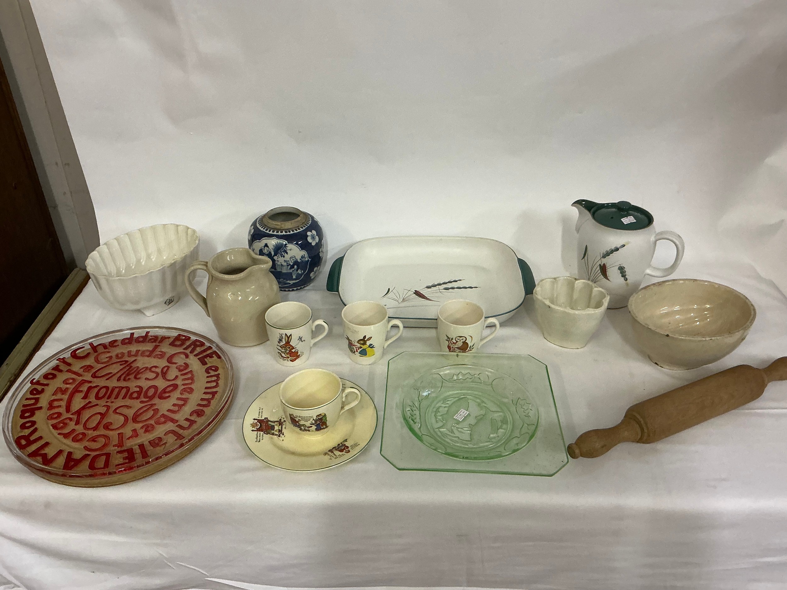 A Collection to include three Vintage Jelly Moulds, Denby Coffee Pot & Tray, Cheese Glass Tray & Board, Rolling Pin, Ridgway Nursey Rhyme Plate, etc.
