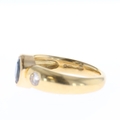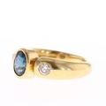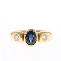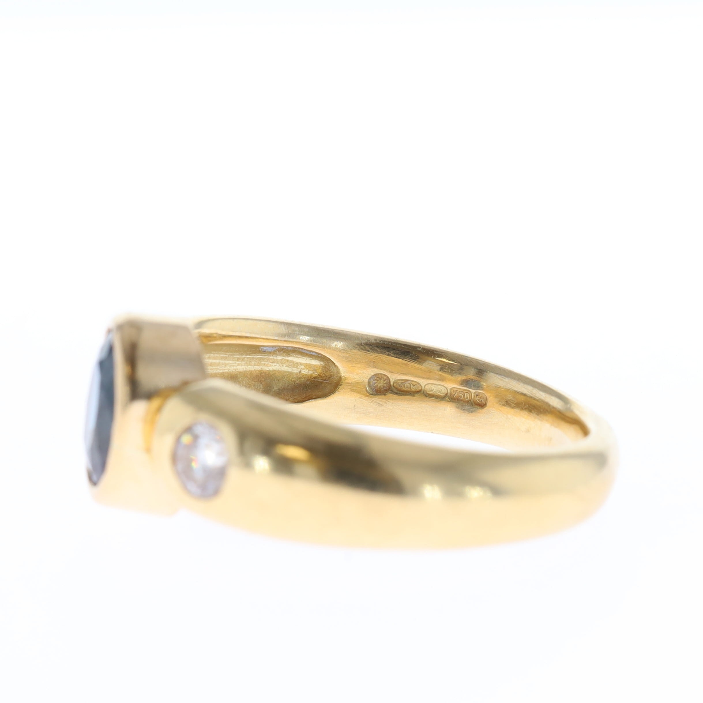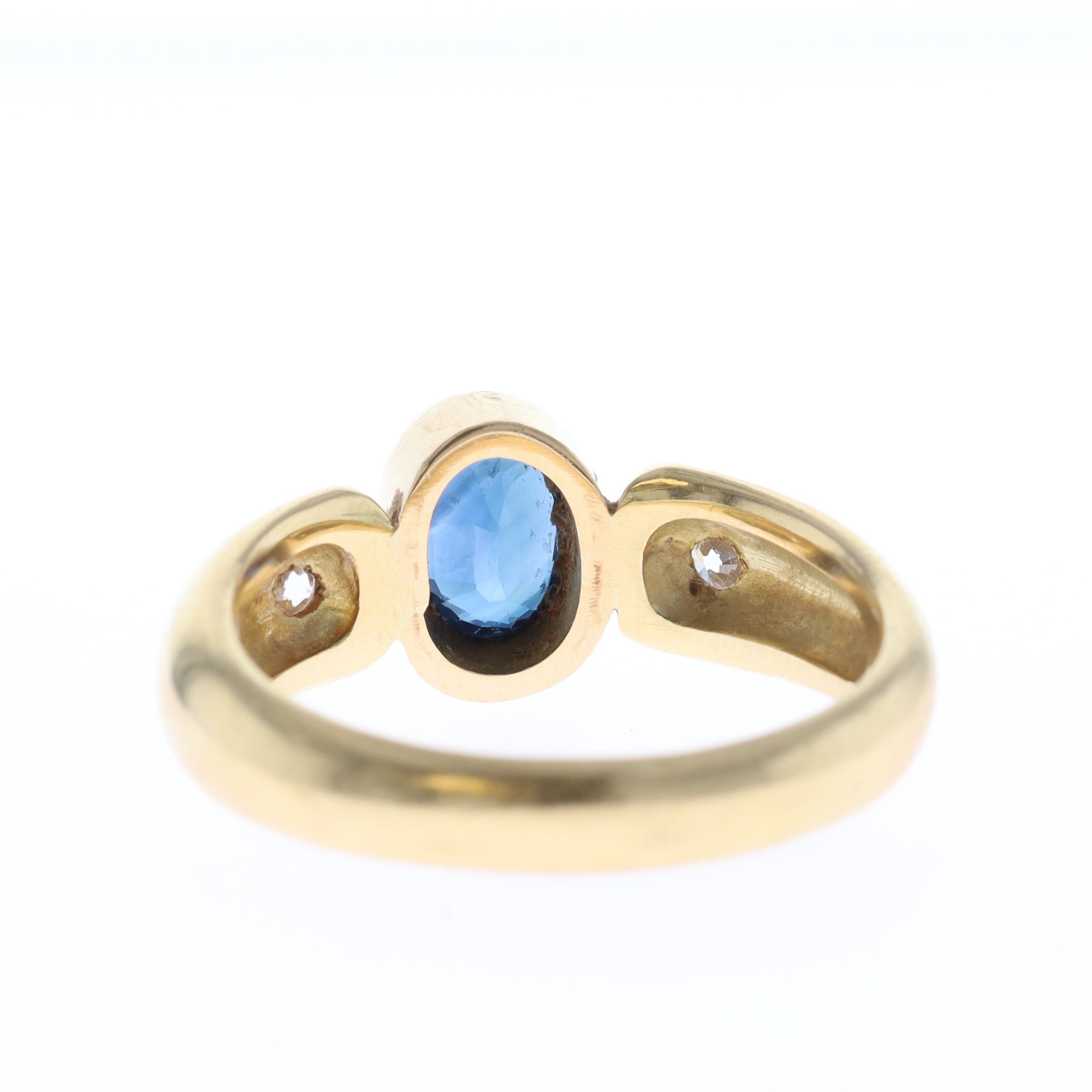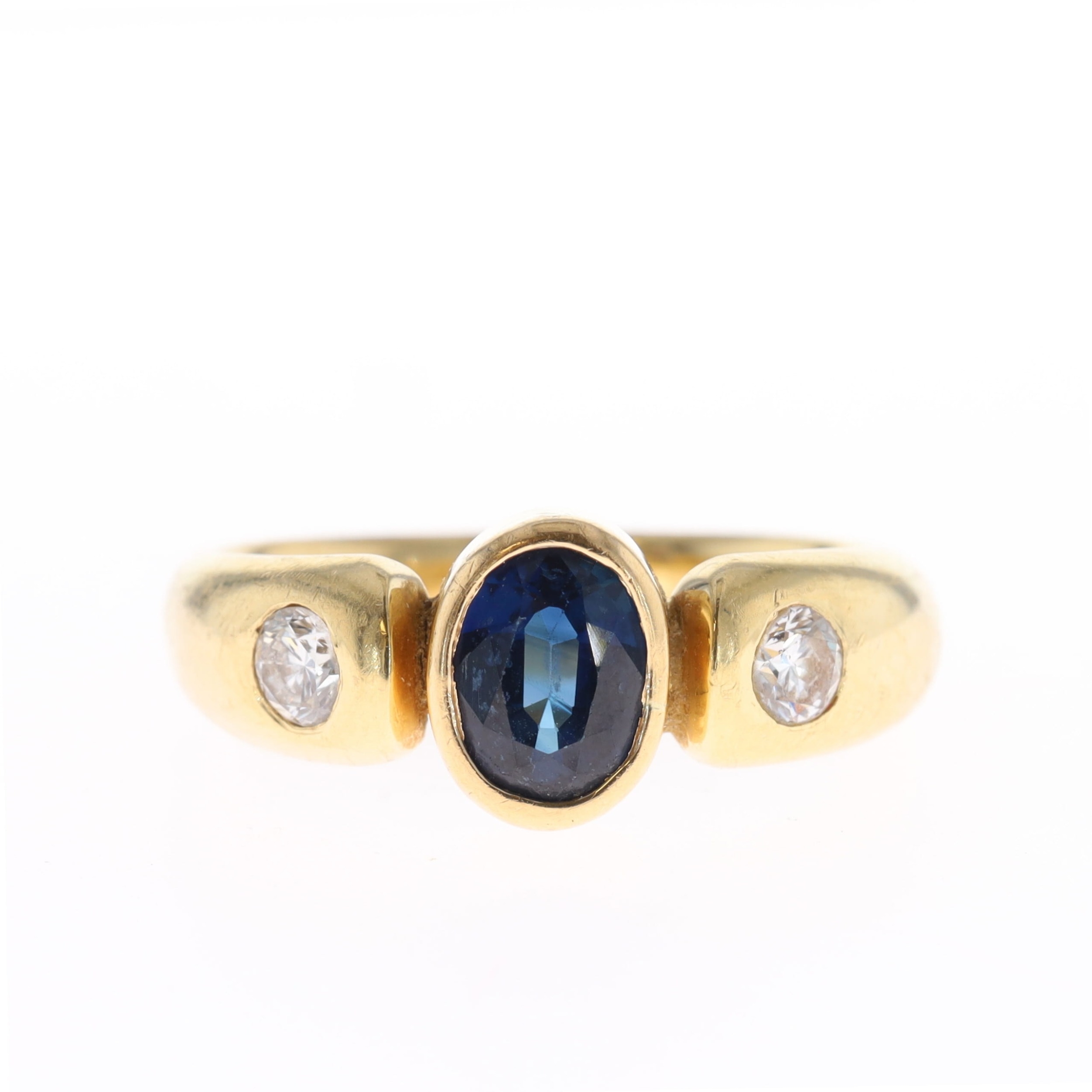 Sapphire and Diamond 18ct Gold Dress Ring. Oval cut central Sapphire and round cut Diamonds on the shoulders. This ring is fully hallmarked on the inside of the band. Some scuffs to the base of the band, stones are secure and intact, minimal wear to facet edges. UK ring size R. Weighs in total 9.1g.