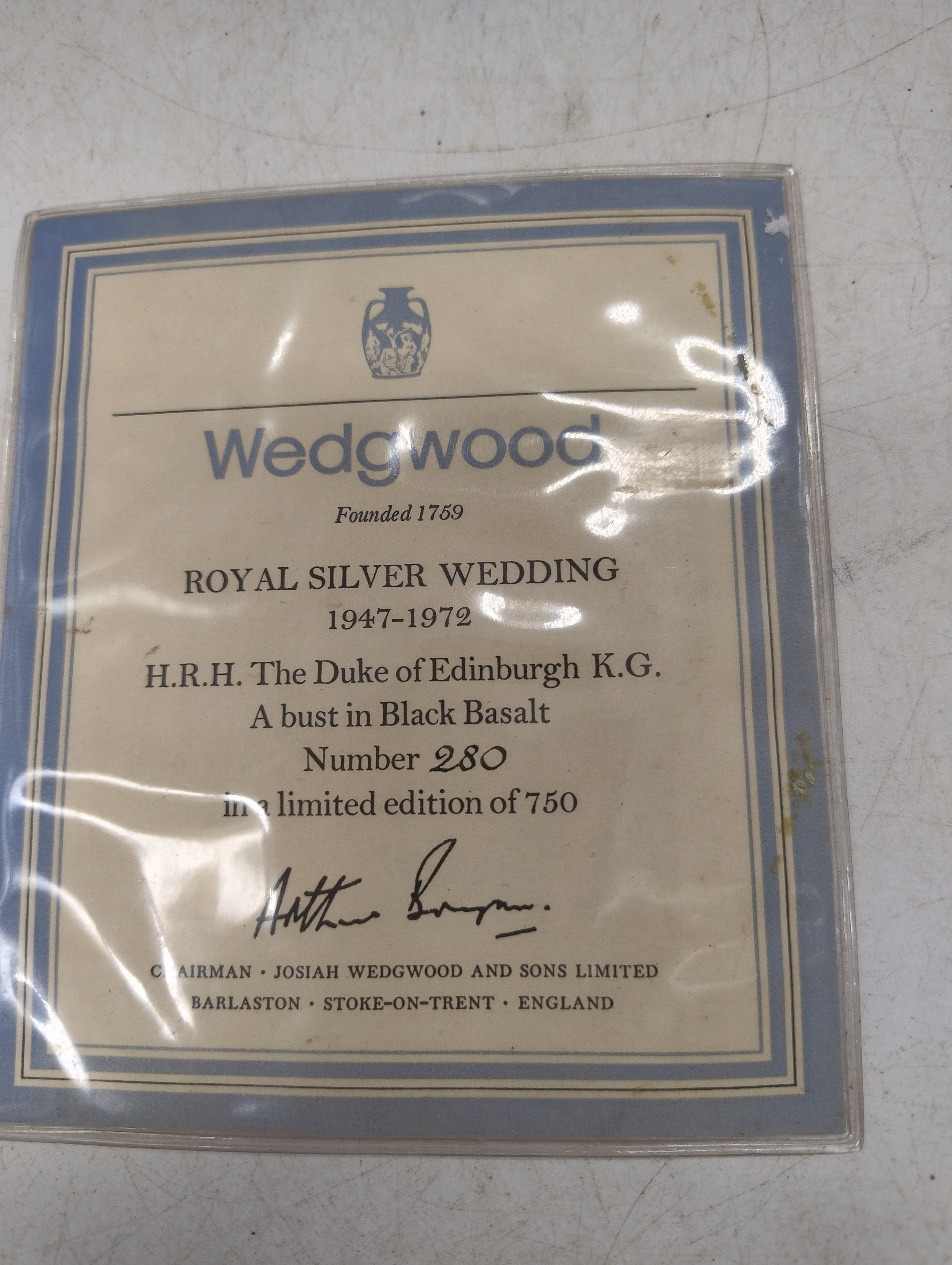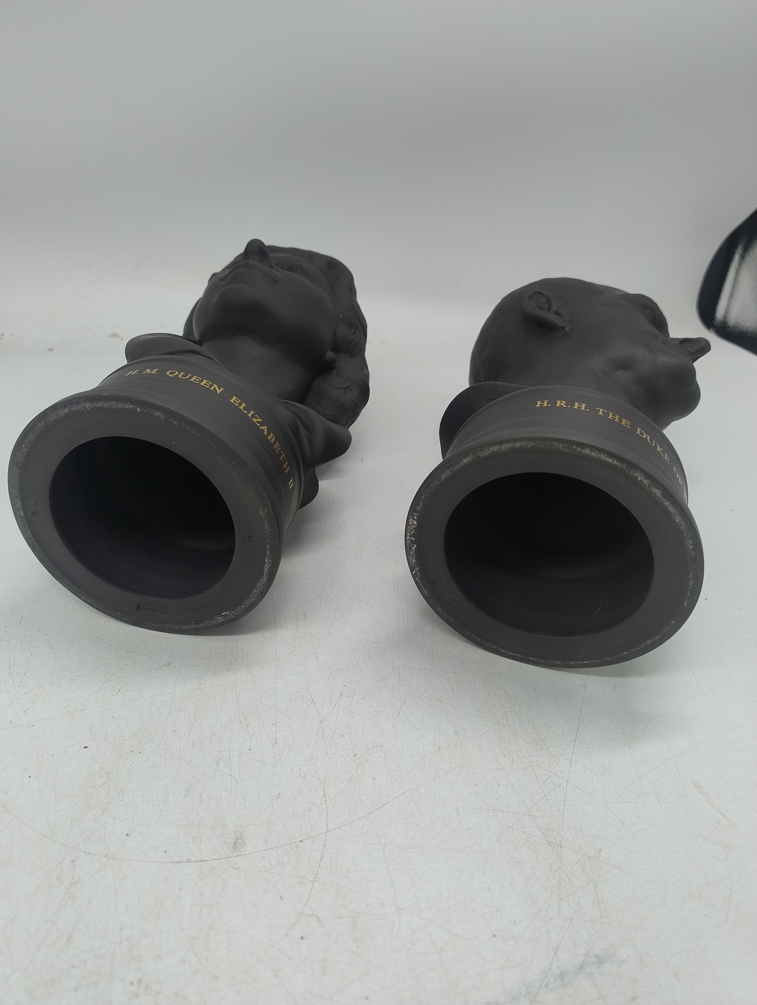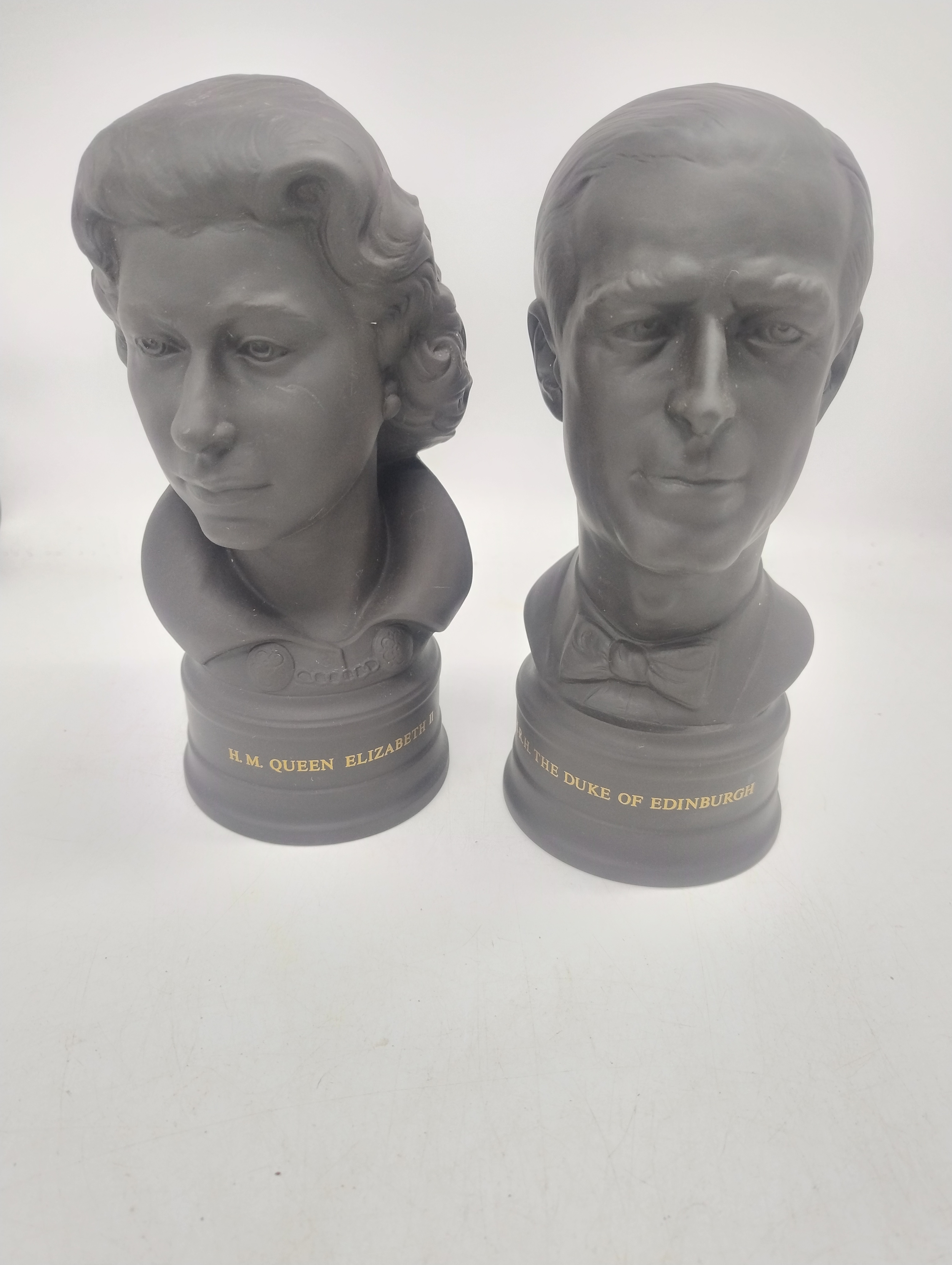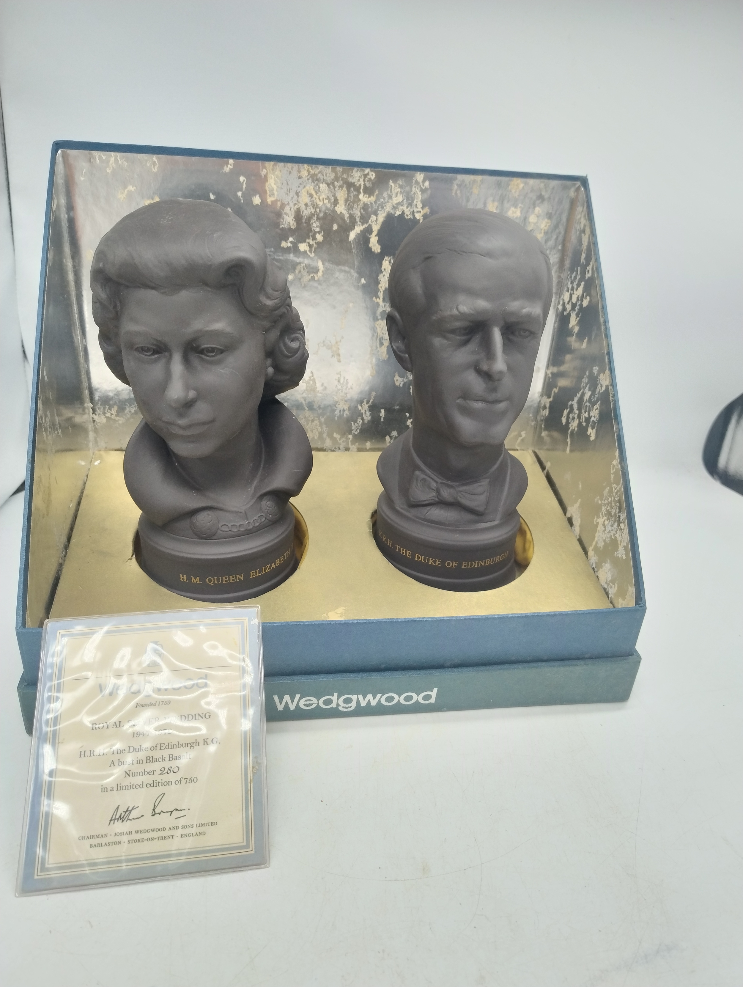 Boxed pair of Wedgewood black basalt busts, celebrating the Royal Silver Wedding 1947-1972, busts of the late Queen Elizabeth II and the late Duke of Edinburgh in original box with limited edition certificate, Nr.280/750, 23cm height