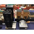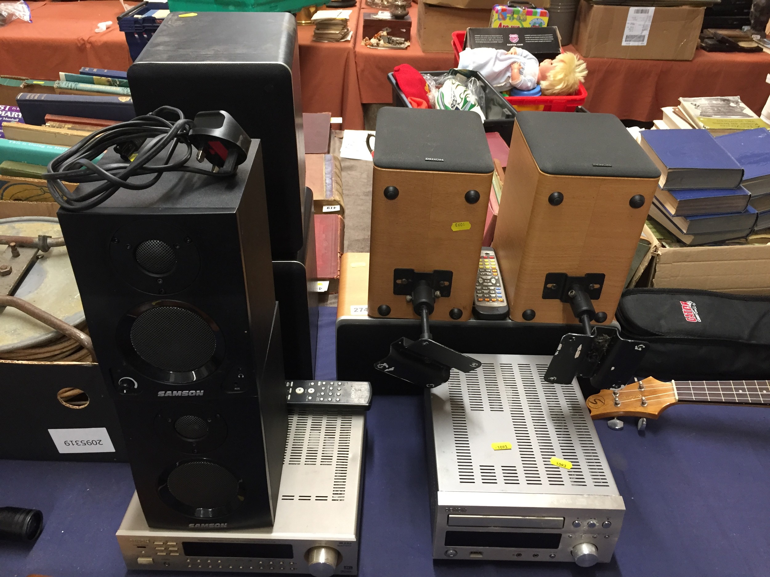 2 PAIRS OF DENON SPEAKERS, DENON AV SURROUND RECEIVER AVR-F100, DENON RCD-M37DAB PAIR OF SAMSON SPEAKERS AND ACCOUSTICS SPEAKER