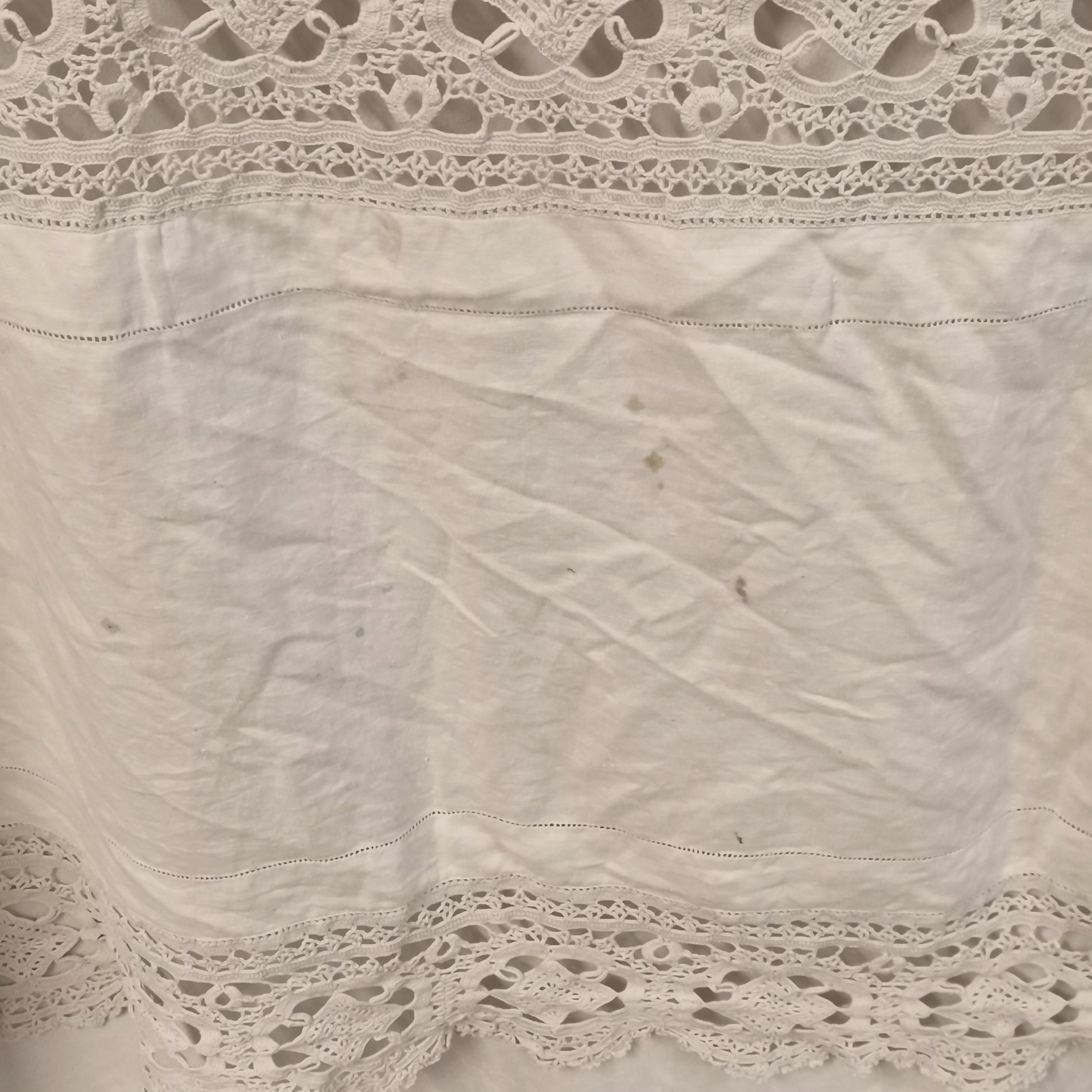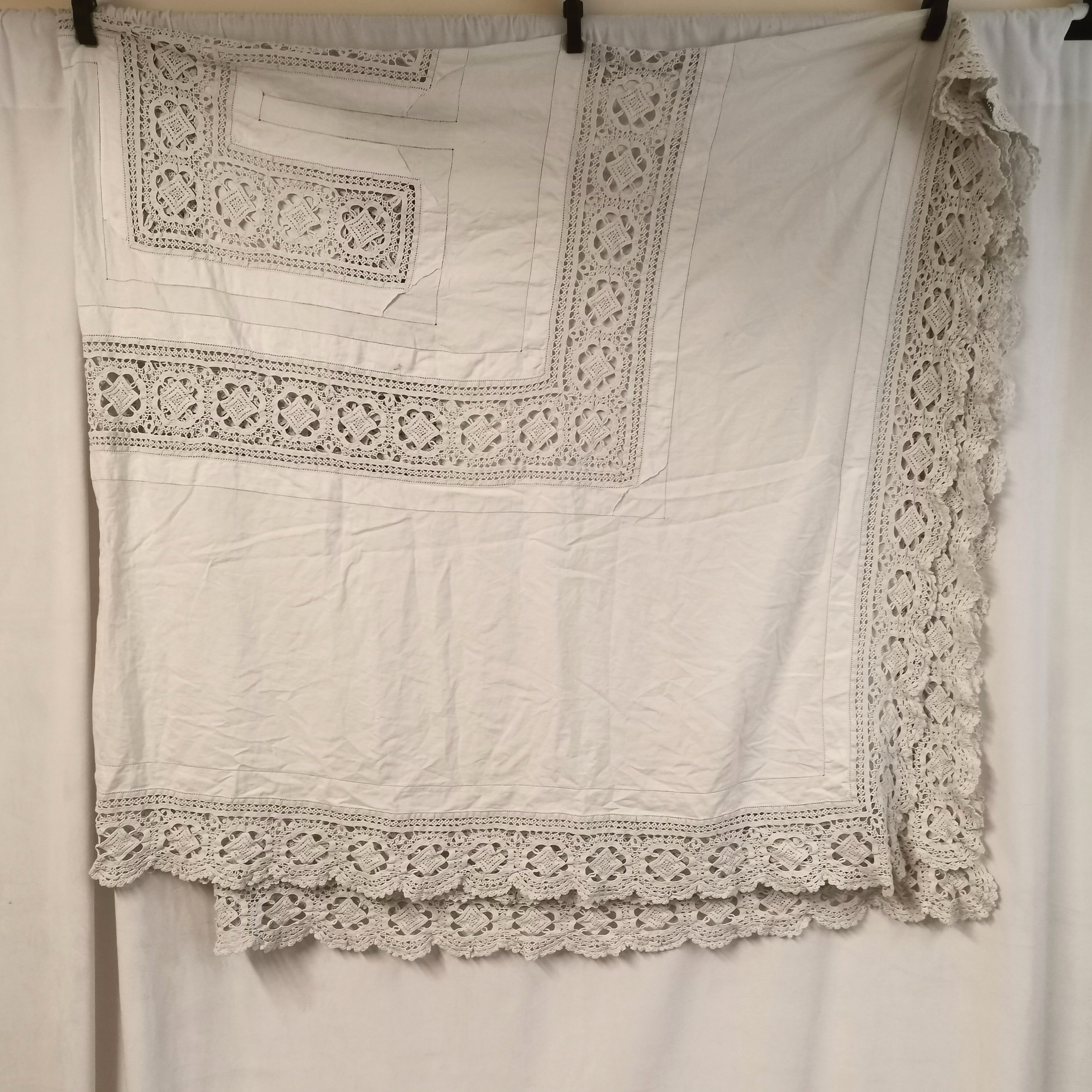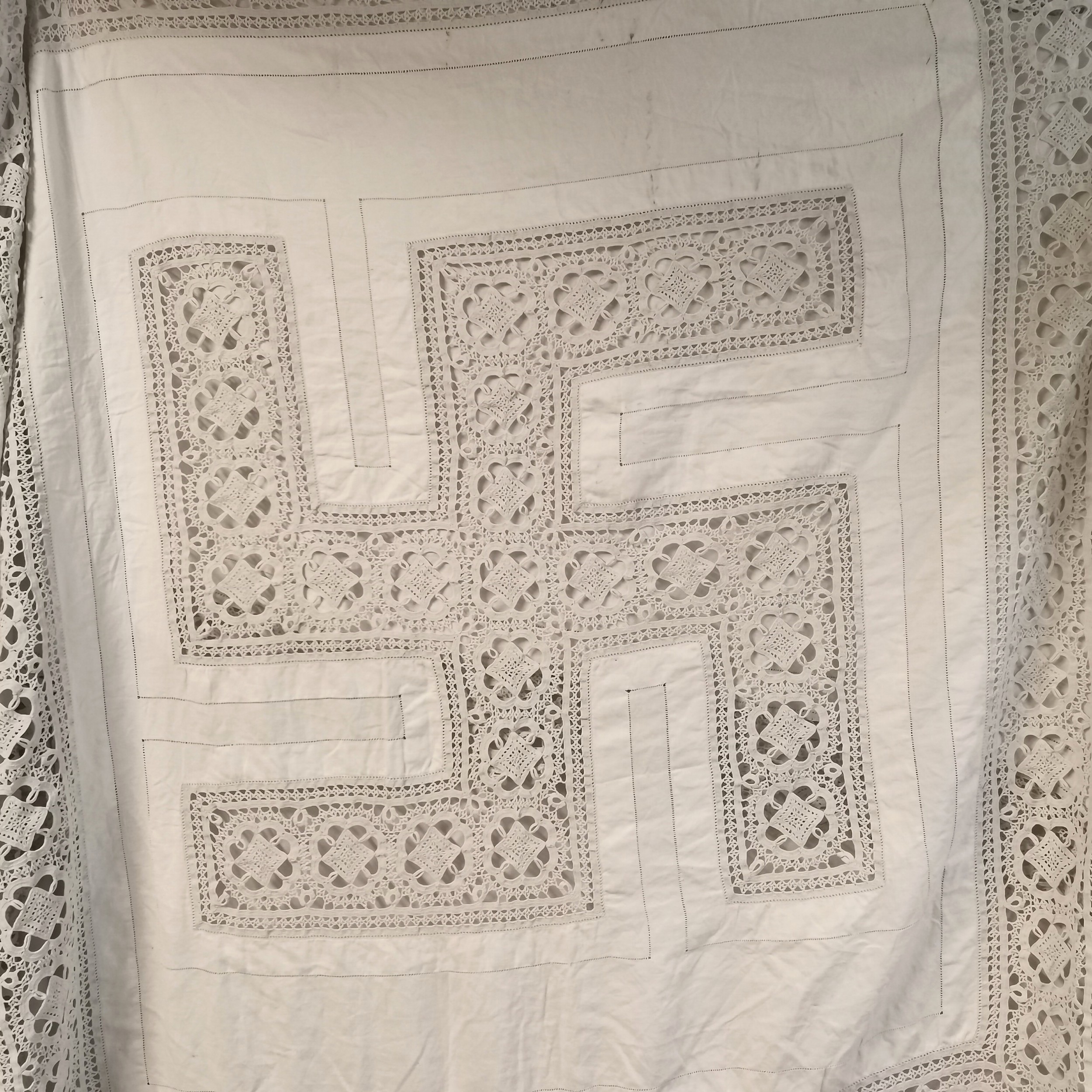 Vintage large linen table cover with crochet border & swastika detail to centre - 260cm square and has some marks