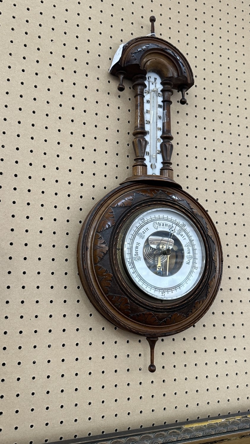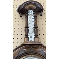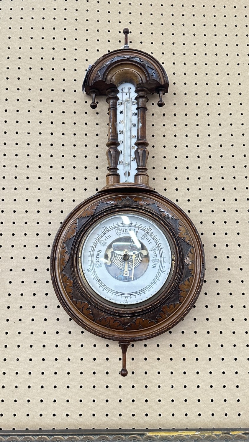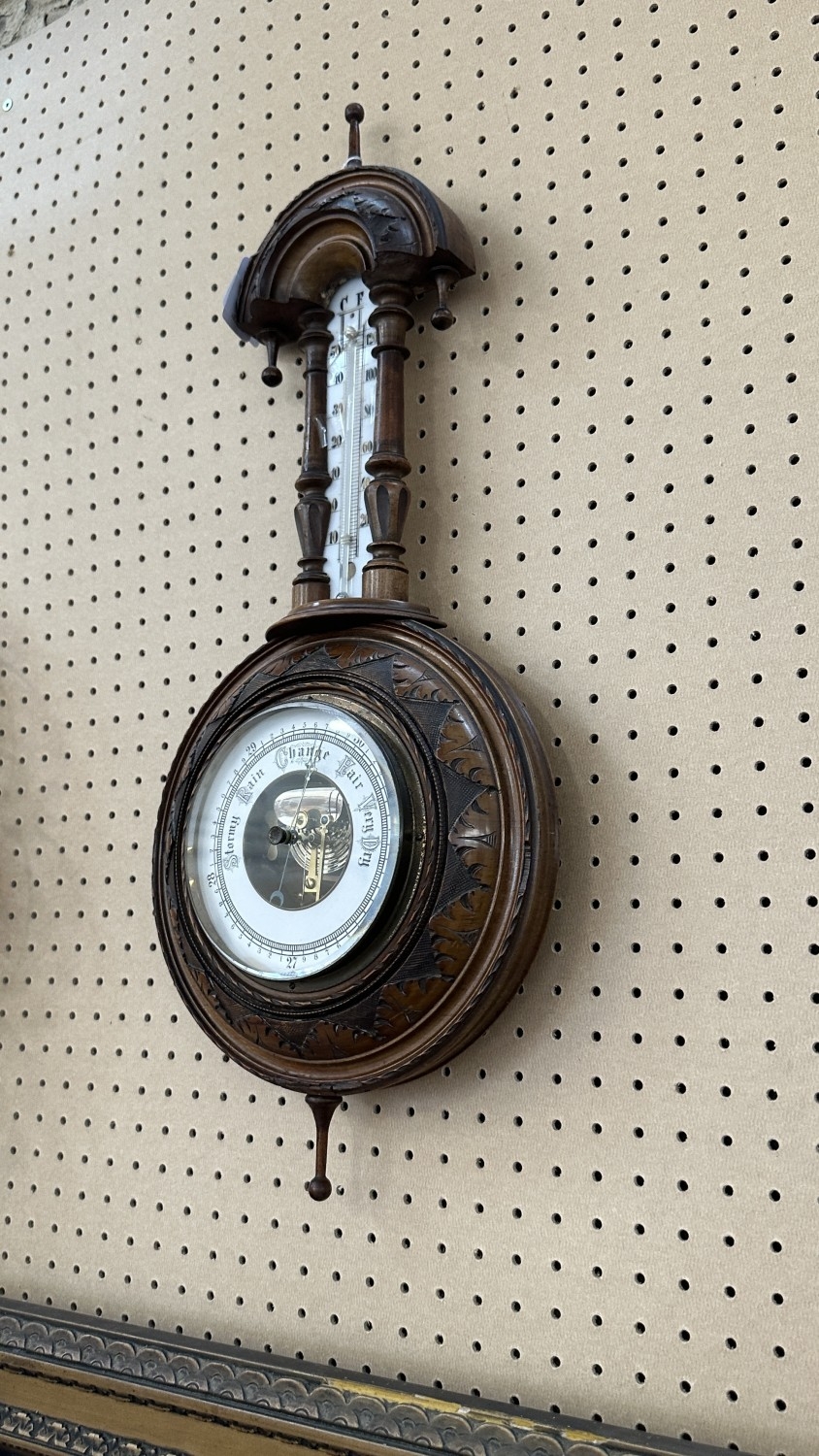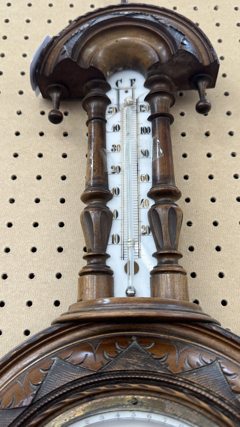 A late 19th/early 20th century carved walnut framed aneroid barometer - approx. 56cm high x 23cm wide