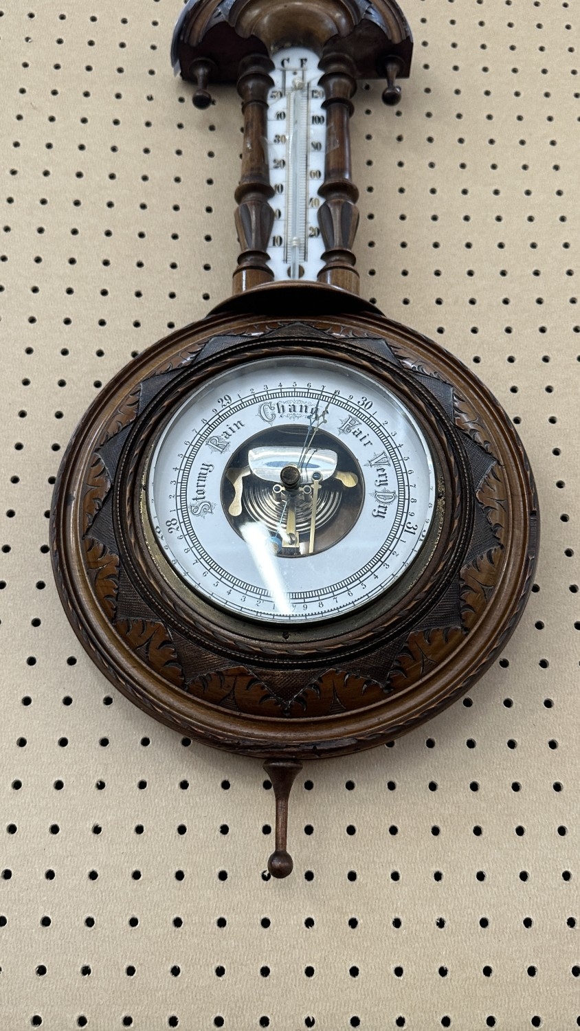 Thermometer is cracked to top and walnut case shows slight splits and losses.