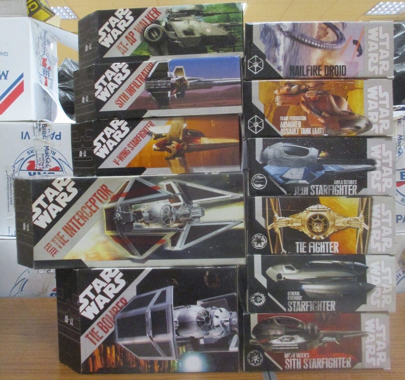 Star Wars. Hasbro. Range of 30th Anniversary vehicles, generally near mint to mint in excellent to near mint boxes, includes Aayla Secura's Jedi Starfighter, AT-AP Walker, Darth Vader's Sith Starfighter, Elite Tie Interceptor, General Grievous' Starfighter, Hailfire Droid, Obi-Wan's Starfighter & Hyperspace Ring, Sith Interceptor, Tie Bomber, Tie Fighter, Trade Federation Armoured Assault Tank (AAT) and V-Wing Fighter. Qty 12 (3B)