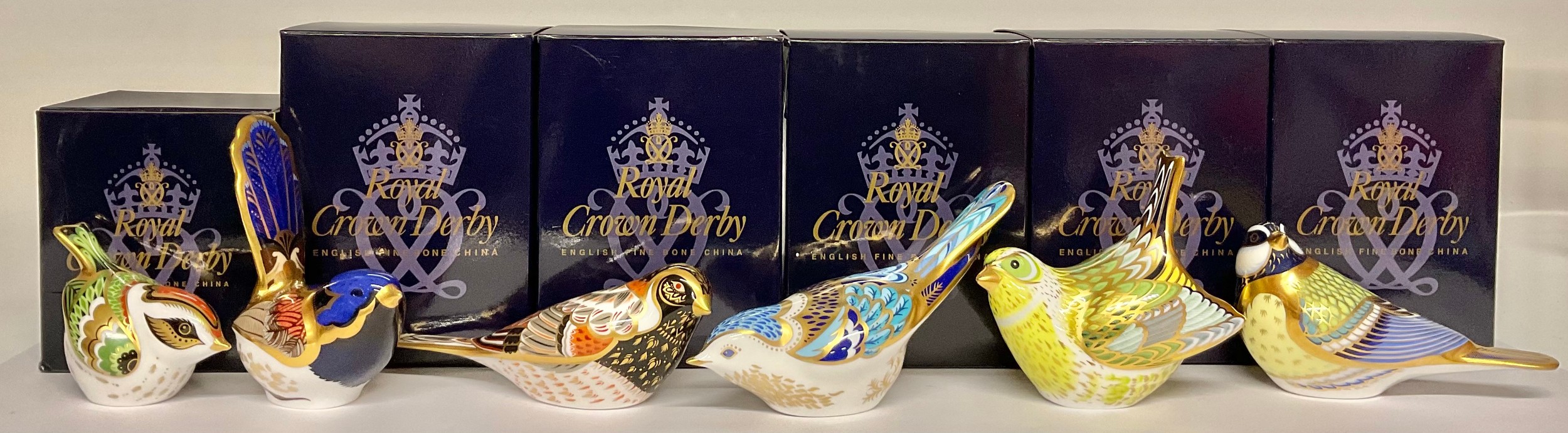 A Royal Crown Derby paperweight, Mountain Bluebird, gold stopper, 7.5cm, printed mark in red, boxed; others, Firecrest, gold stopper, 6cm, boxed; Fairy Wren, gold stopper, boxed; Greenfinch, gold stopper, boxed; Great Tit, gold stopper, boxed; Bunting, gold stopper, boxed (6)