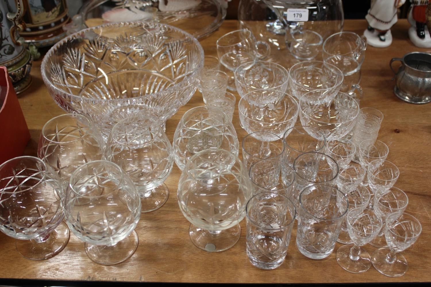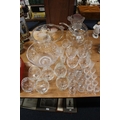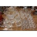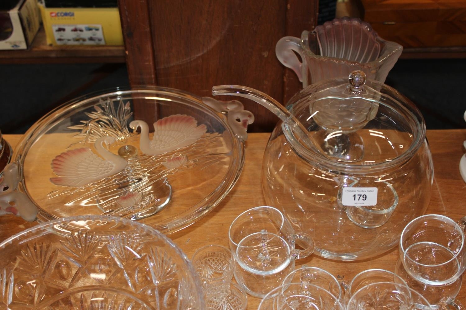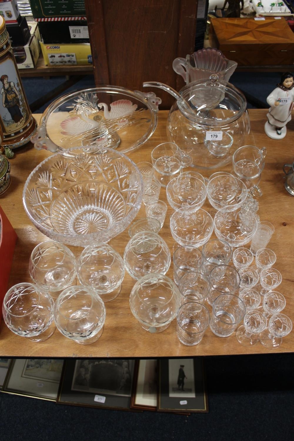 Glassware to include a pink and frosted glass comport with swan decoration, a similar jug, a punch set, whisky tot glasses, a fruit bowl, etc.