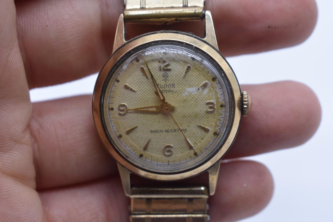 A circa 1953 Tudor Royal 9ct gold manual wind wristwatch, 30mm, with honeycomb dial, Dennison case, on later replacement gold plated expanding bracelet.