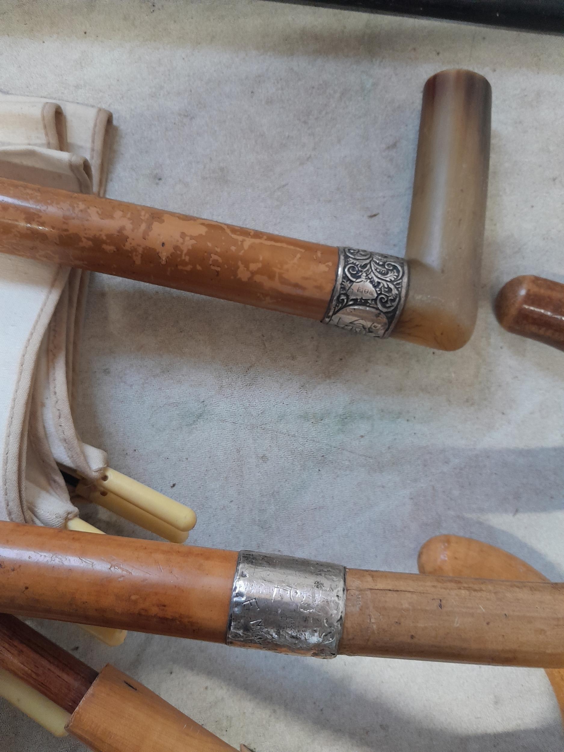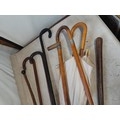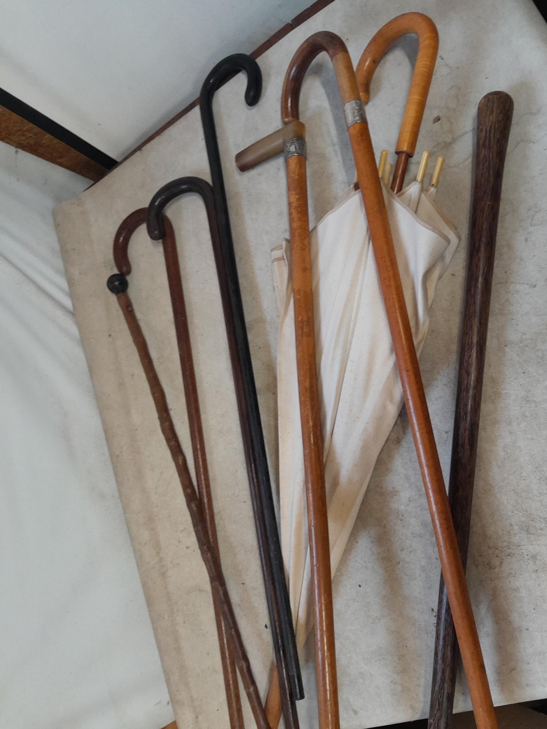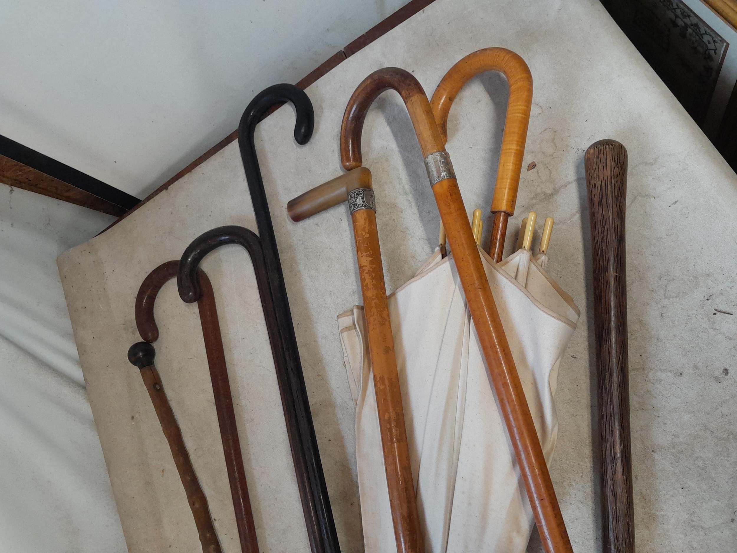 Collection of mixed era walking sticks, canes and umbrellas : carved horn, silver collars