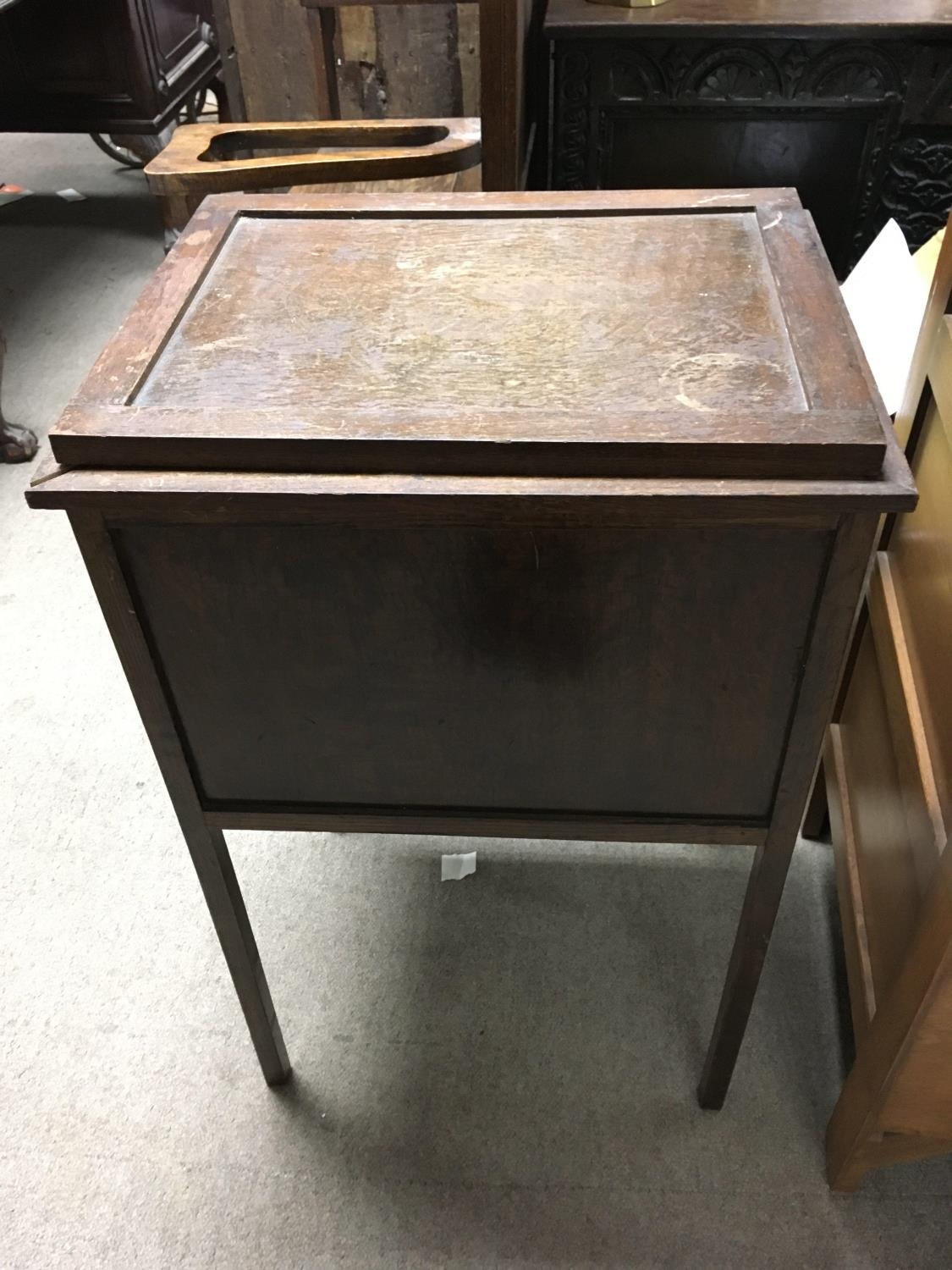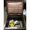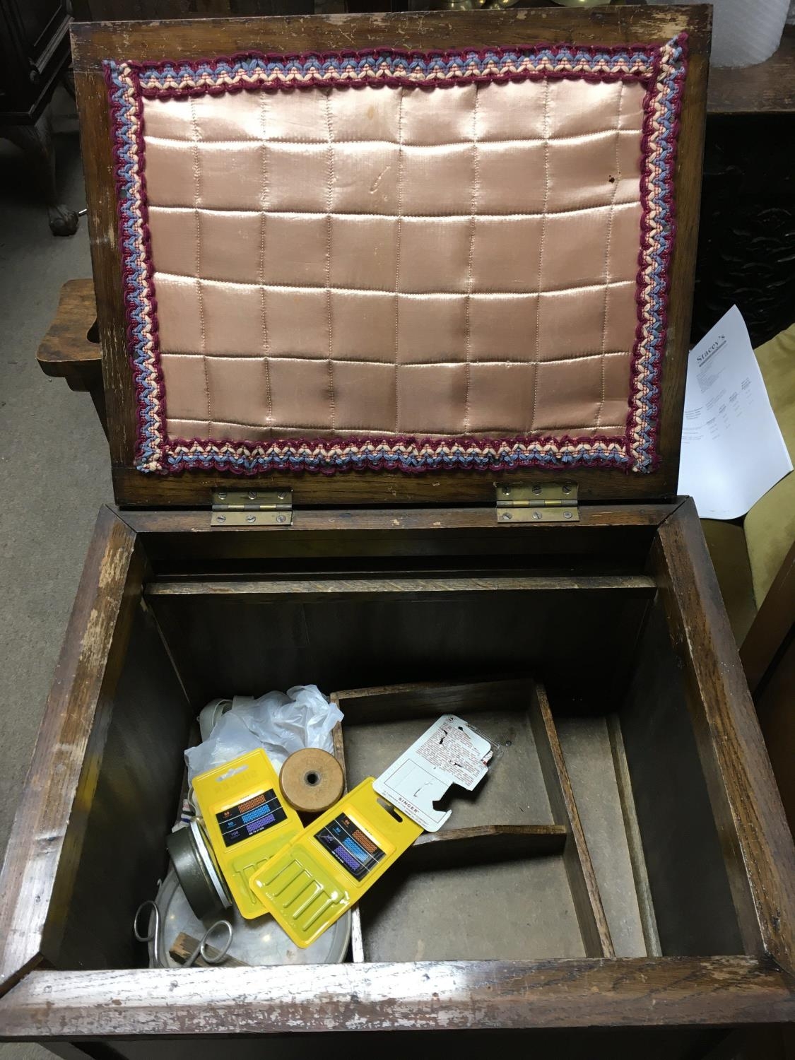 A vintage lift up lid sewing box with some contents. Measuring approximately 71cm x 47cm x 39cm - NO RESERVE