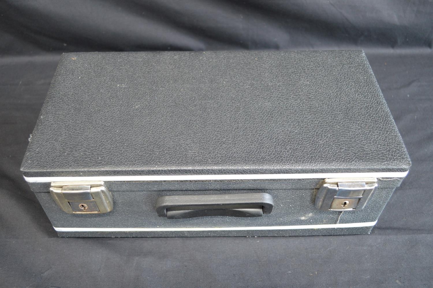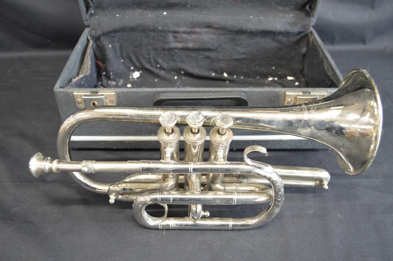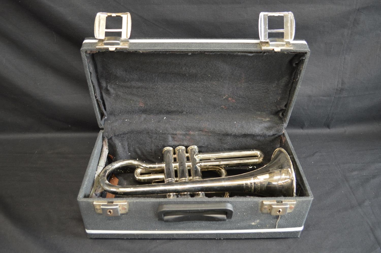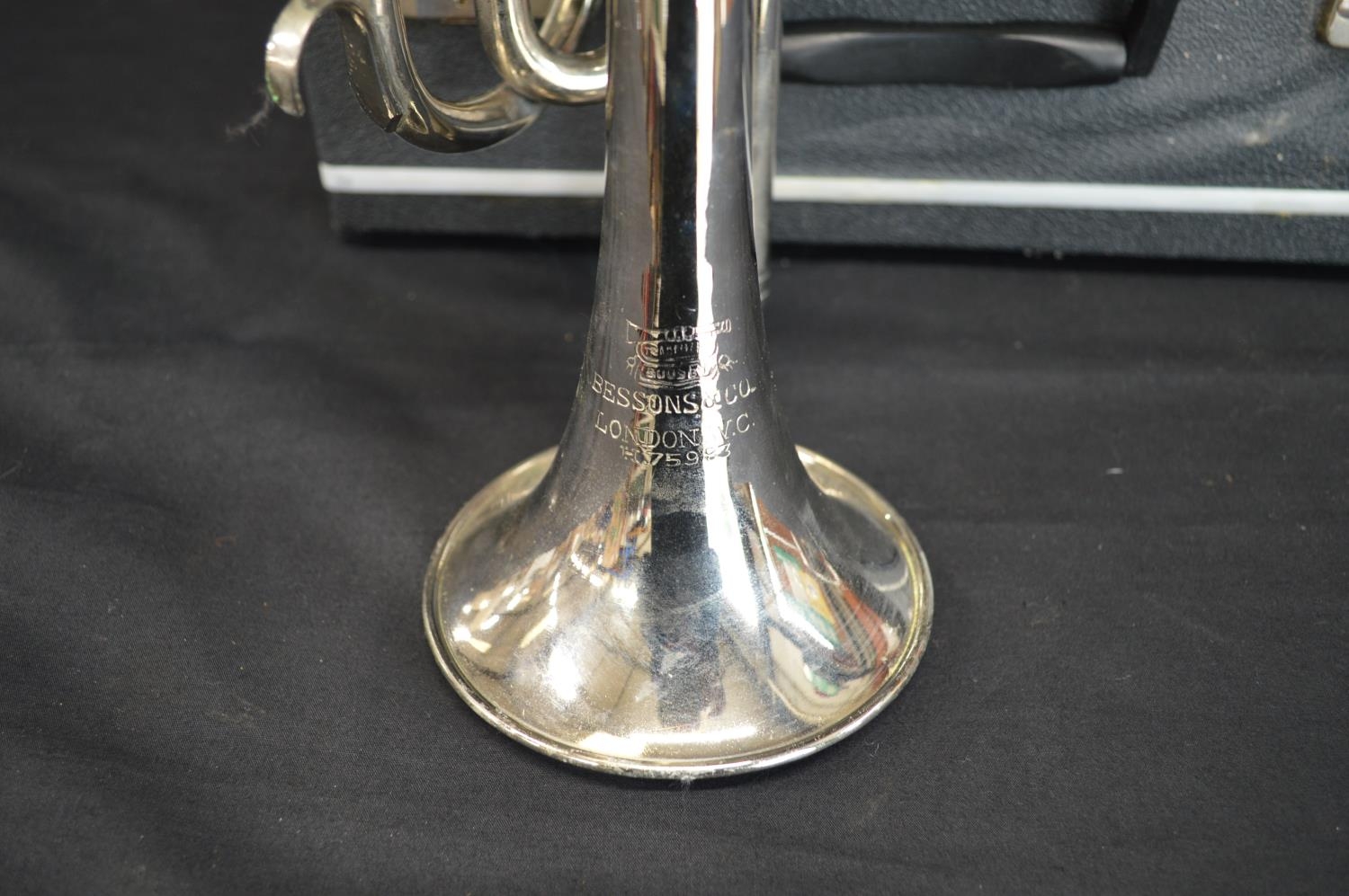 Trademark Boosey, Bessons & Co. London WC H.75983 plated trumpet in black hard case