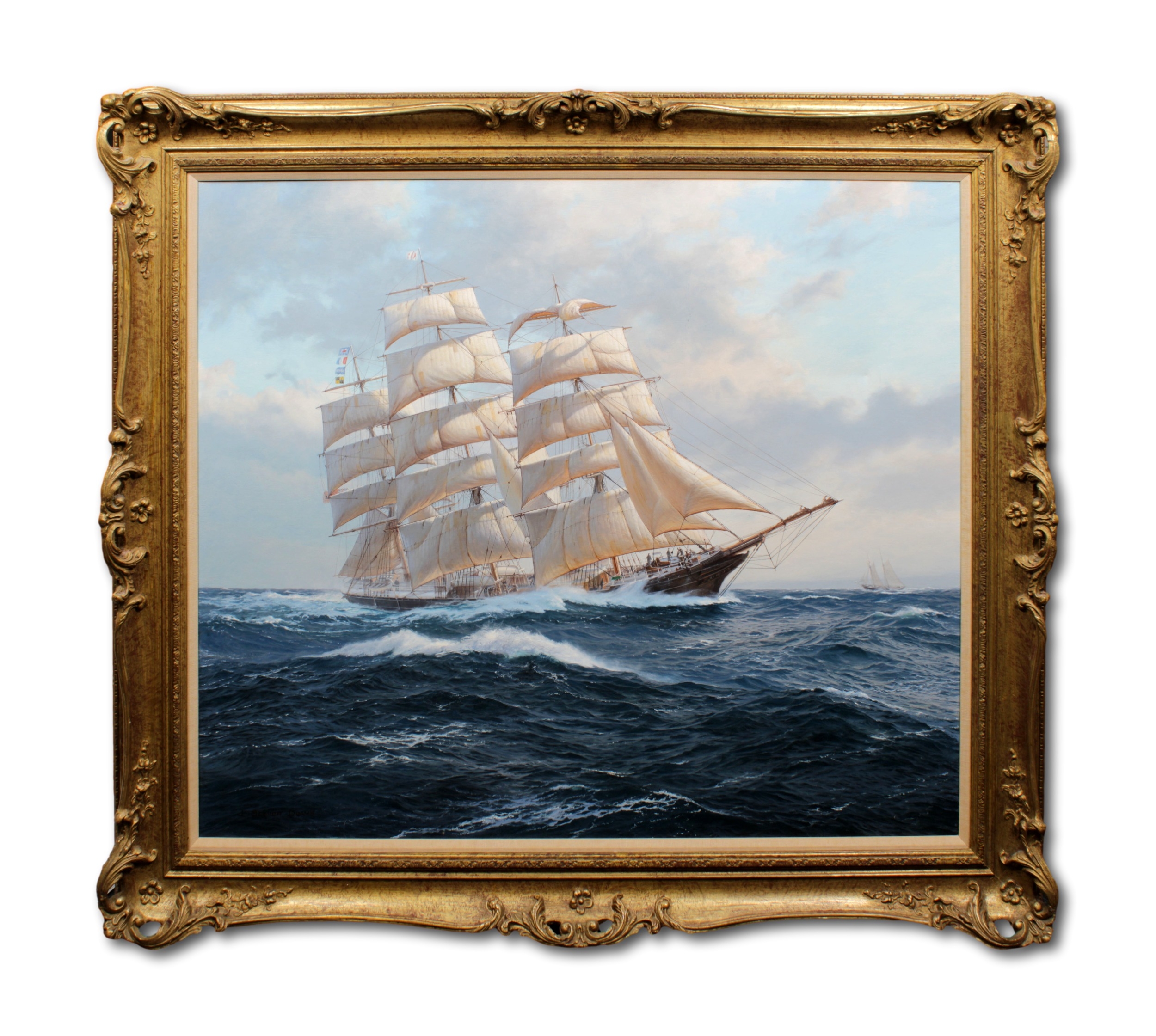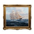 John Steven Dews (British, b.1949), Three masted ship in choppy seasSigned, oil on canvas, 75.5cm x 90cmProvenance: James H Starkey Galleries, Beverley, Yorkshire