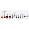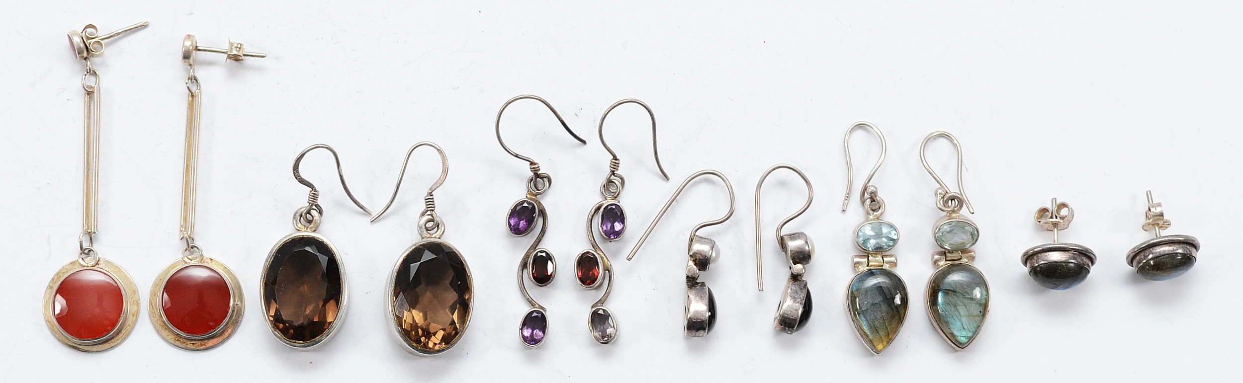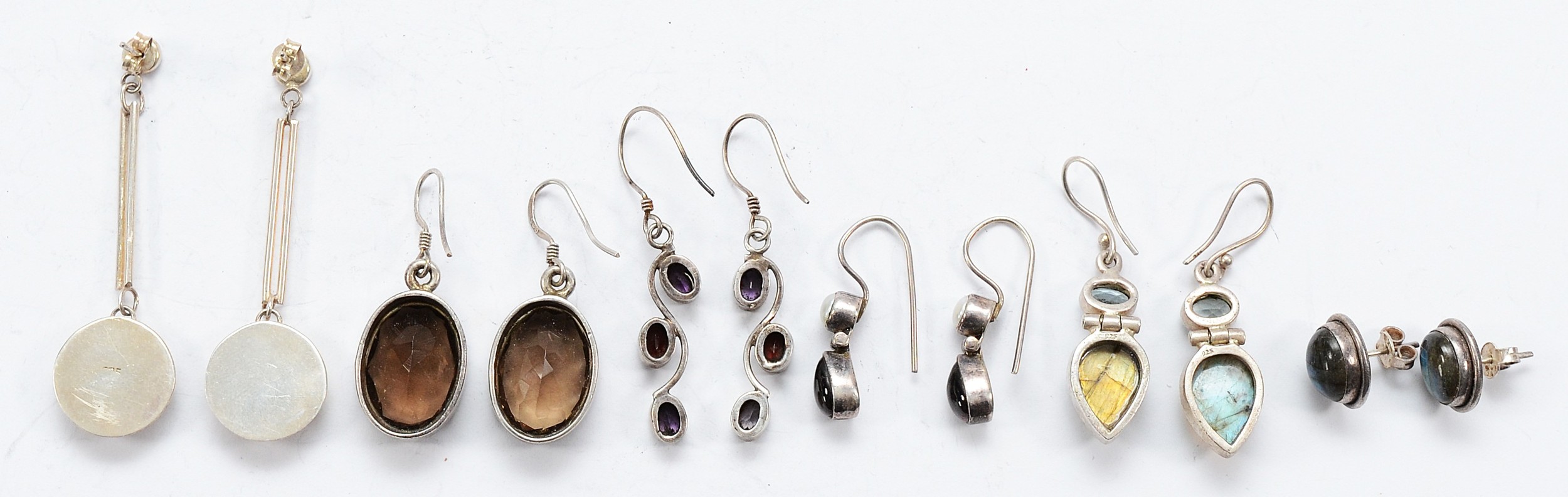 Five pairs of 925 silver gemset earrings, with a pair of unmarked silver gemset earrings, 33g