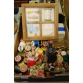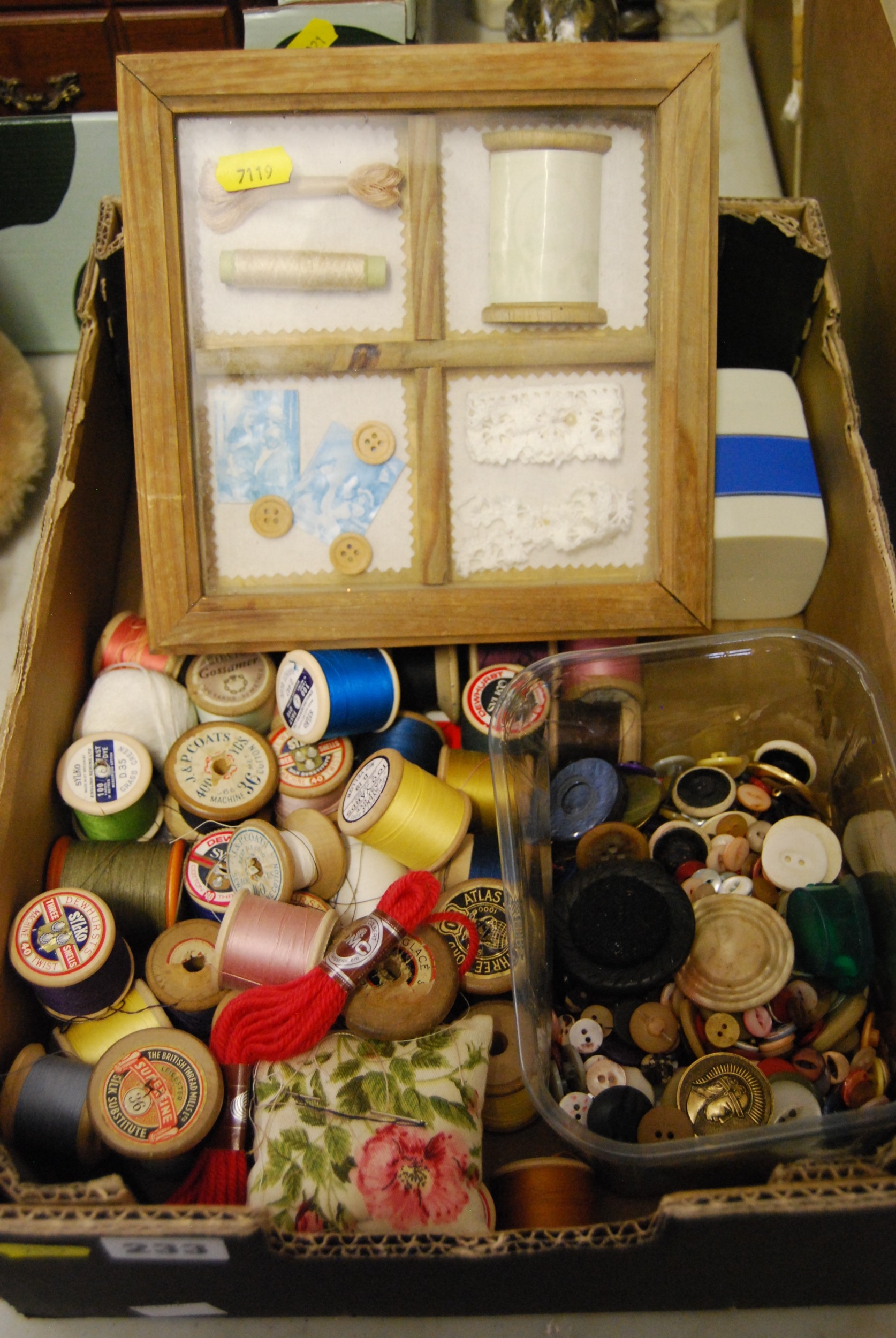 BOX OF SEWING ITEMS INCLUDING COTTONS, BUTTONS, PINE BOX, ETC