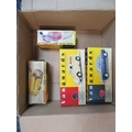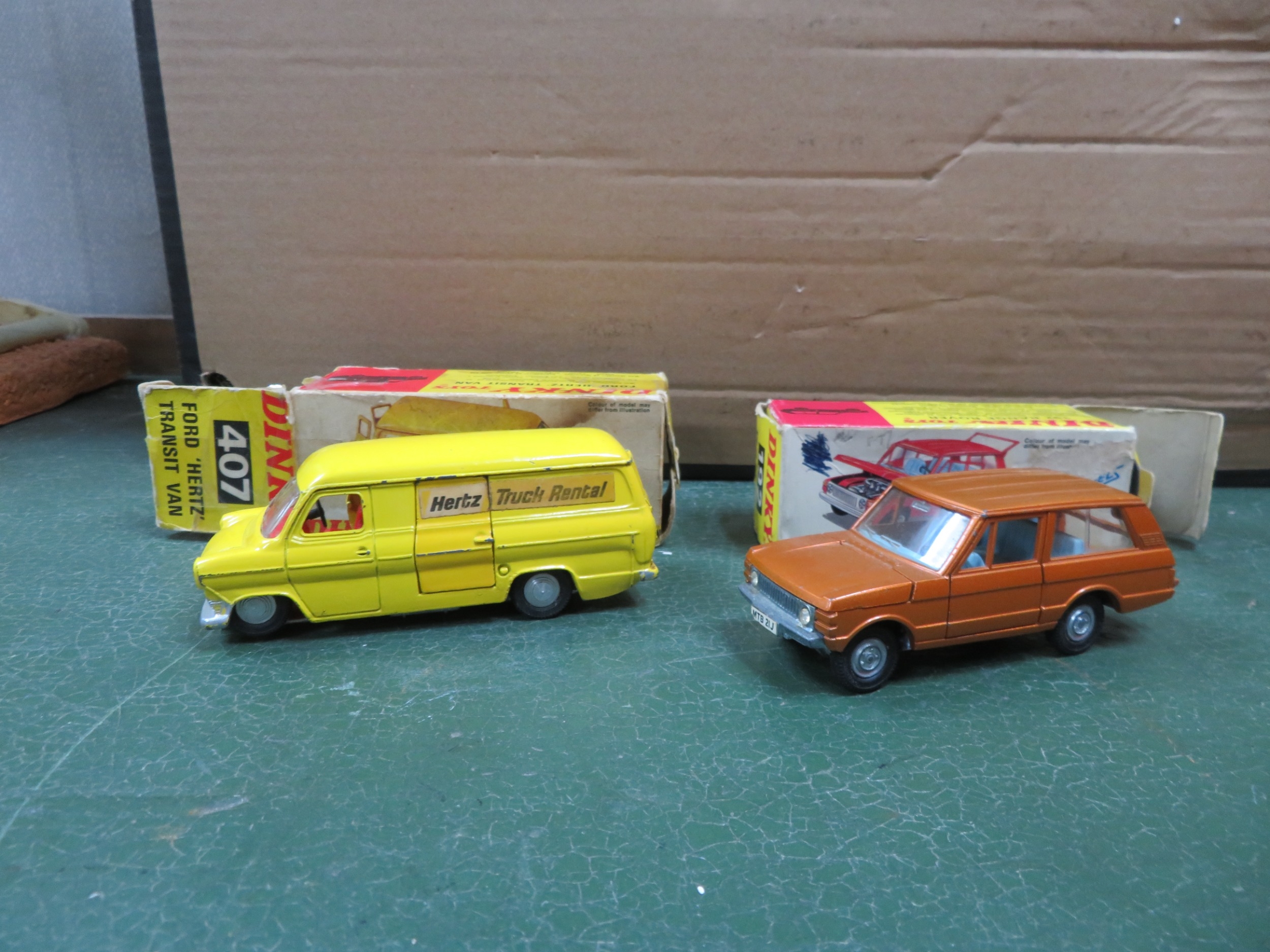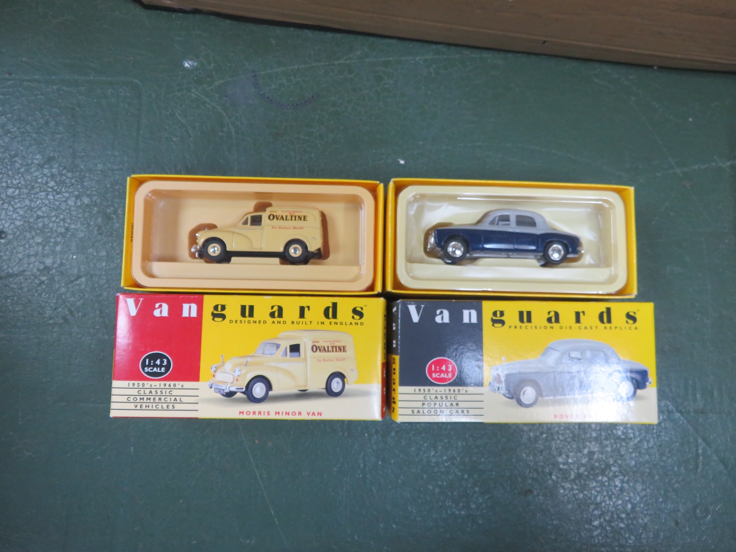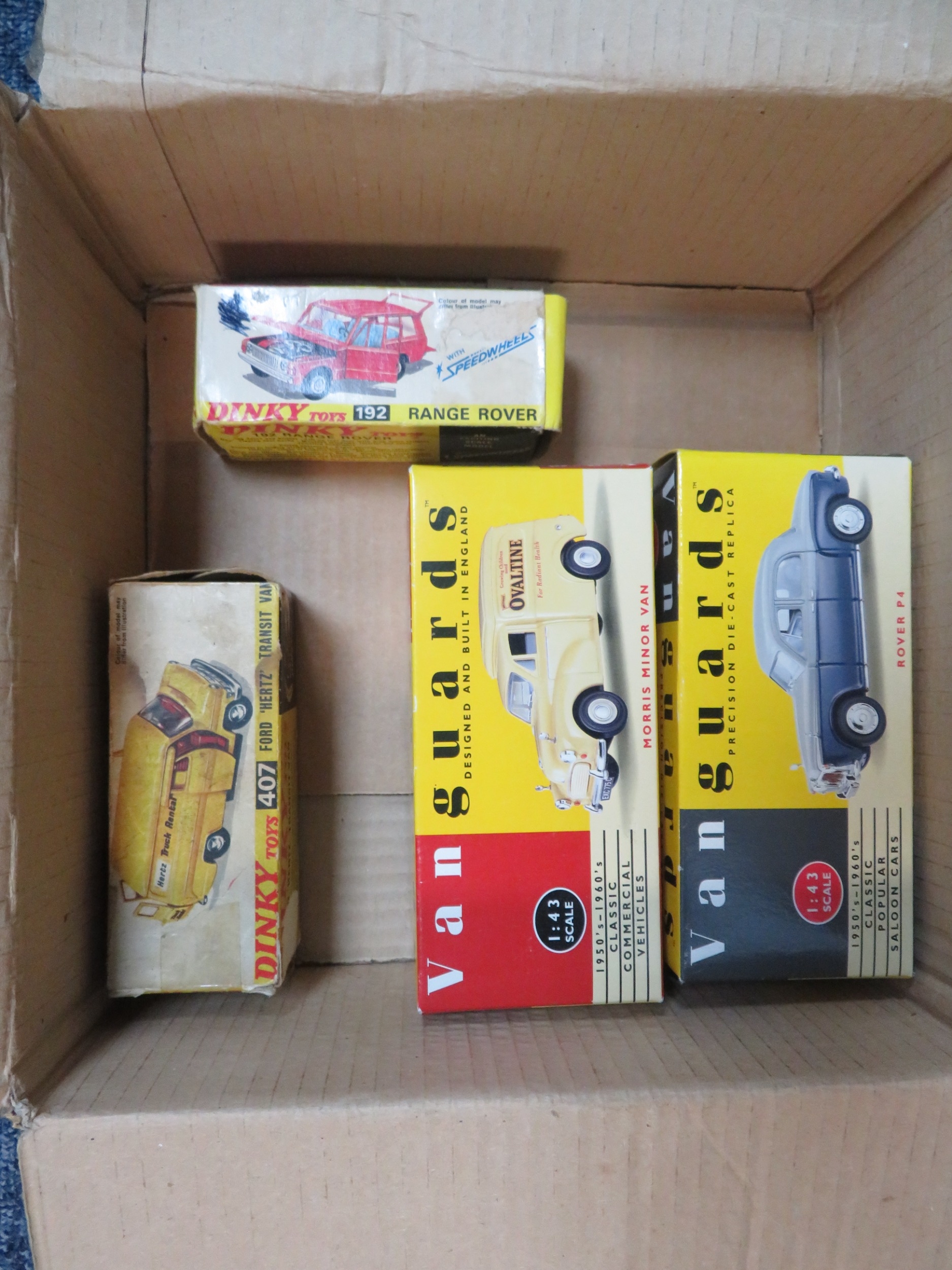 Diecast misc. collection, generally excellent to good in excellent to fair boxes, with Dinky Range Rover (first issue Speedwheels) No. 192 and Ford Transit Hertz No. 407, plus Lledo Vanguards 1/43rd scale Rover P4 blue/grey No. VA19004 and Morris Minor Van Ovaltine No. VA11002 (in excellent lift-off lid boxes). Qty 4