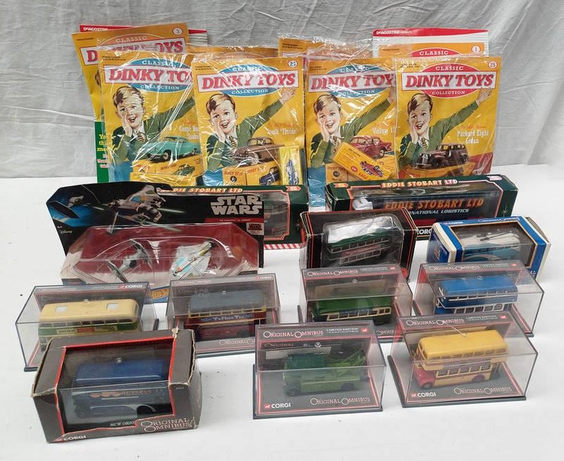 SELECTION OF VARIOUS MODEL VEHICLES FROM CORGI, ATLAS EDITIONS, HOT WHEELS, ETC, INCLUDING TIE FIGHTER V'S GHOST, TRIUMPH TR2 SPORTS CAR, BRISTOL L5G LONDON TRANSPORT & OTHERS. ALL BOXED