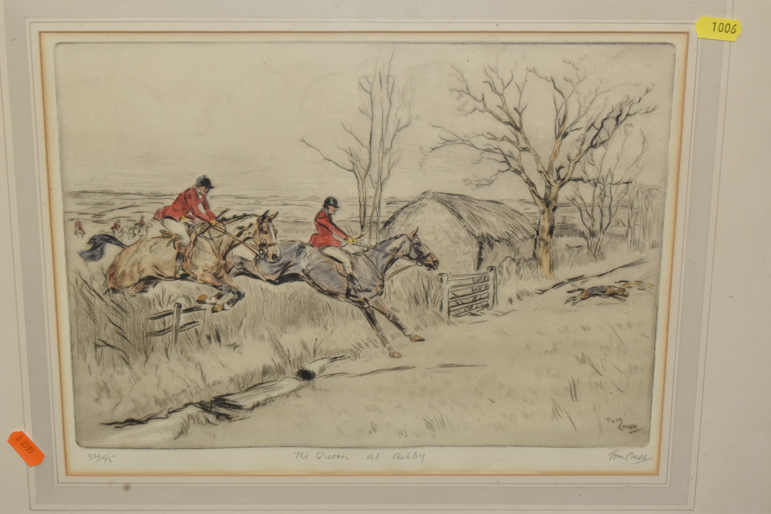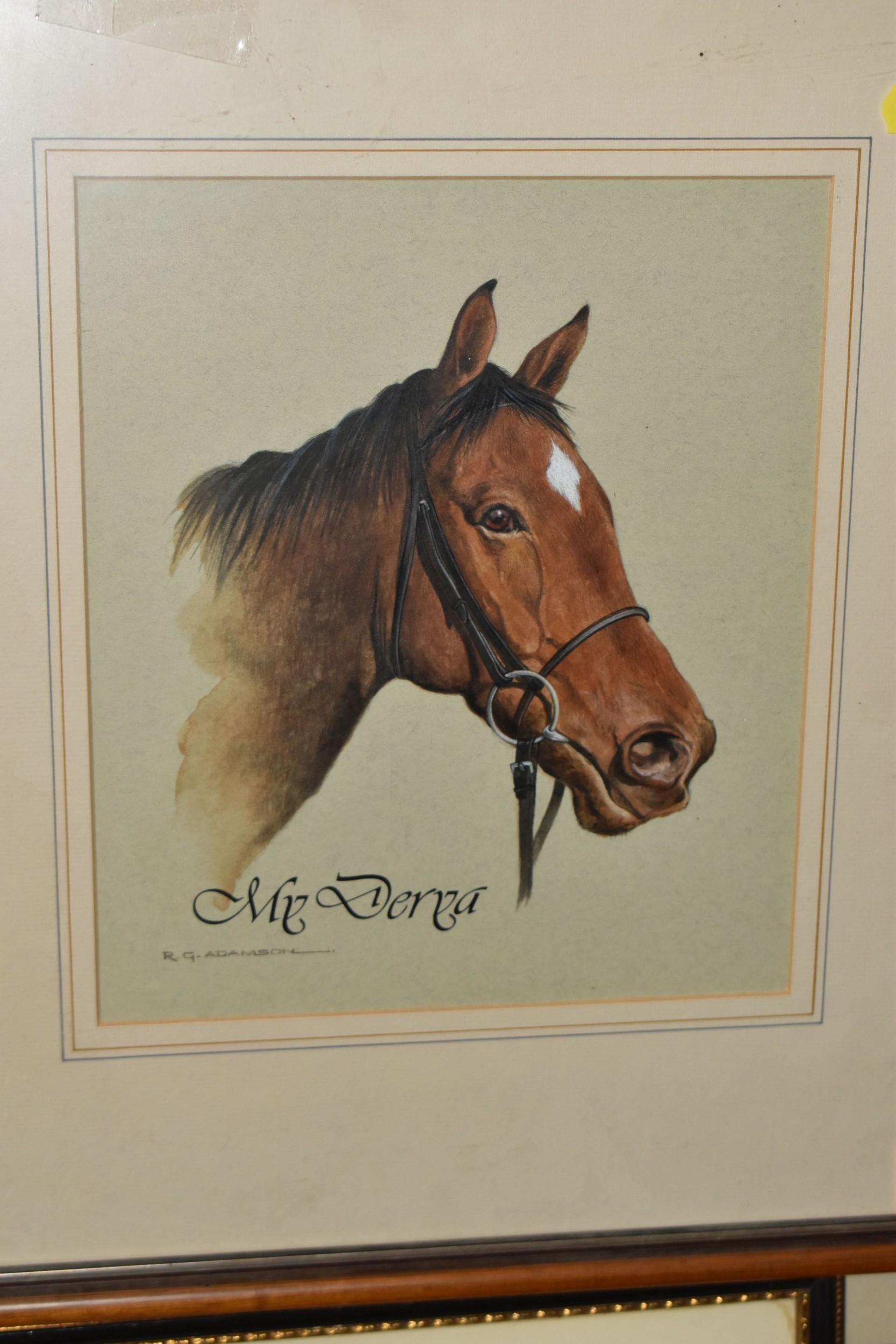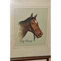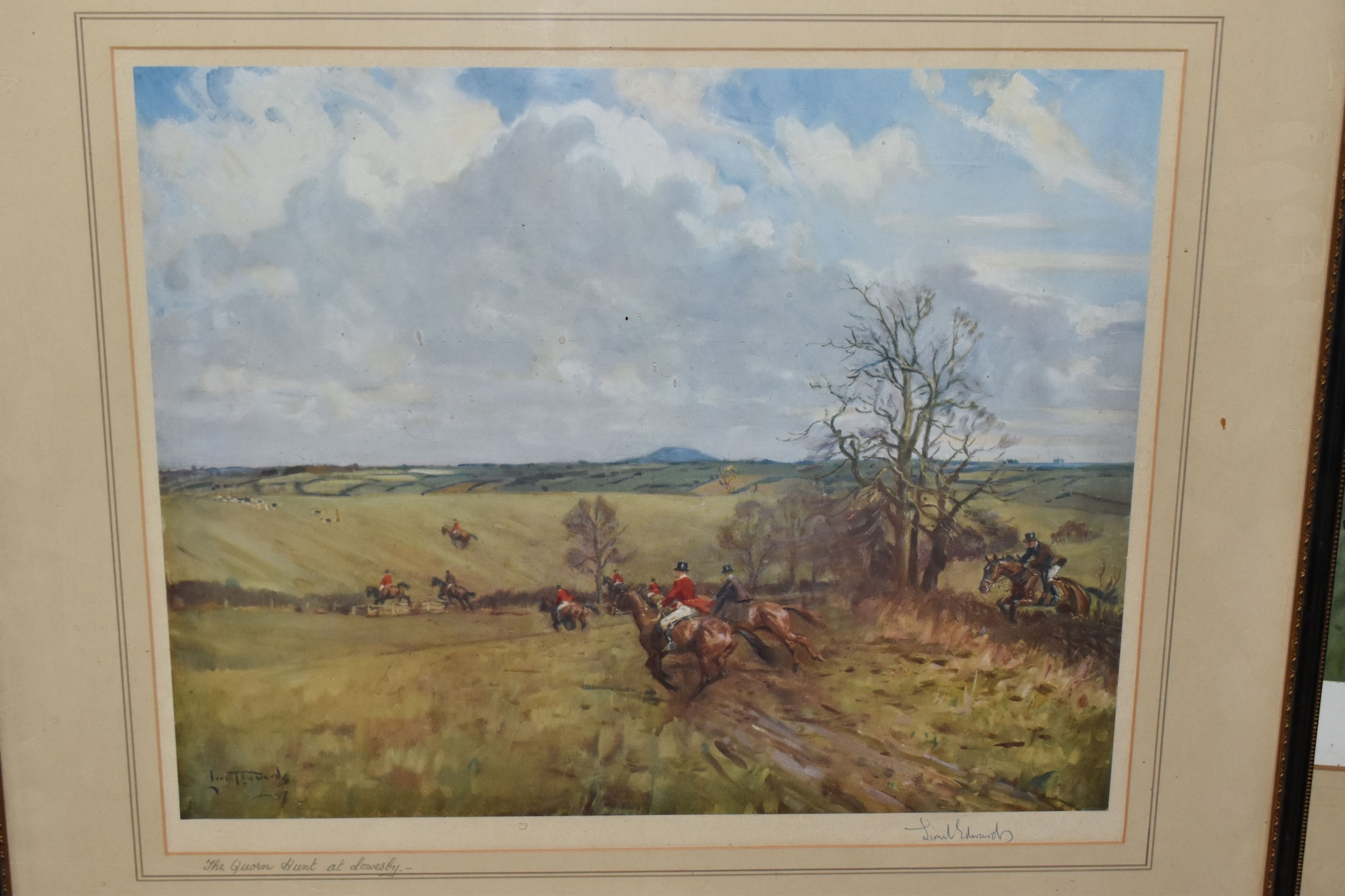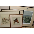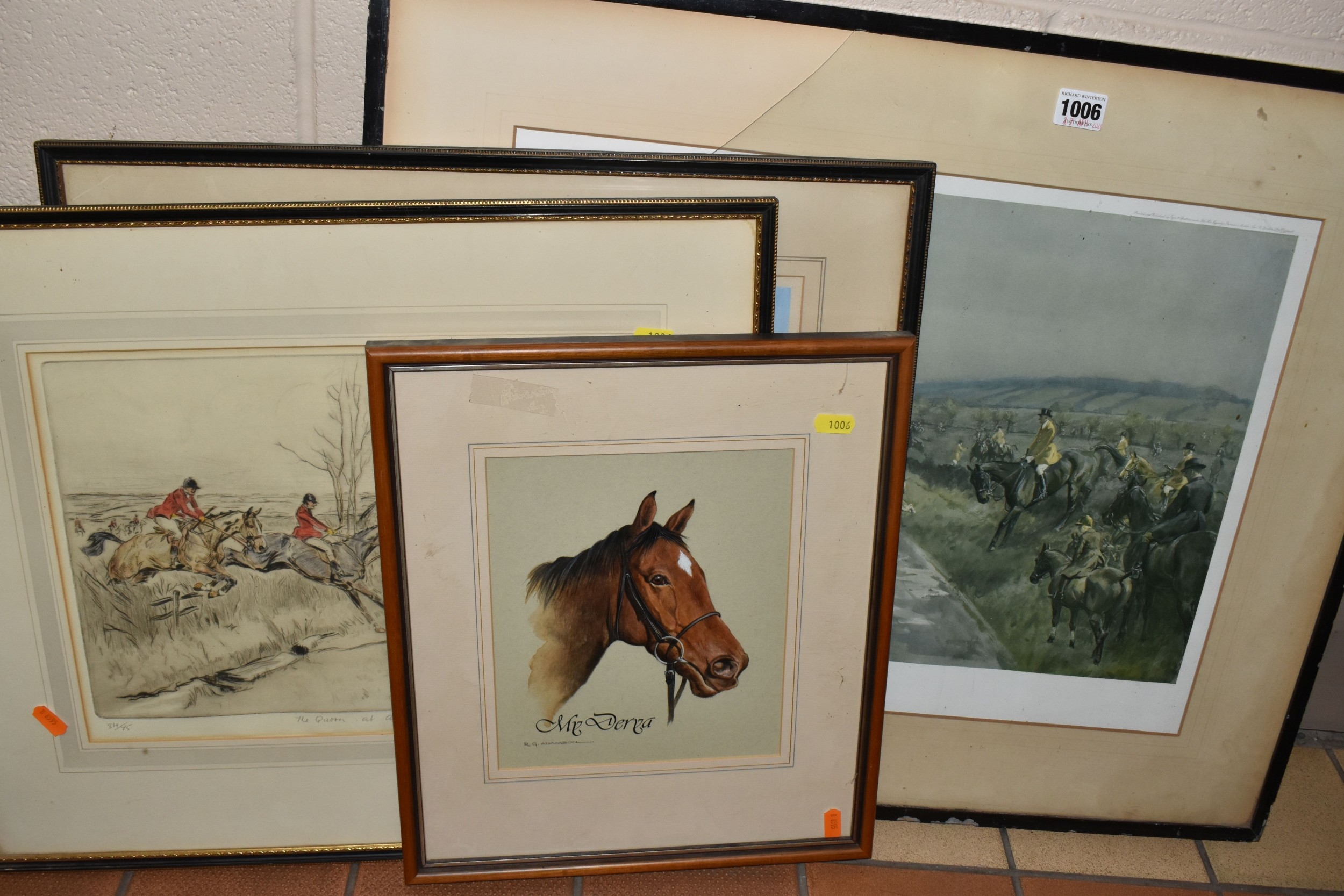 FOUR HORSE RELATED PICTURES, comprising a Tom Carr etching with colours 'The Quorn at Ashby', signed titled and numbered 34/75 to lower margin - some mount burn, two signed Lionel Edwards prints, 'The Quorn Hunt at Lowesby' signed to the lower margin, titled to the mount, and 'The South Hunt - Notts' signed to the lower margin - some colours have faded, glass broken, together with a watercolour portrait of Race Horse 'My Derya' by R.G. Adamson, approximate size 22cm x 19cm
