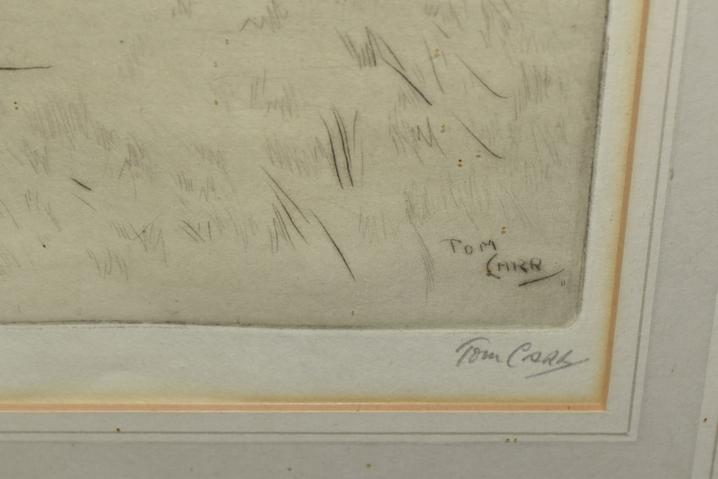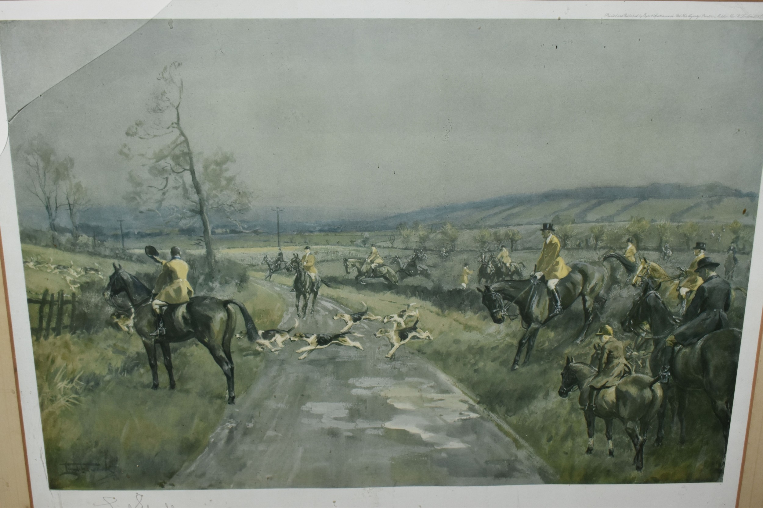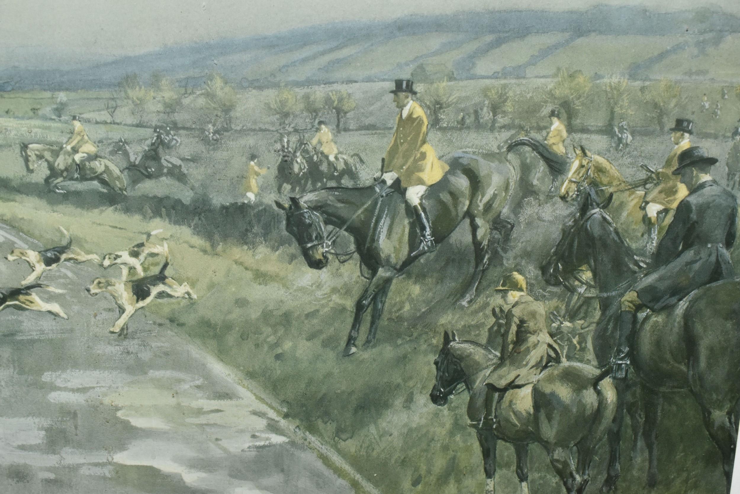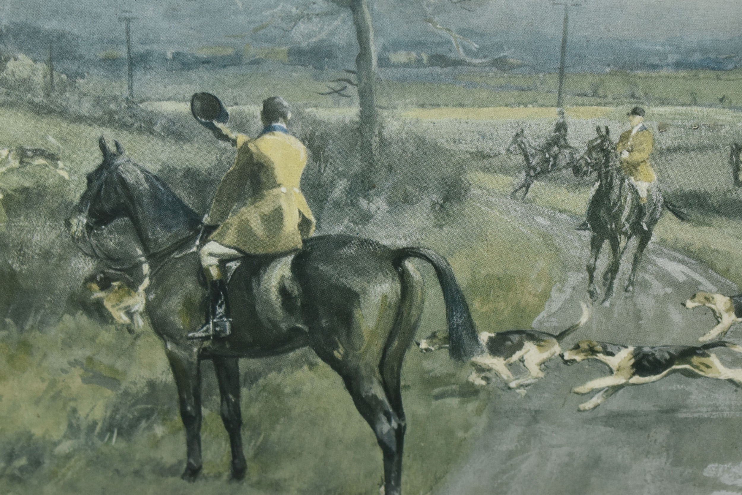 FOUR HORSE RELATED PICTURES, comprising a Tom Carr etching with colours 'The Quorn at Ashby', signed titled and numbered 34/75 to lower margin - some mount burn, two signed Lionel Edwards prints, 'The Quorn Hunt at Lowesby' signed to the lower margin, titled to the mount, and 'The South Hunt - Notts' signed to the lower margin - some colours have faded, glass broken, together with a watercolour portrait of Race Horse 'My Derya' by R.G. Adamson, approximate size 22cm x 19cm