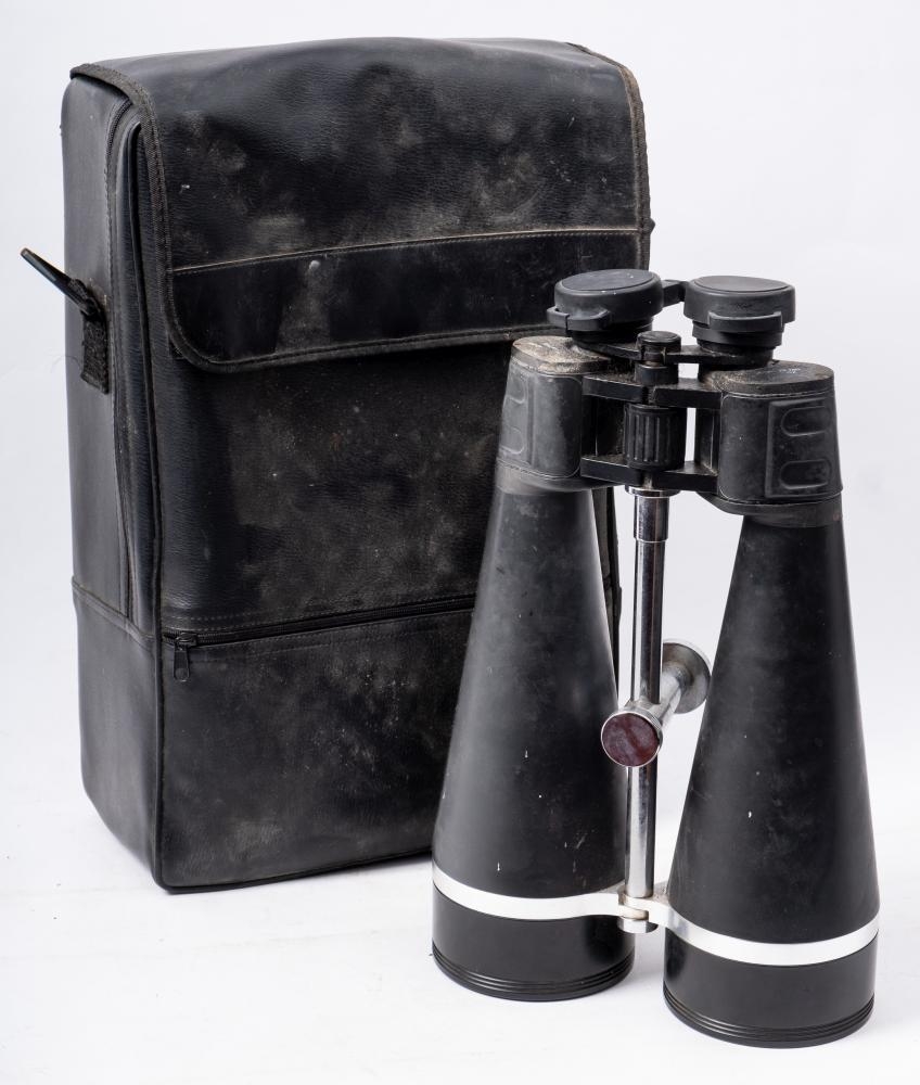 A pair of Strathspey 20x90 90mm binoculars: with rubber coated tubes, nickel plated tripod mount, signed to backplate as per title, in a black bag.