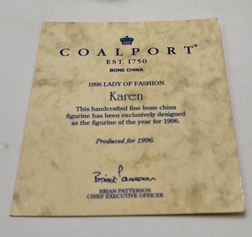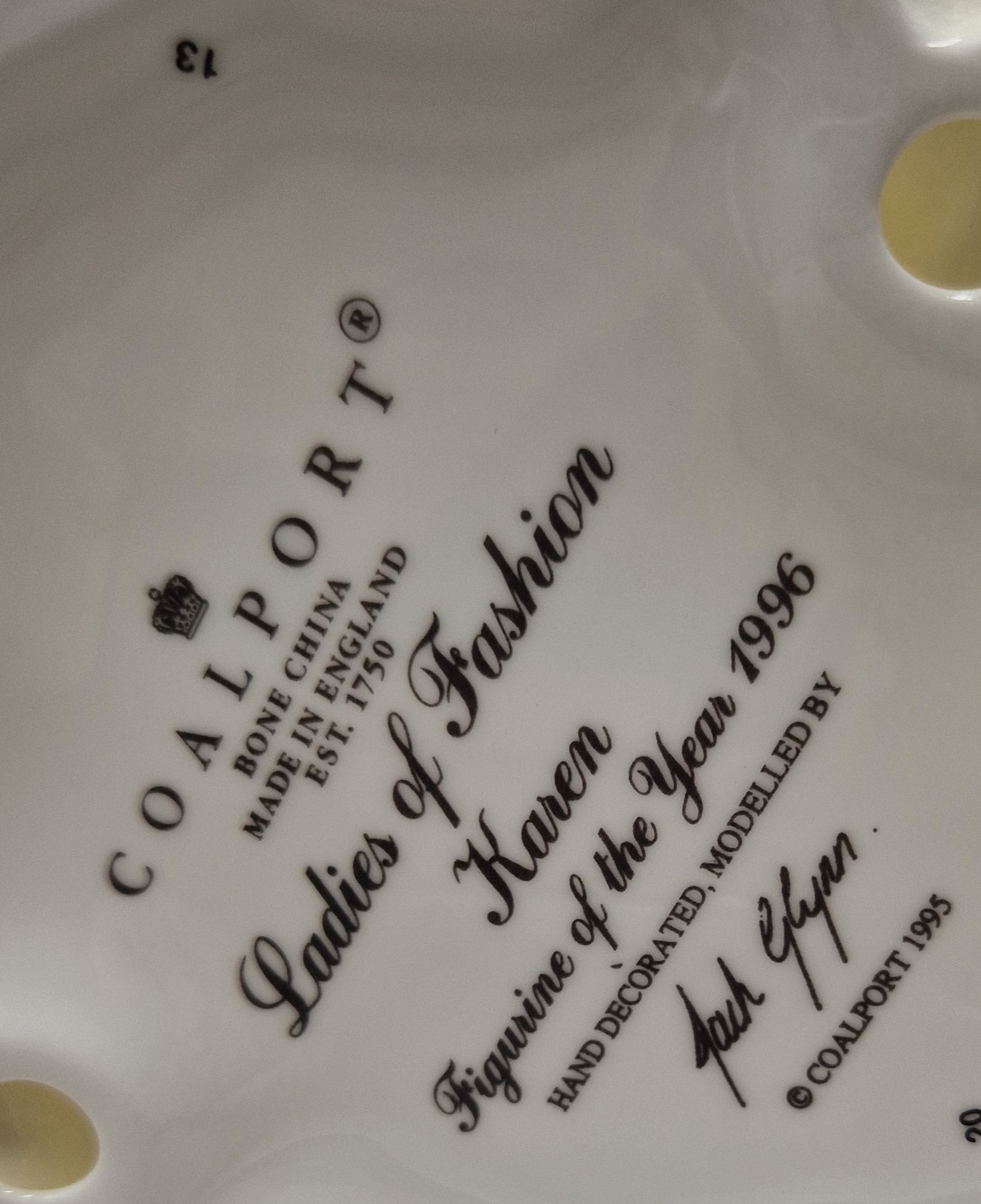 COALPORT CHINA Large 20cm FIGURINE "KAREN" (Style Two) 1996 Only Designed By Helen Buckley , Modelled Mr Jack Glynn FOR THE LADIES OF FASHION COLLECTION (Figurine Of The Year 1996)
