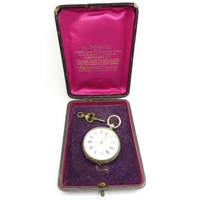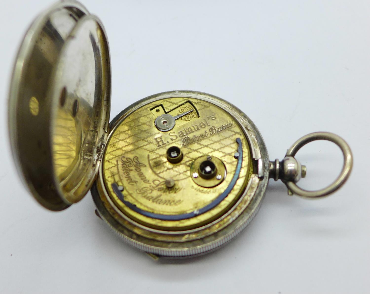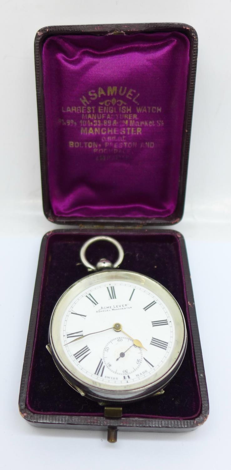 A silver cased Acme Lever pocket watch by H. Samuel in a H. Samuel pocket watch box
