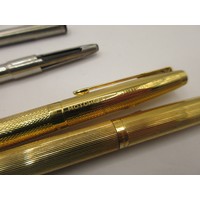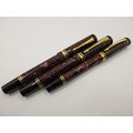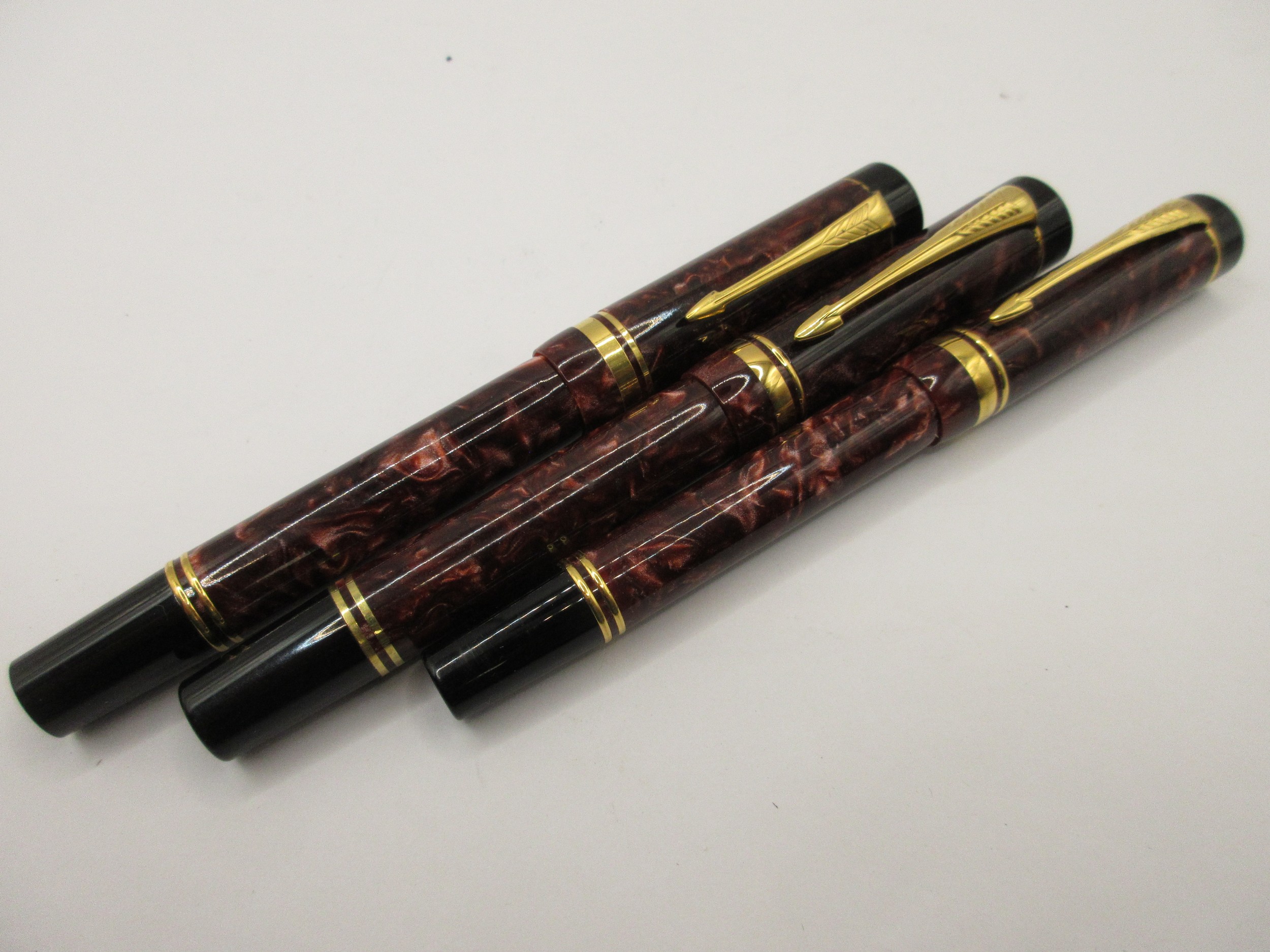 Three Parker Duofold Centennial pens with marbled maroon cap and barrels. (1) Fountain pen with nib marked 18K 750, slight a/f moderate use. (20 A second fountain pen with signs of little use but a/f split to cap. (3) A rollerball pen with signs of moderate use