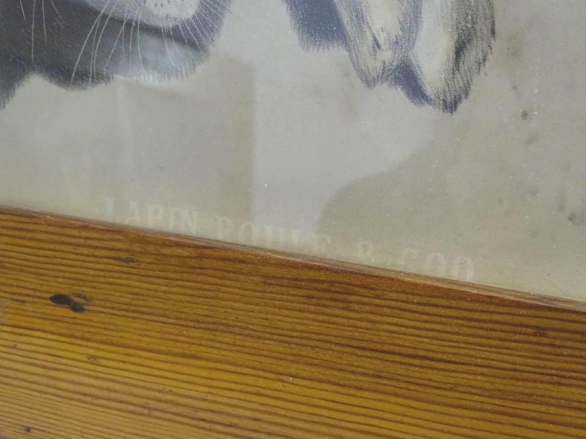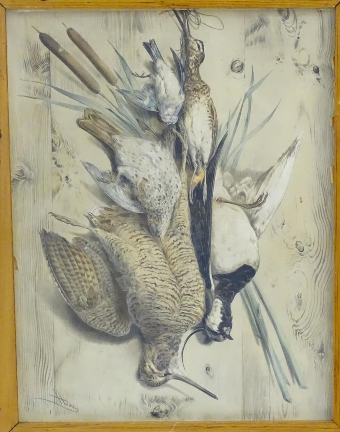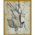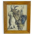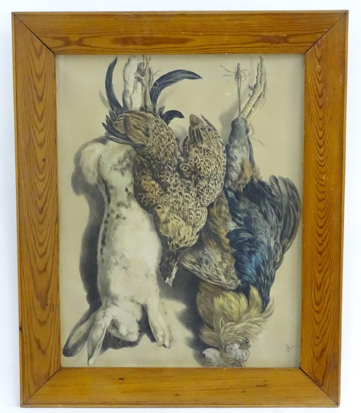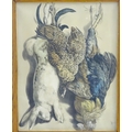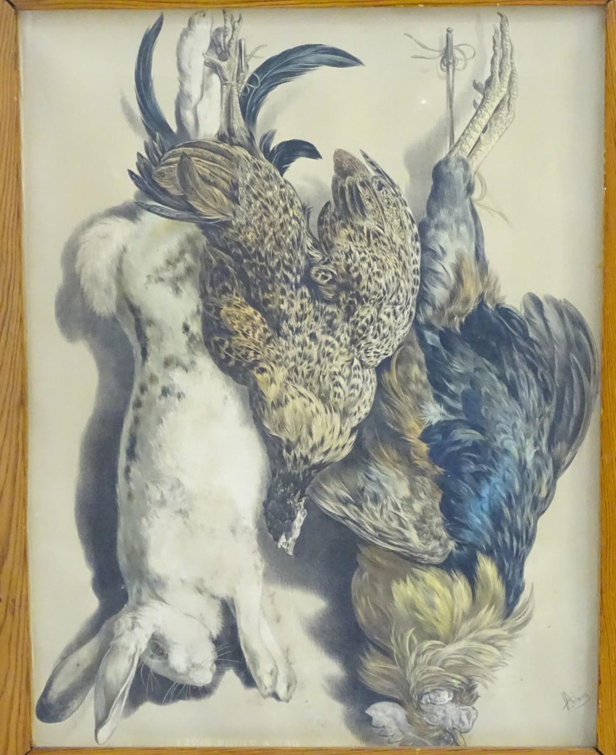 Albert Adam (1833-?), XIX, Hand coloured lithographs, x 2, A study of hanging dead game birds, a plover, woodcock, snipe, lark and finch, & A study of hanging dead game, a rabbit, hen and cockerel, Titled Lapin, Poule & Coq under, Facsimile signature lower left and lower right, respectively. Approx. 25'' x 19 1/4'' (2)