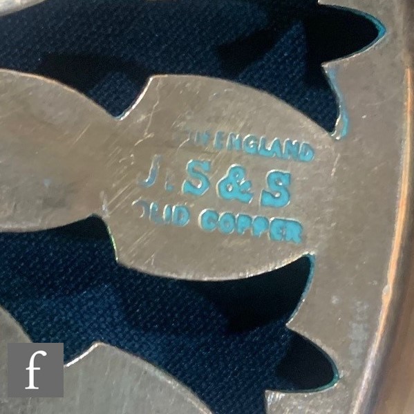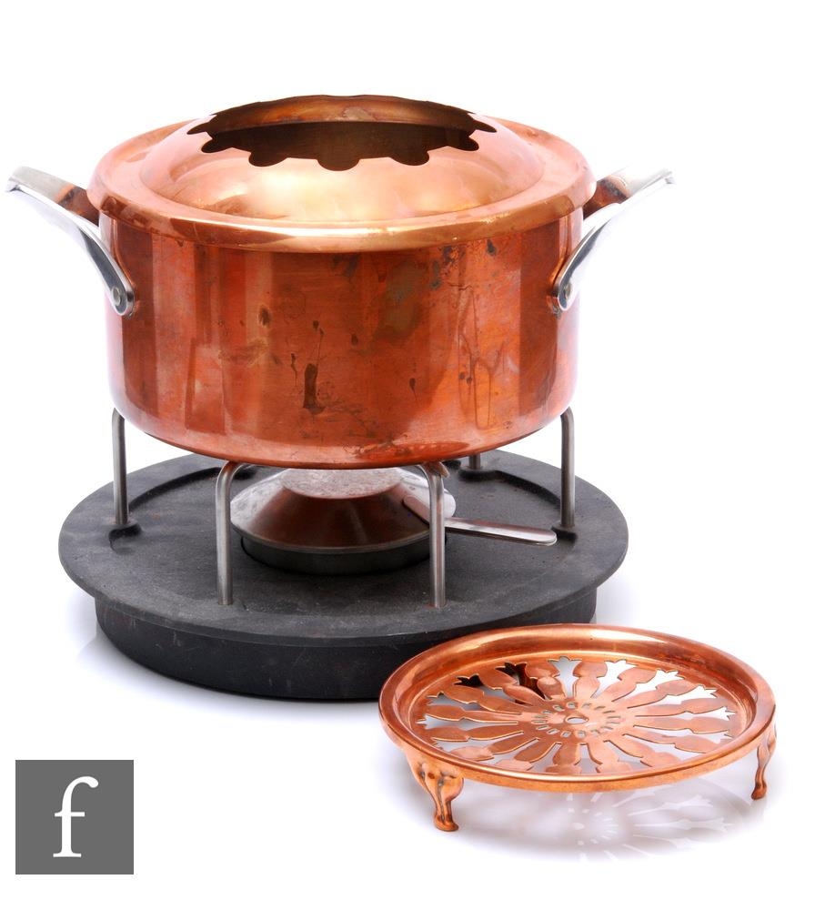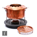 Henning Koppel - Georg Jensen - A 20th Century Danish copper fondue set, to include sauce pan, trivet and circular burner, with an additional copper trivet marked J. S & S (John Sankey & Sons). (4)