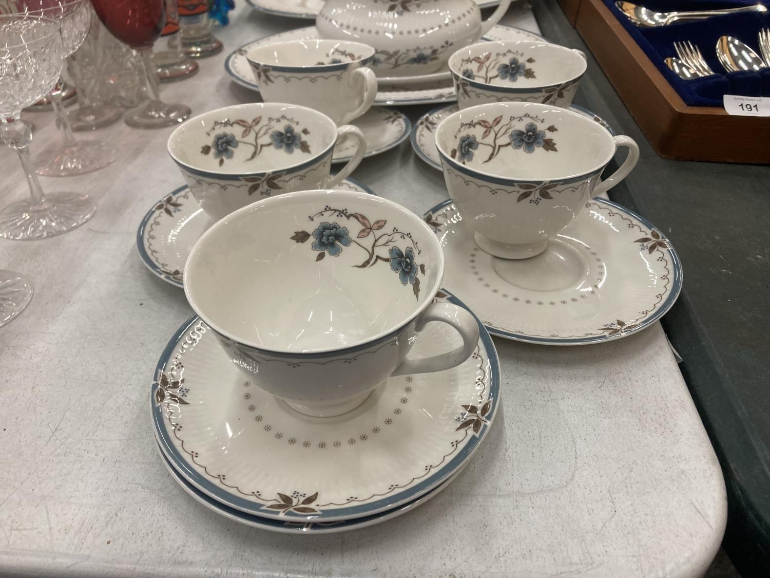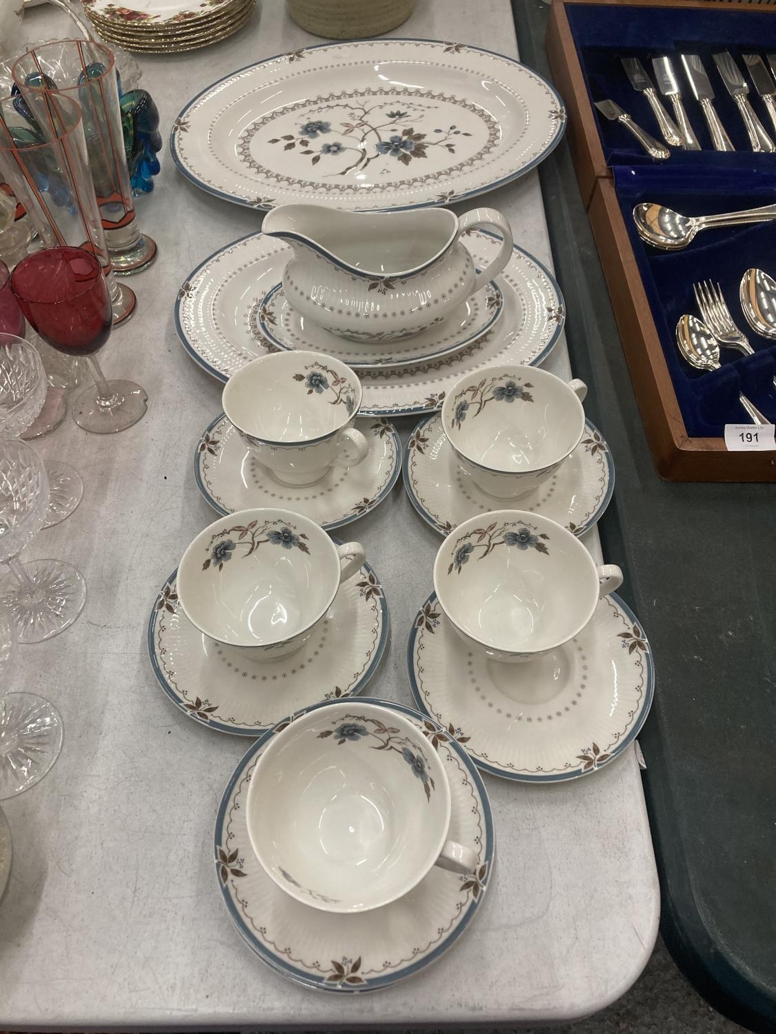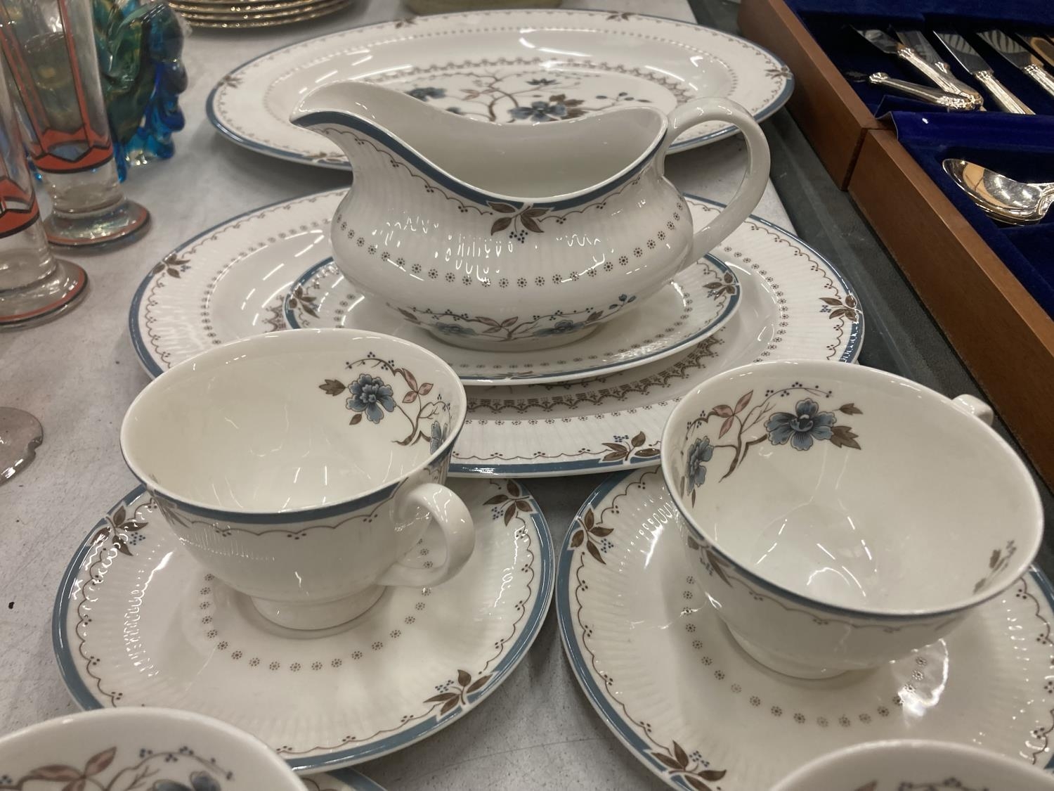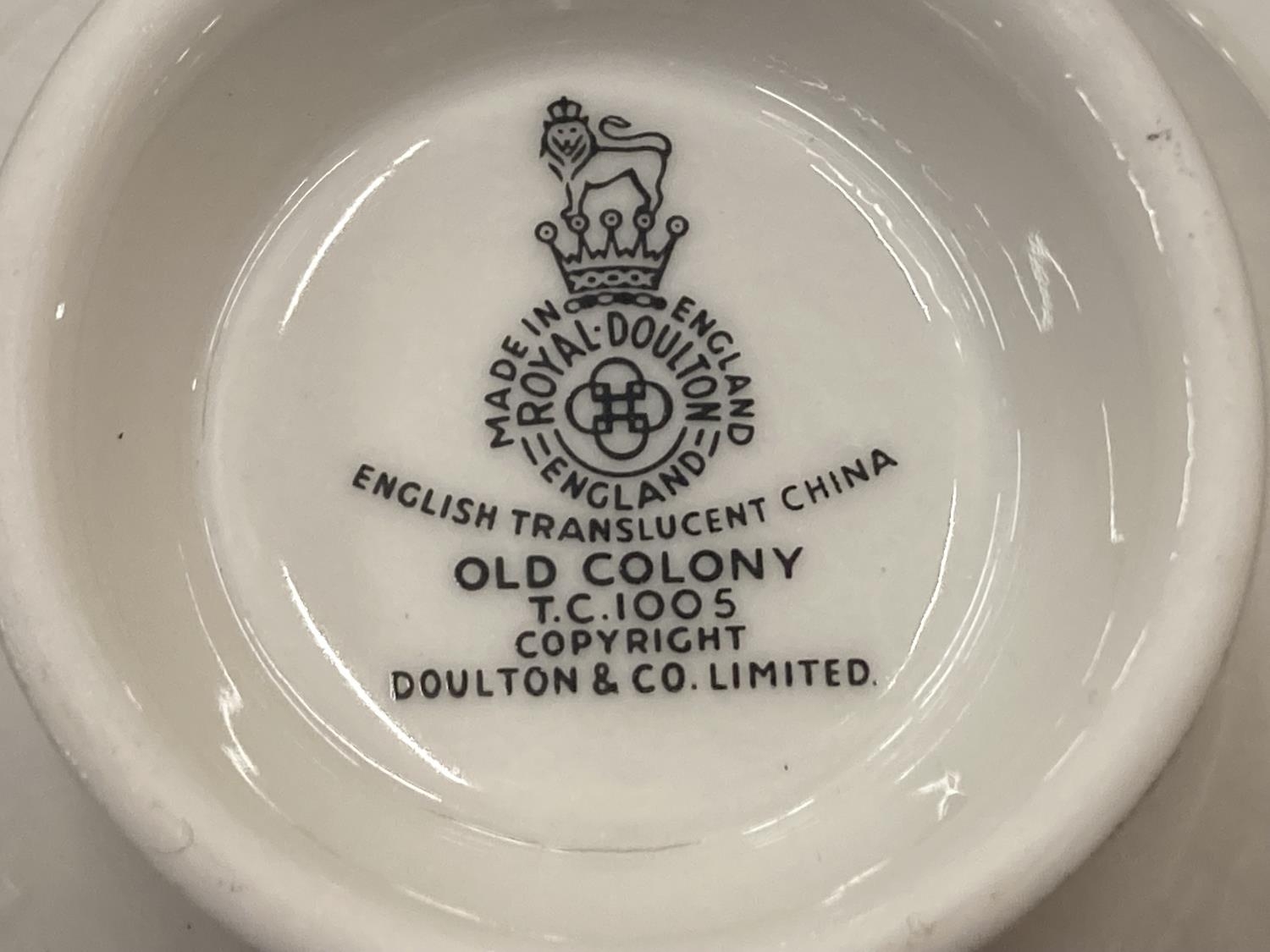 A QUANTITY OF ROYAL DOULTON 'OLD COLONY' TO INCLUDE SERVING PLATES, SAUCE JUG AND SAUCER, CUPS AND SAUCERS