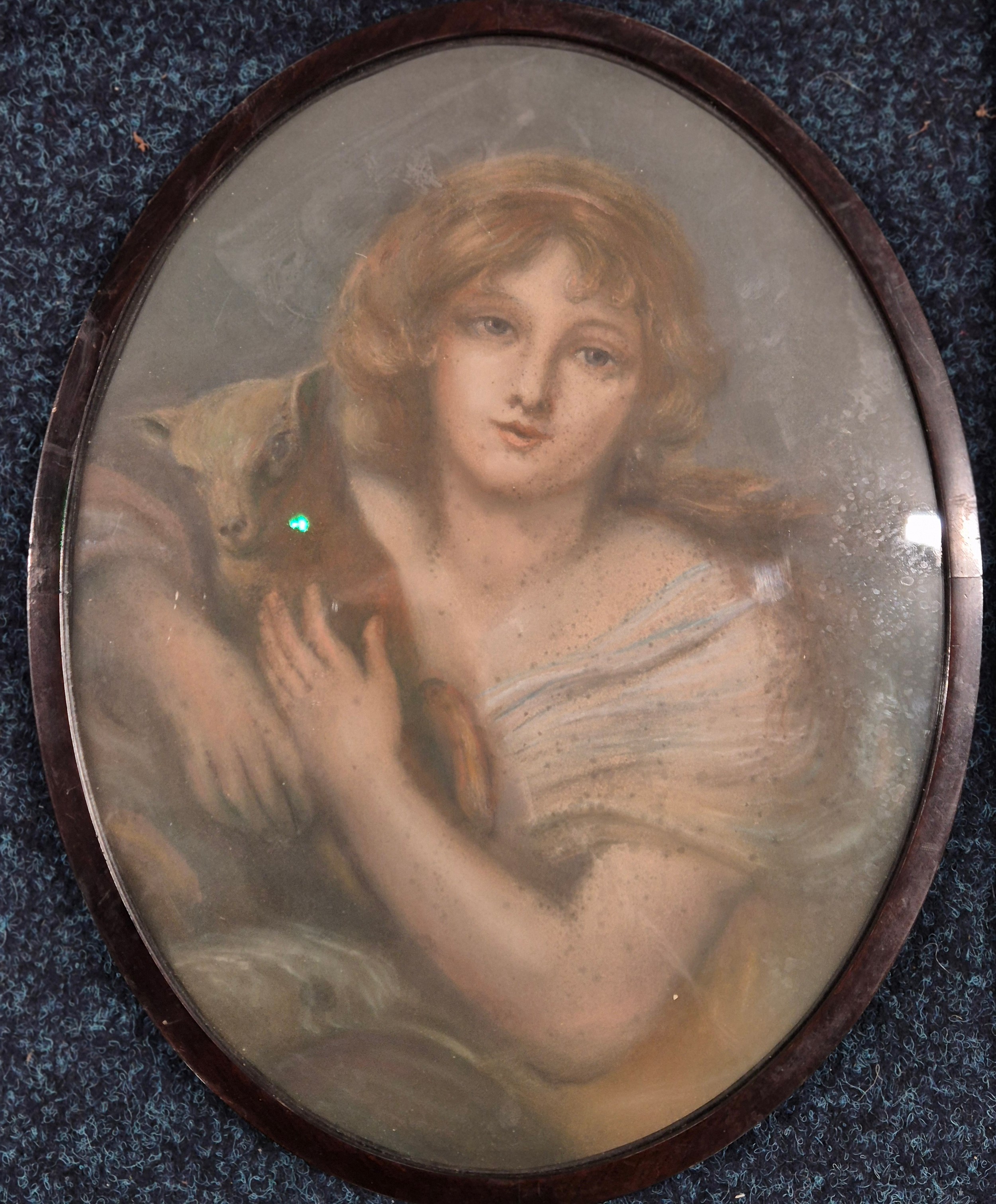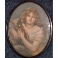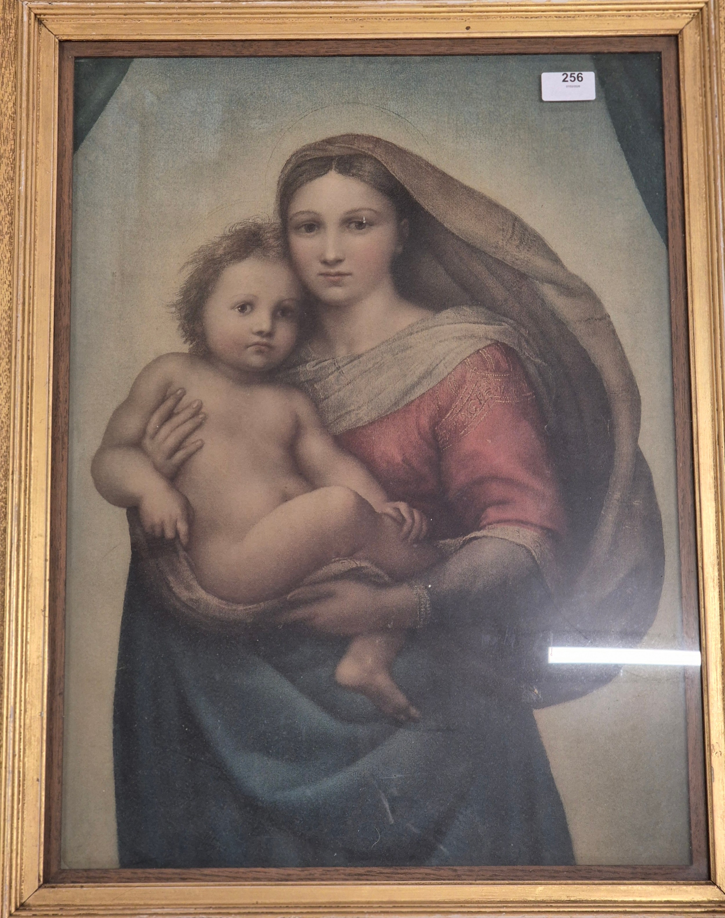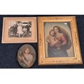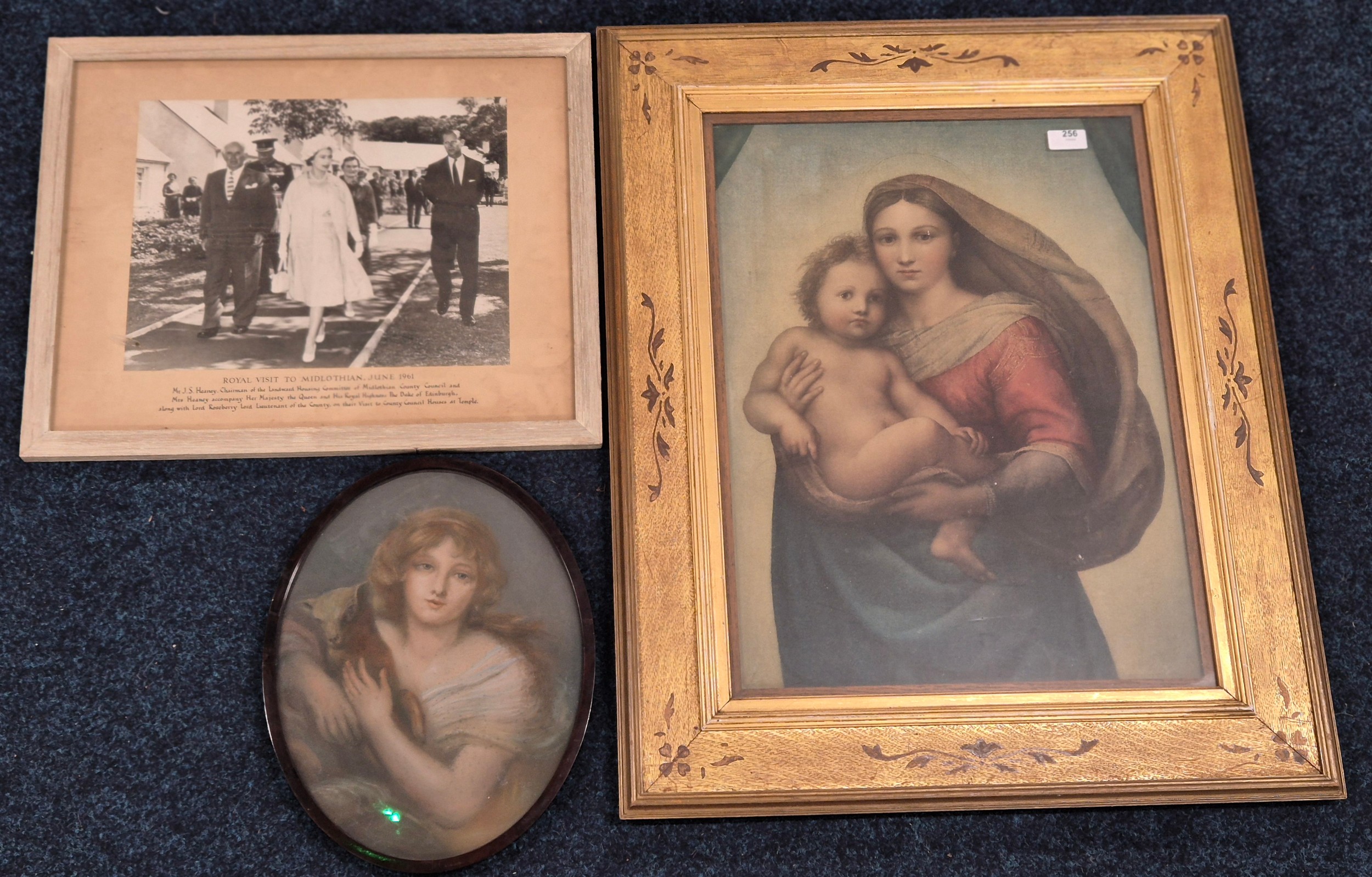 Three various artworks; 19th century Pastel portrait of girl holding lamb, fitted within an oval frame. Print of Raphael's Renaissance painting "Sistine Madonna" in gilt frame and photograph of Queen Elizabeth Royal visit to Midlothian June 1961.