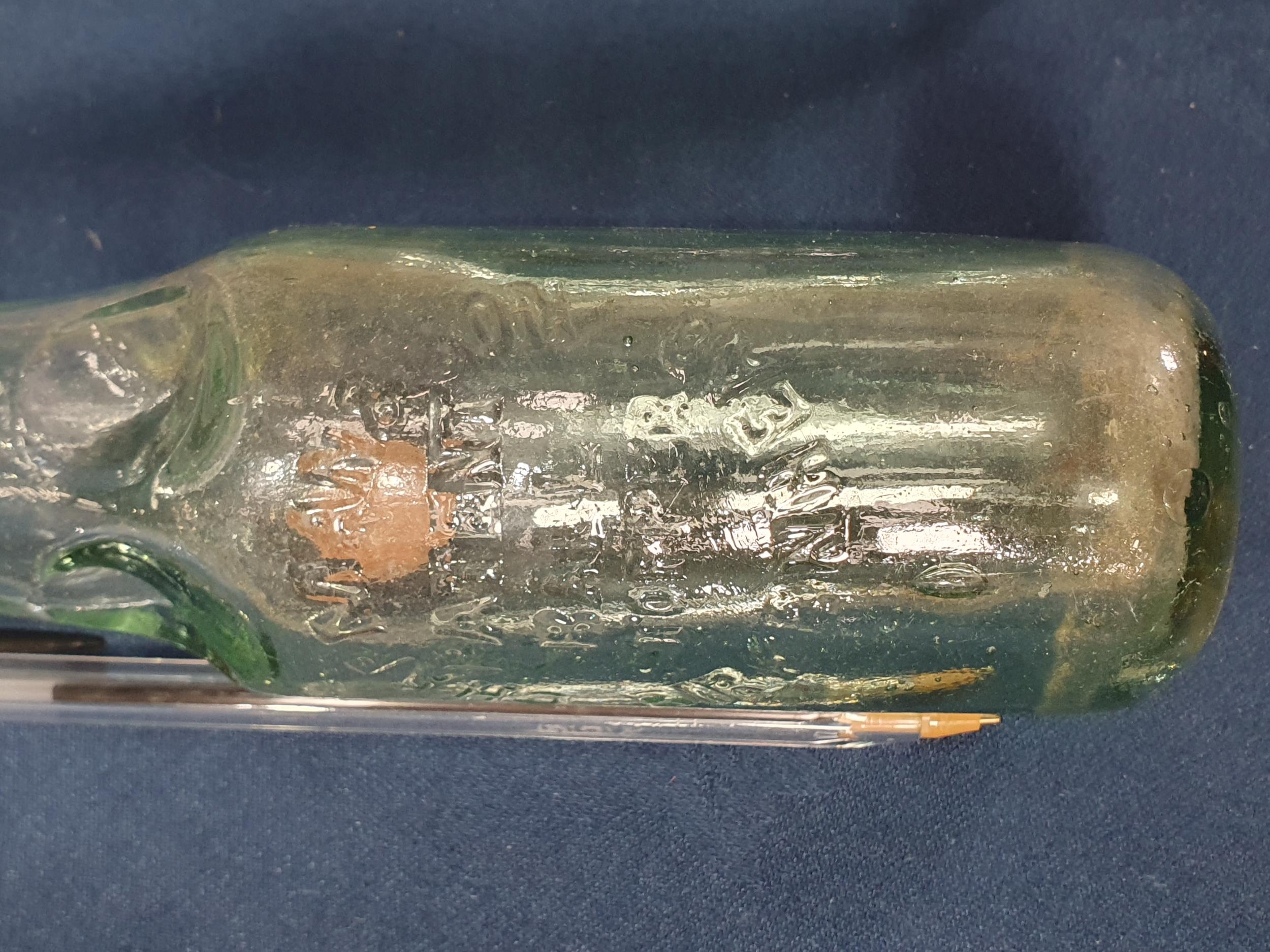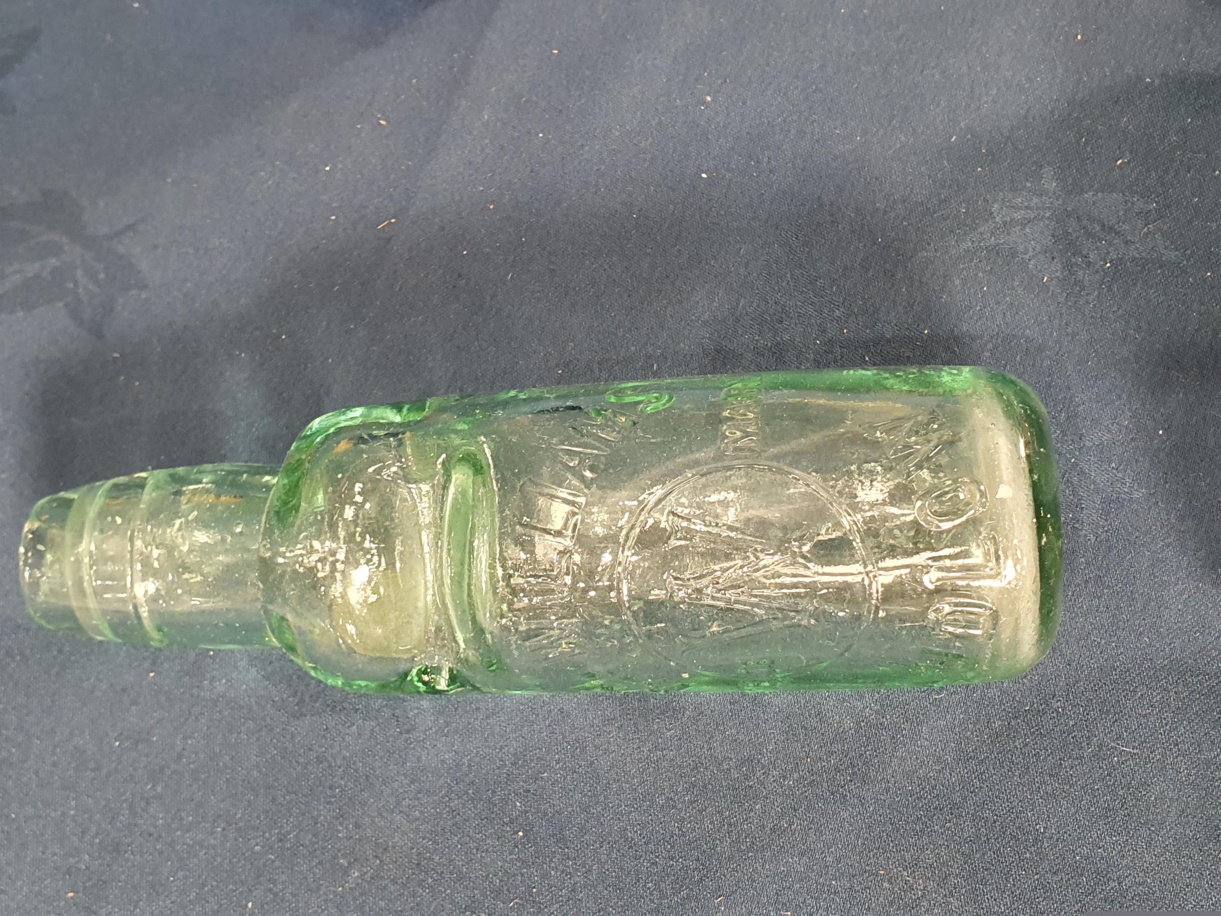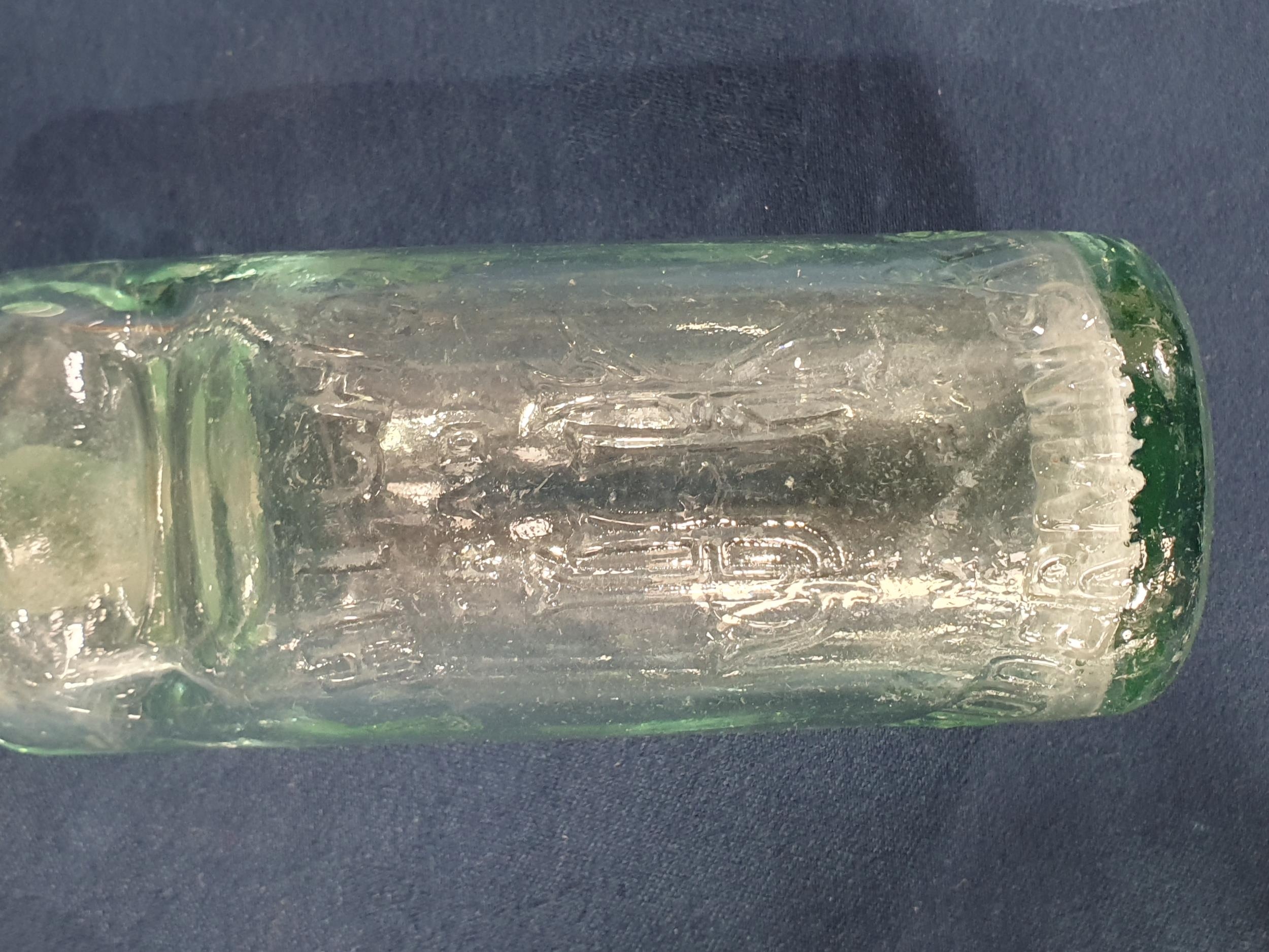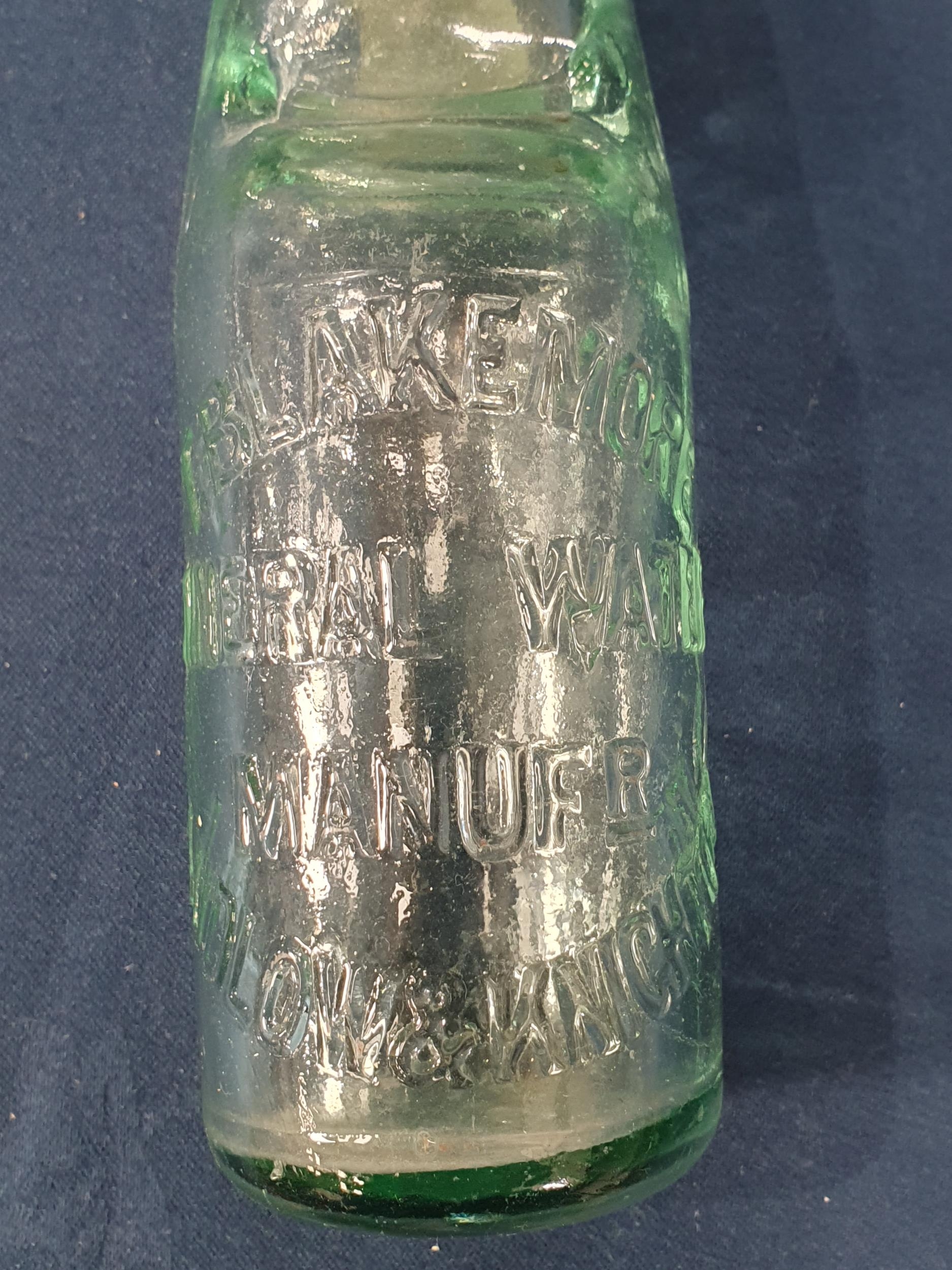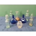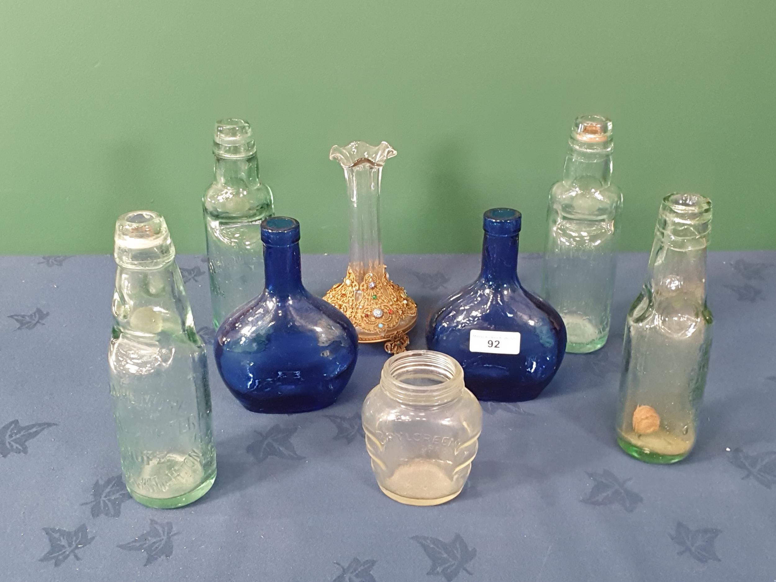 A pair of blue glass Flasks, 5 1/2 in H, four marble neck Bottles with makers names, a Brylcream glass Jar, and a glass Vase with gilt jewelled decoration, (R2)