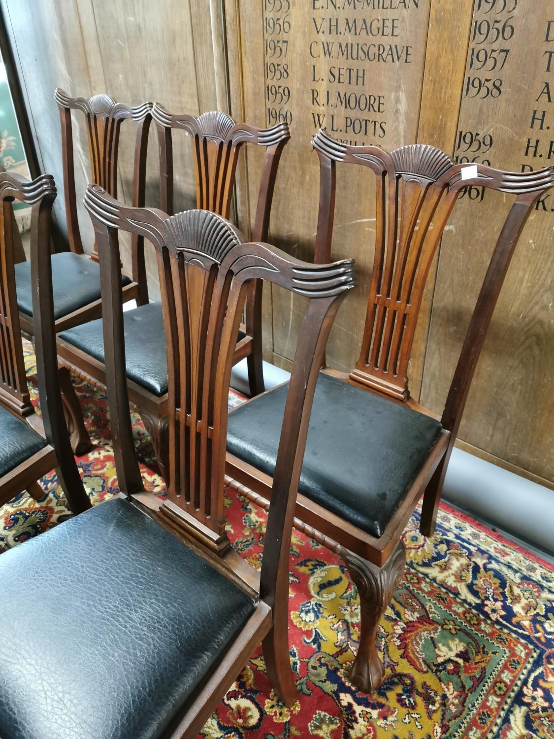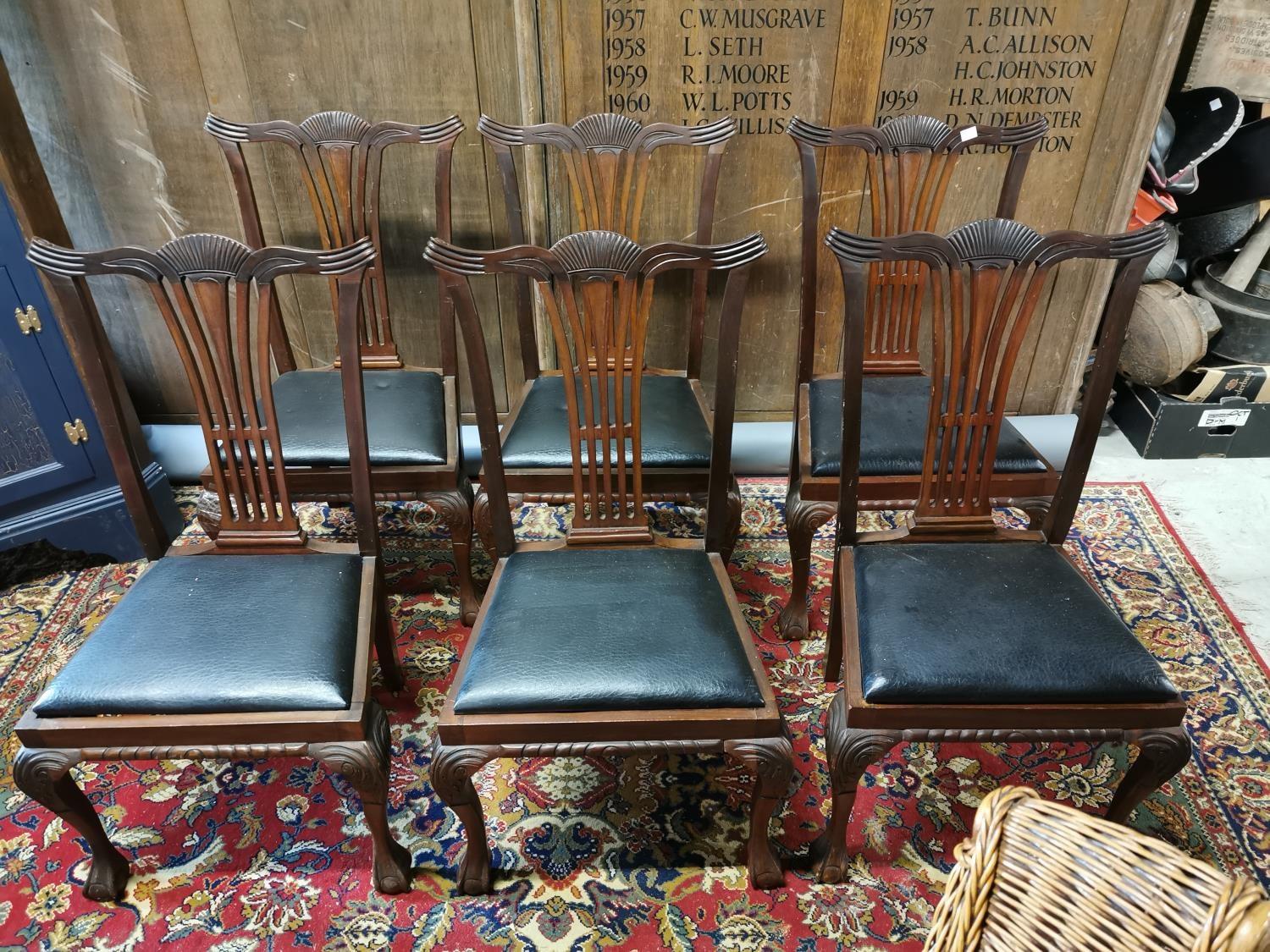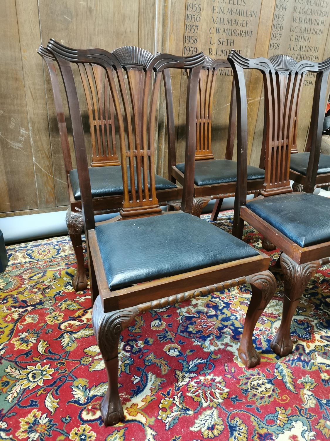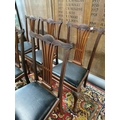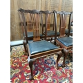 Set of six mahogany and upholstered dining chairs in the Chippendale style {92 cm H x 54 cm W x 44 cm D}.