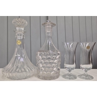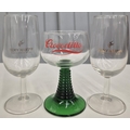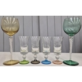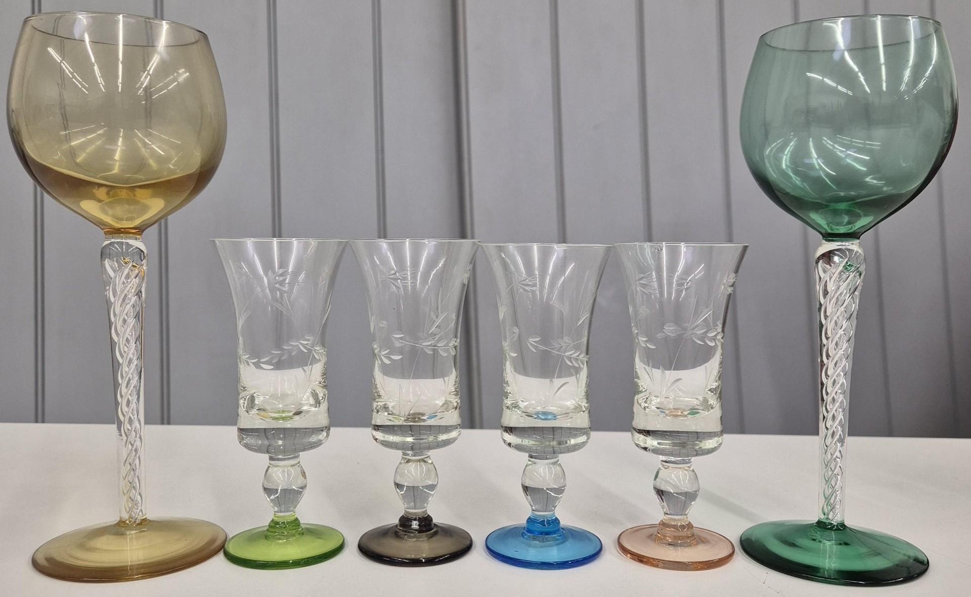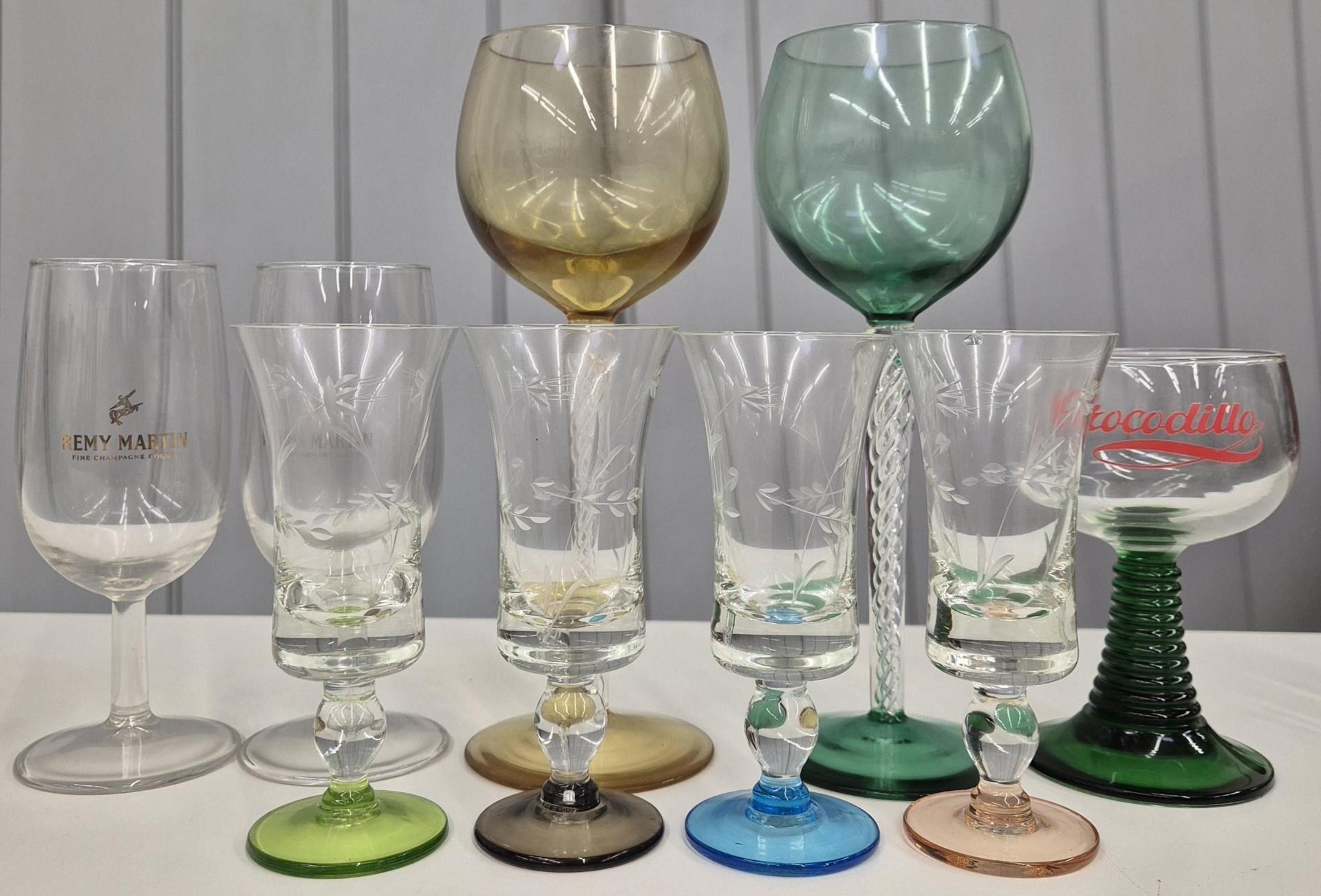 A selection of vintage coloured/branded glassware. To include 'Remy Martin' & 'Crocodillo' examples, a pair of tall air twist stemmed glasses & a set of four mid-century sherry glasses.