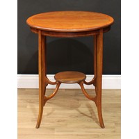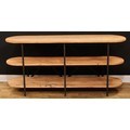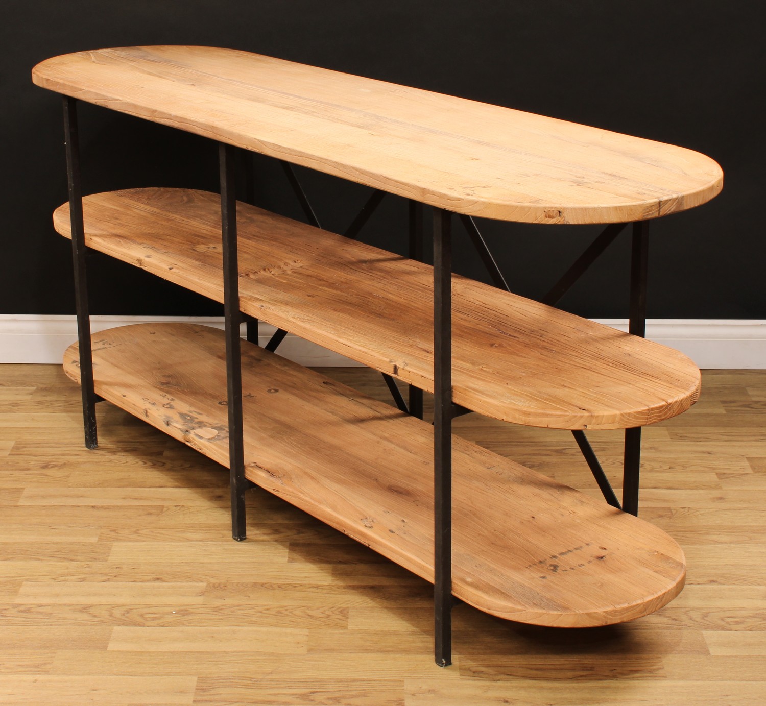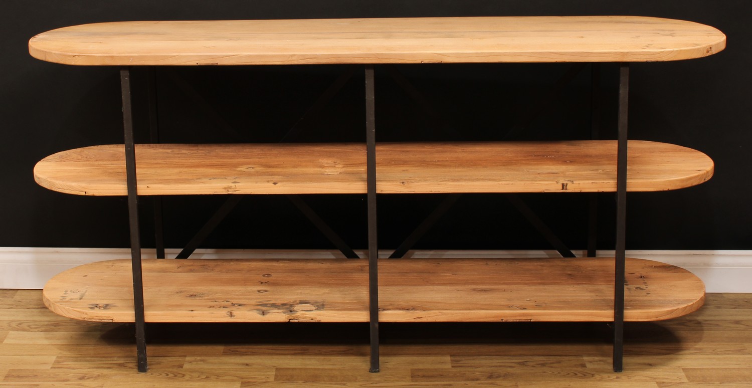 An industrial design softwood and metal open bookcase or three-tier side table, discorectangular plateaux, 80.5cm high, 170cm wide, 50cm deep