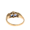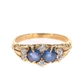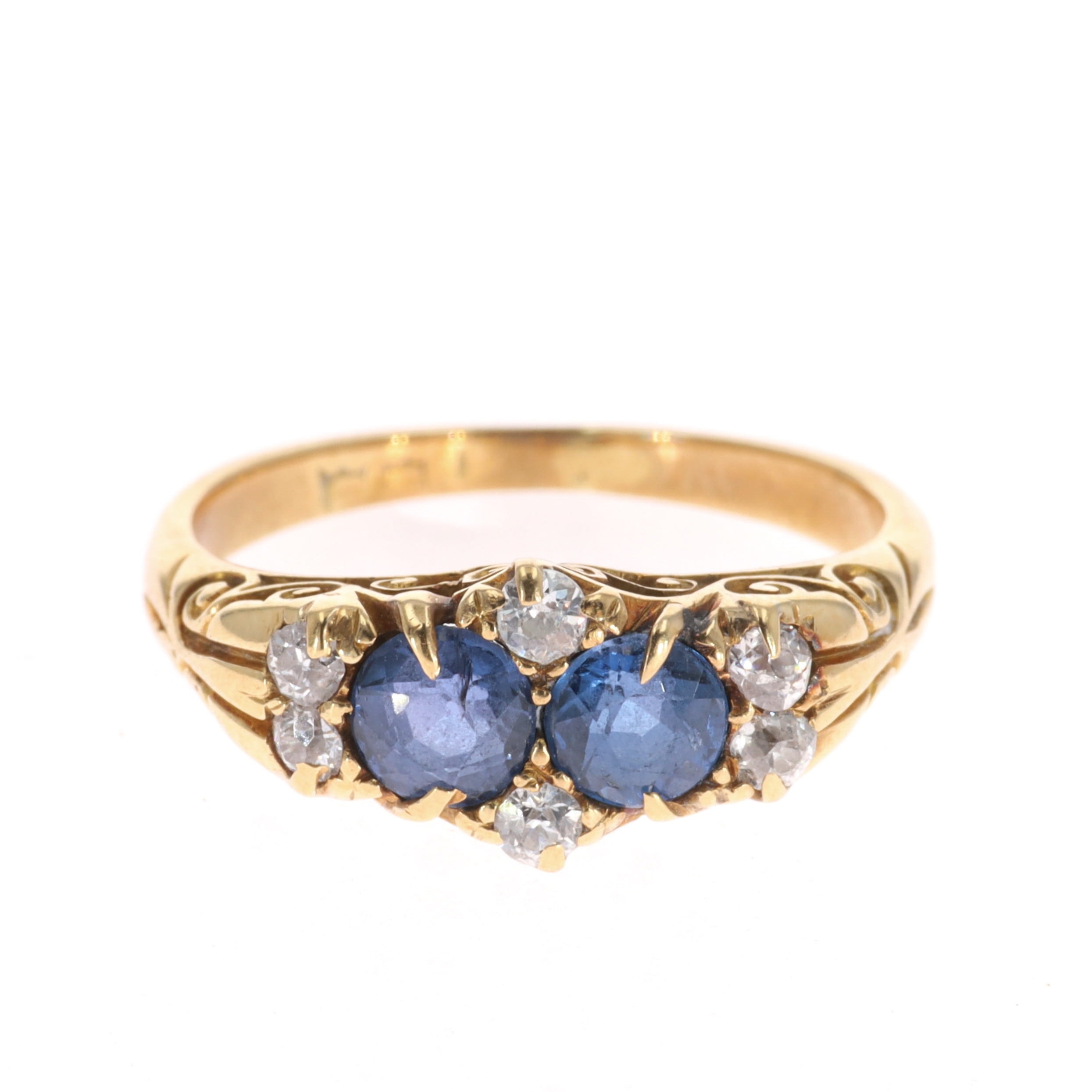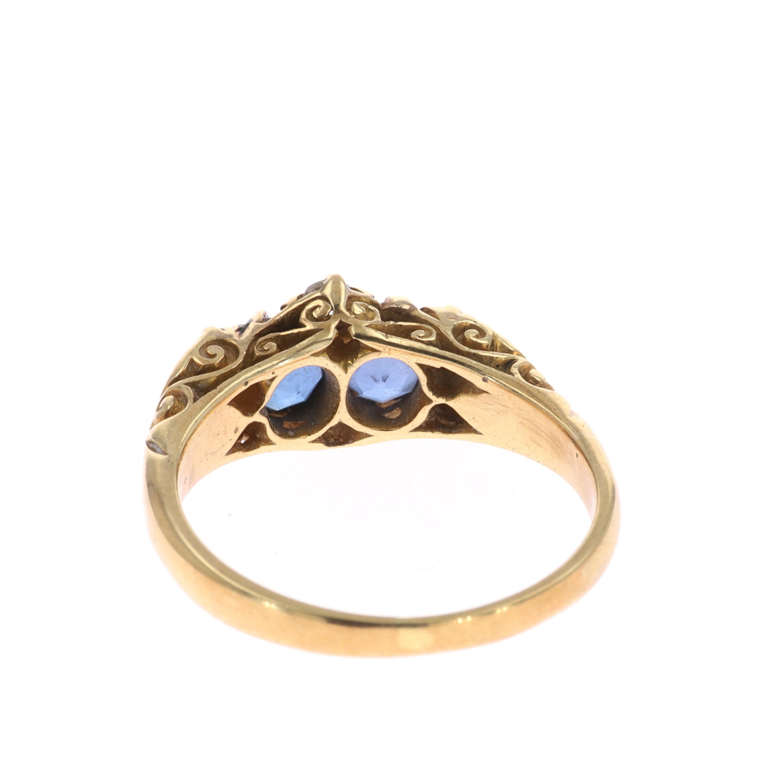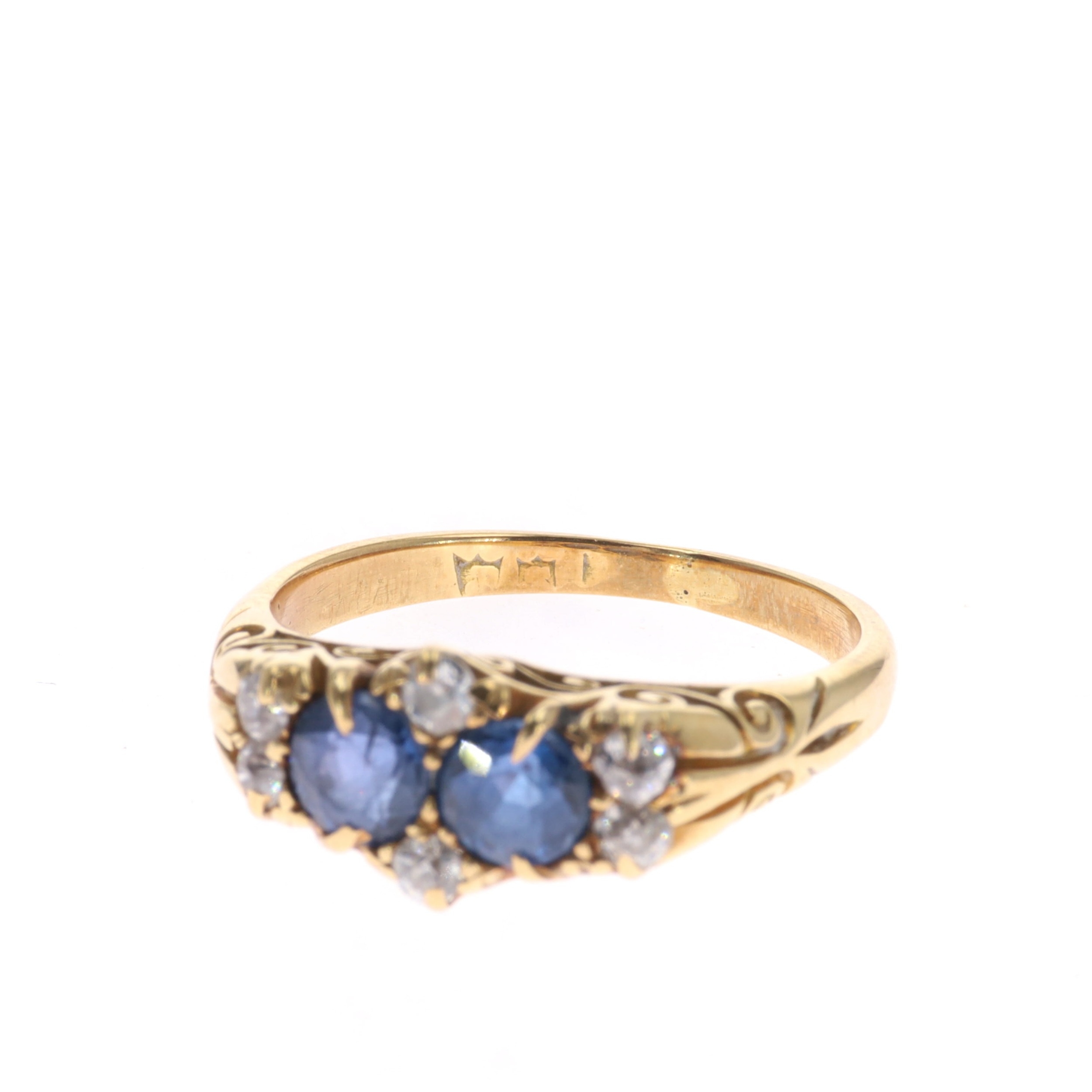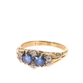 Sapphire and Diamond Gold Dress Ring. This ring has been tested for 18ct gold. There is light wear and scratches to the metal and stones. Some thinning of the band in reverse with evidence of a resizing to the band. UK finger size L. Weighs in total 3.9g.