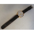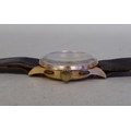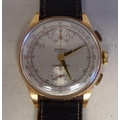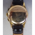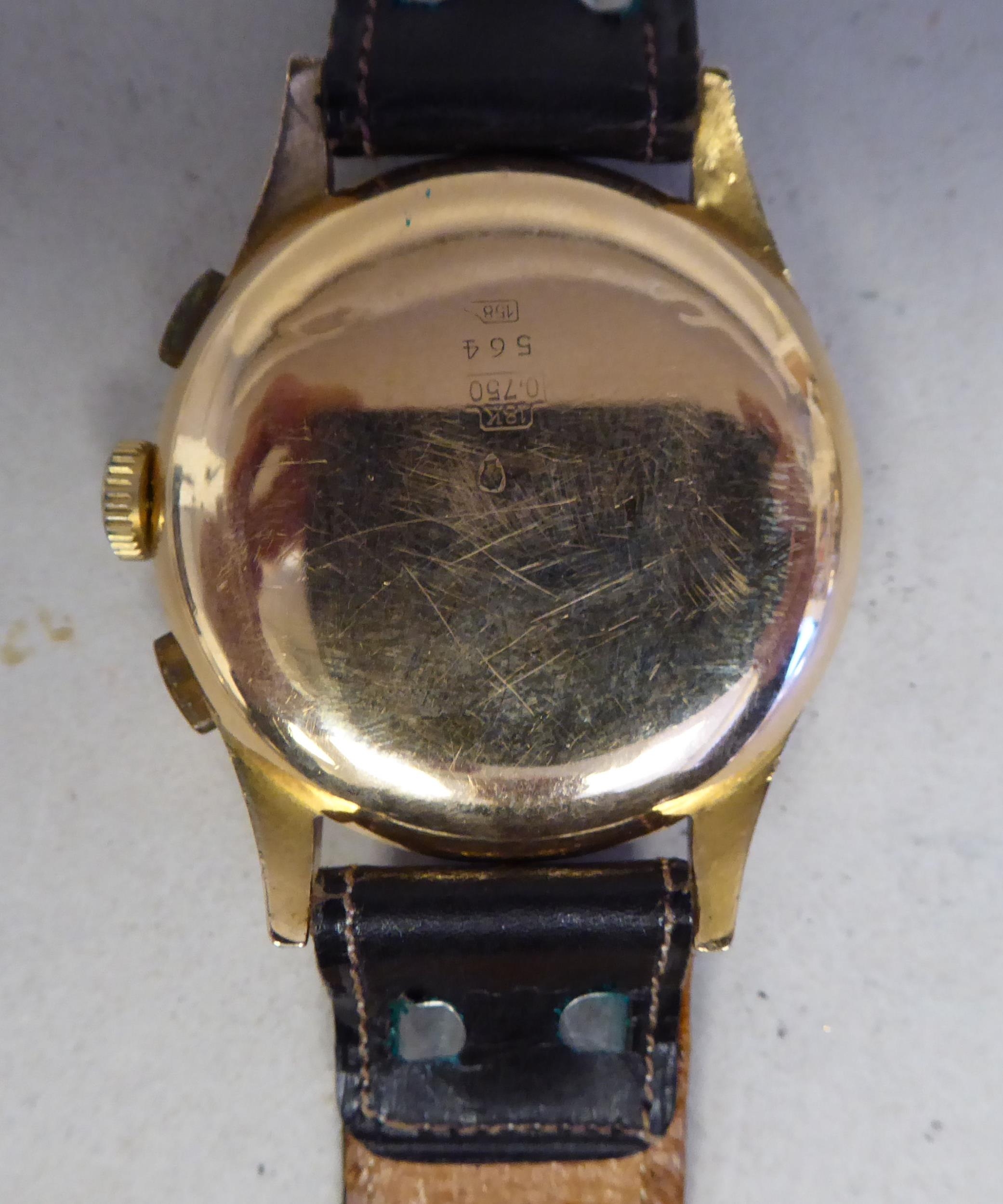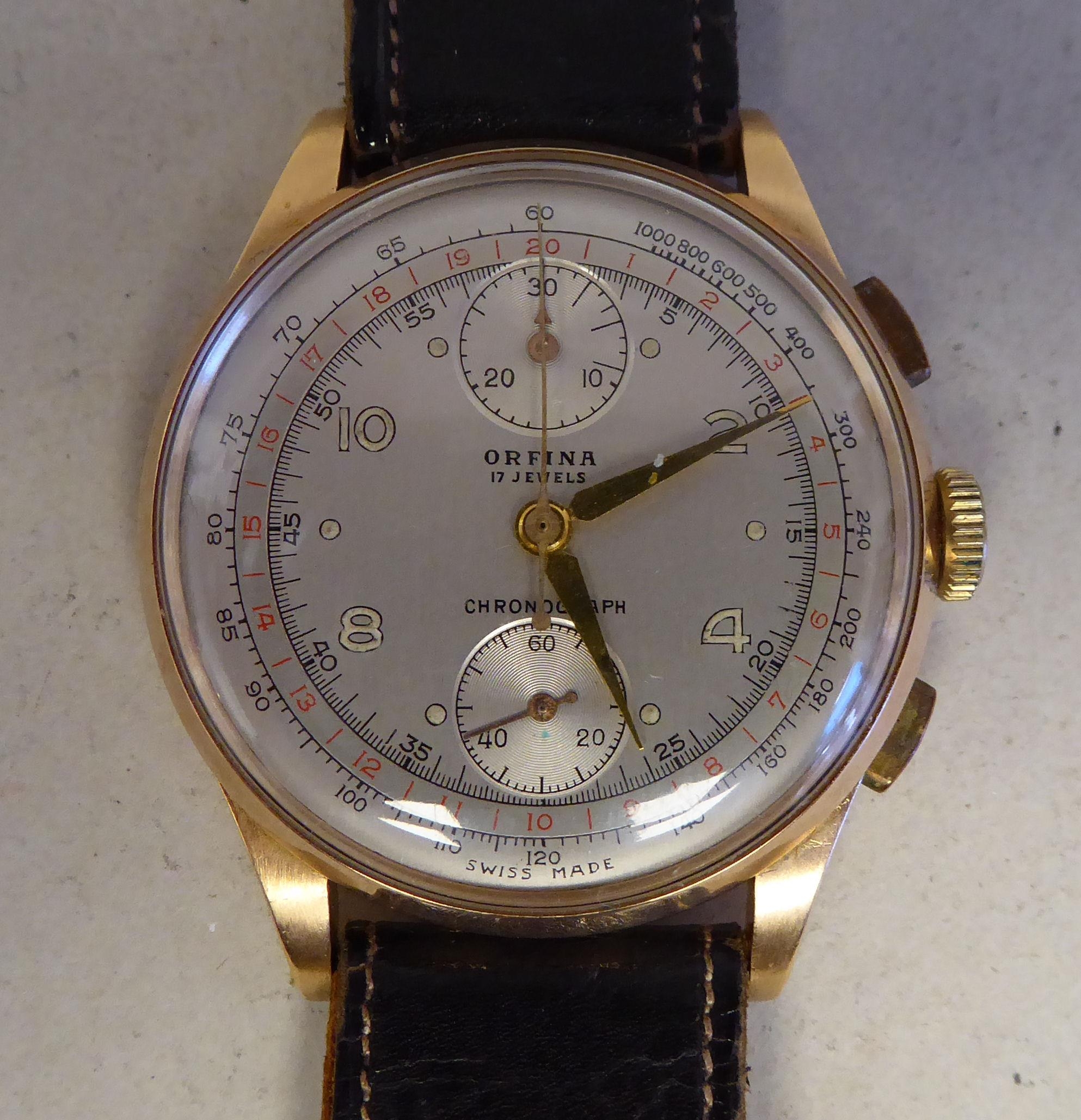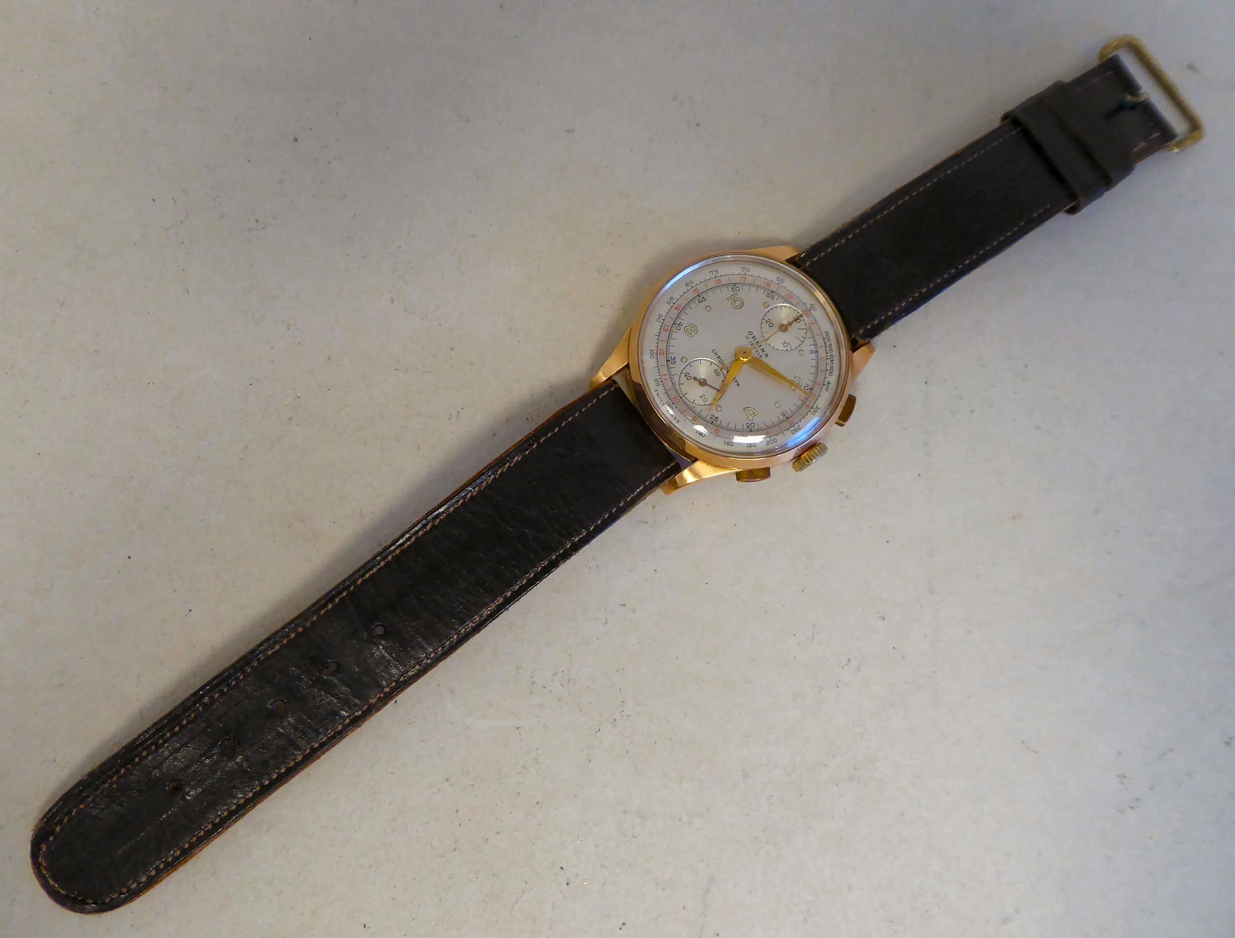 An Orfina chronograph 18ct gold cased, manual wristwatch, faced by an Arabic dial and subsidiary seconds, on a brown leather strap