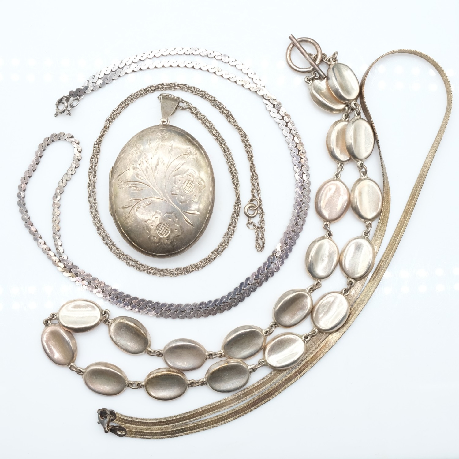 Four 925 silver necklaces, 77g combined. UK P&P Group 0 (£7+VAT for the first lot and £1+VAT for subsequent lots)