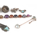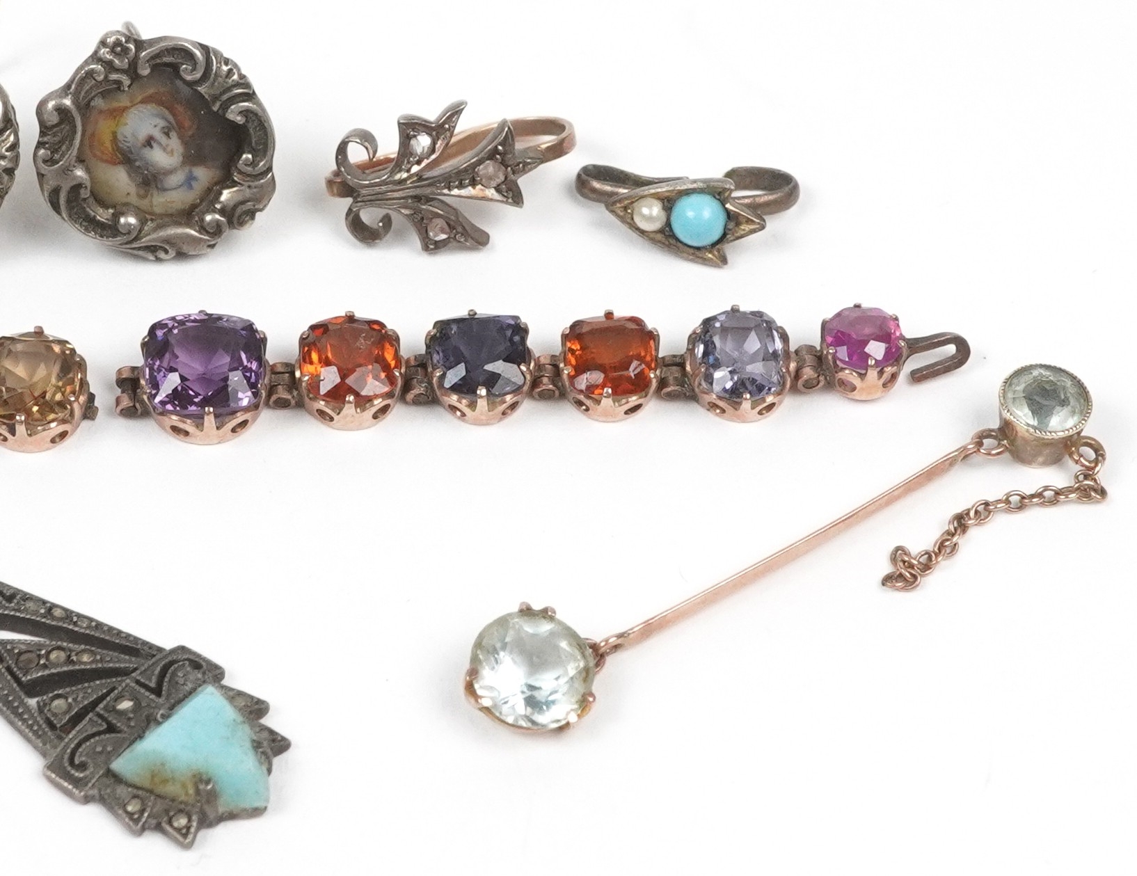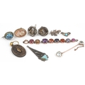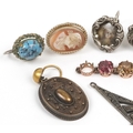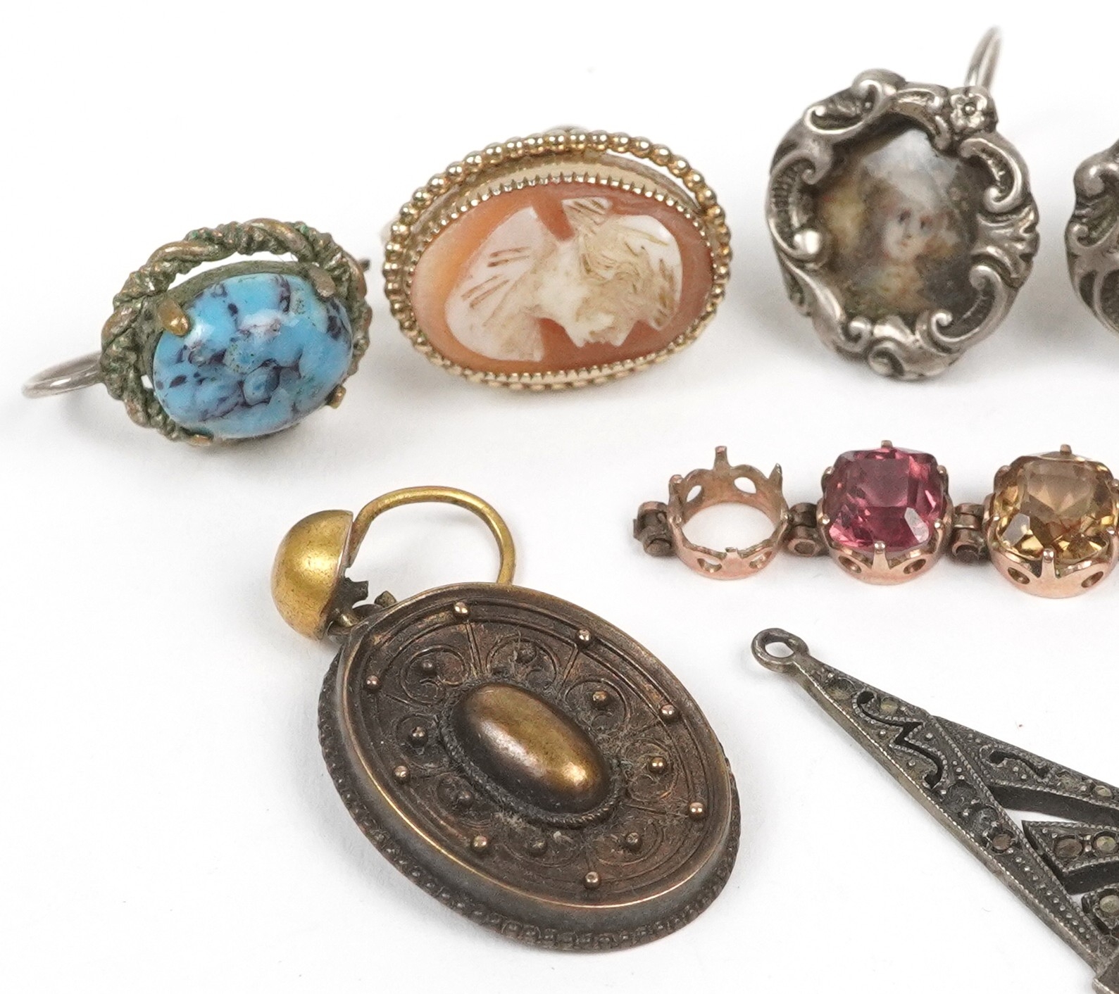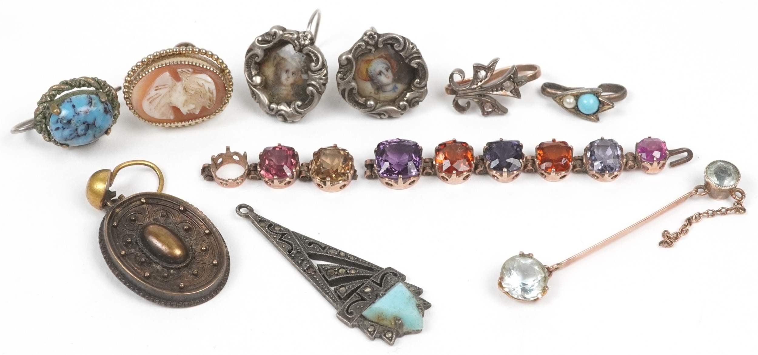 Antique and later jewellery, some unmarked gold, including a pair of silver earrings with portrait miniatures, a broken chain set with semi precious stones and a diamond set fleur de lis clip, the largest 4cm in length, total 20.2g.