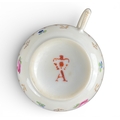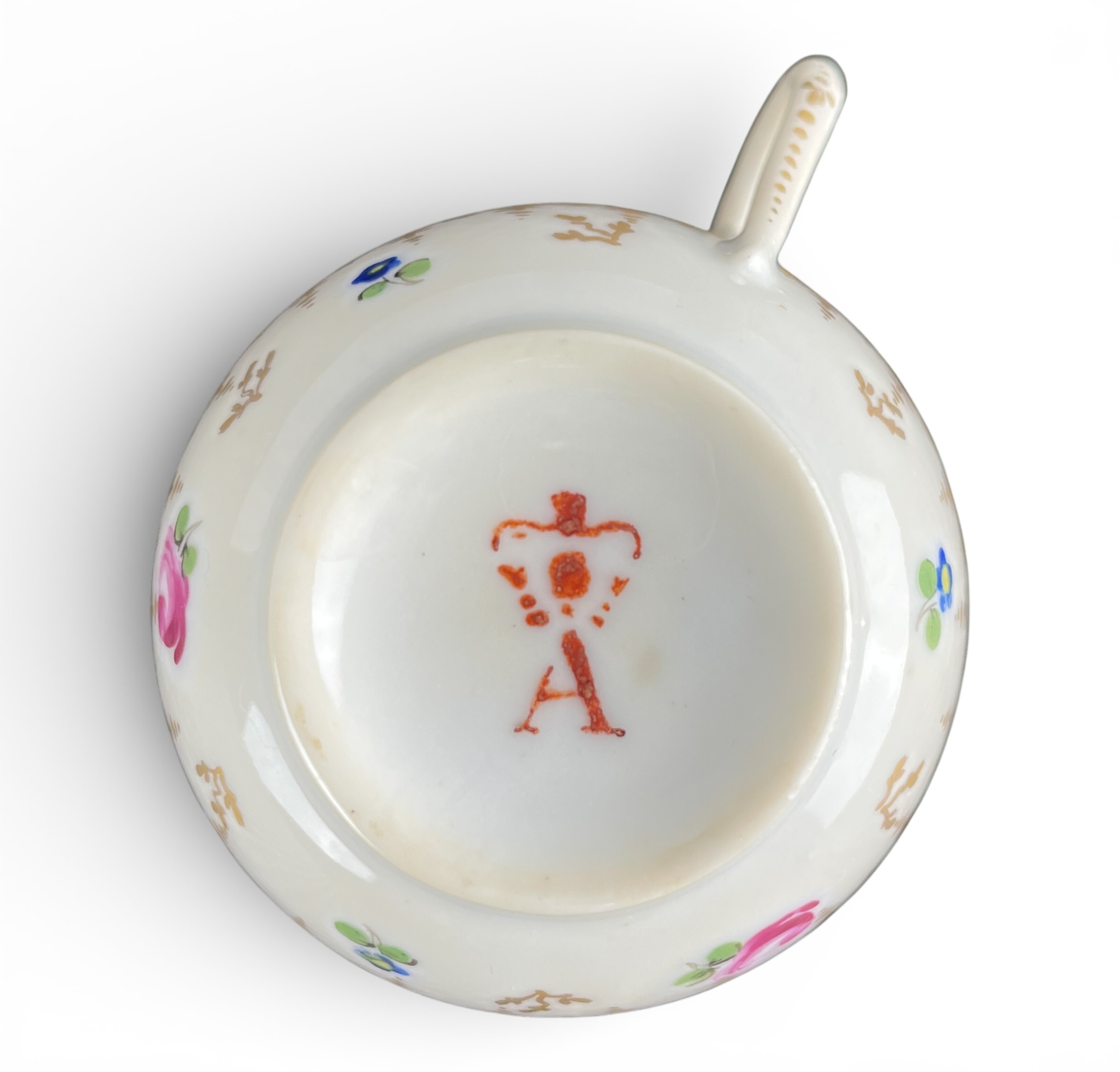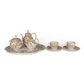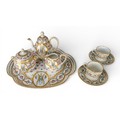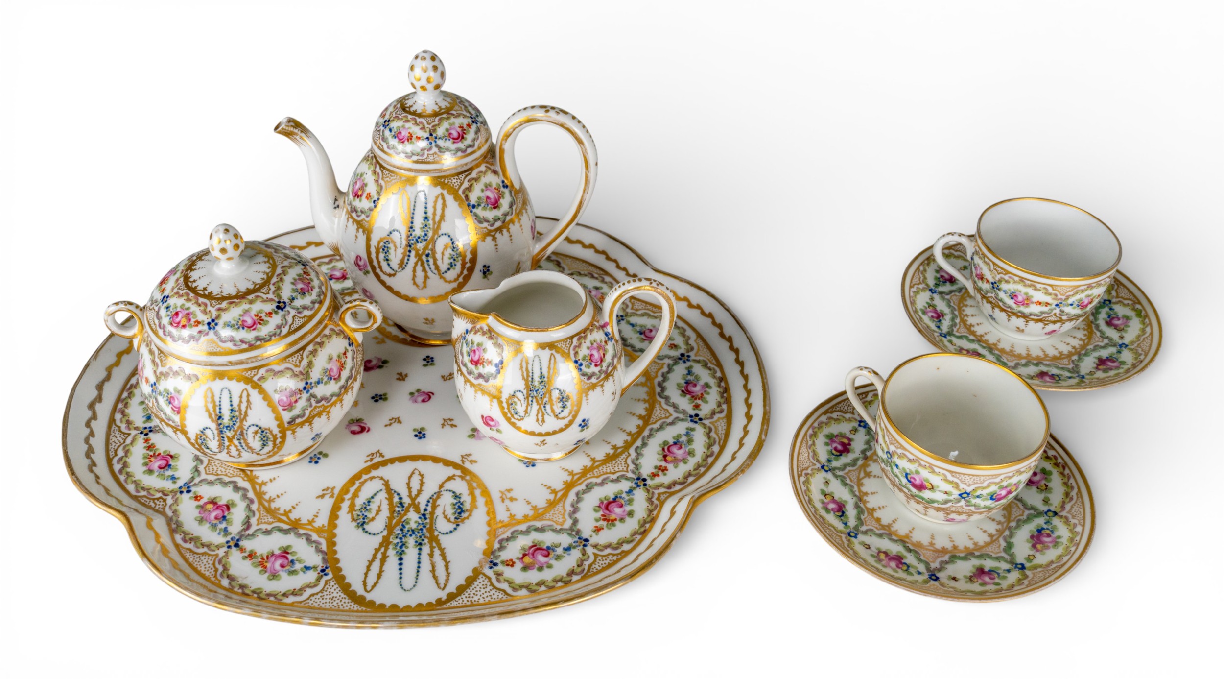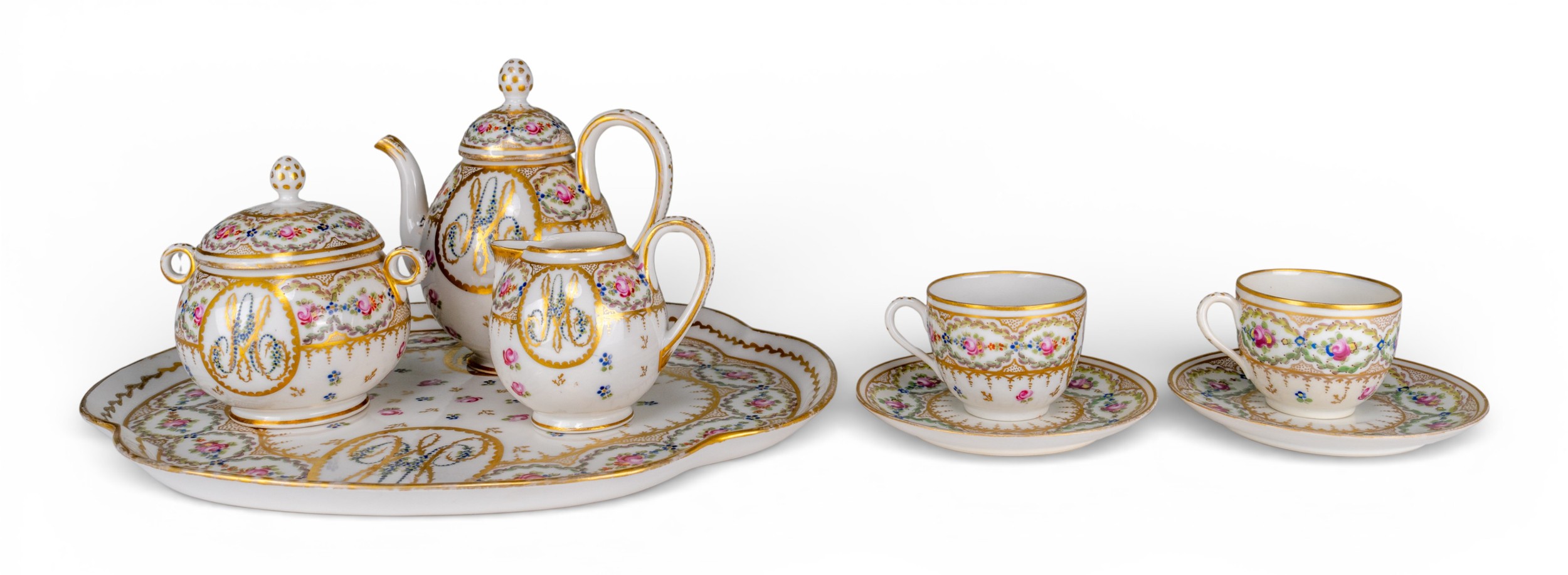 A hand-painted porcelain chocolate set, with a crowned 'A' André-Marie Leboeuf mark to the base. With floral and gilt decoration and Marie-Antoinette monogram. To include a chocolate pot, creamer, sugar container, two chocolate cups and saucers, and a tray.