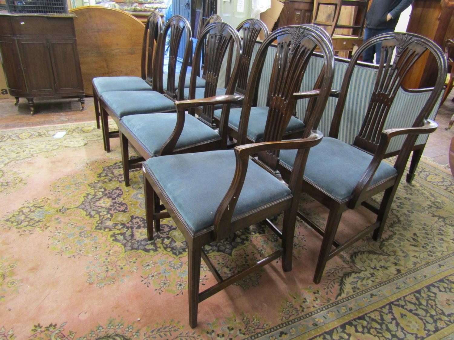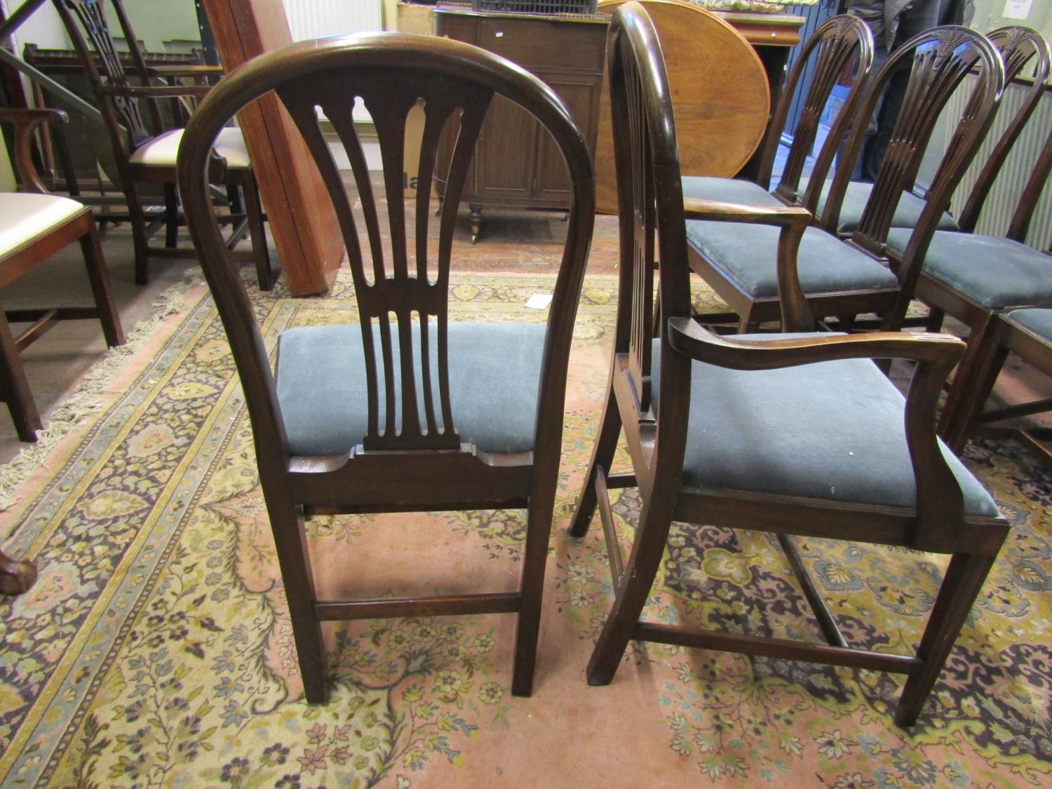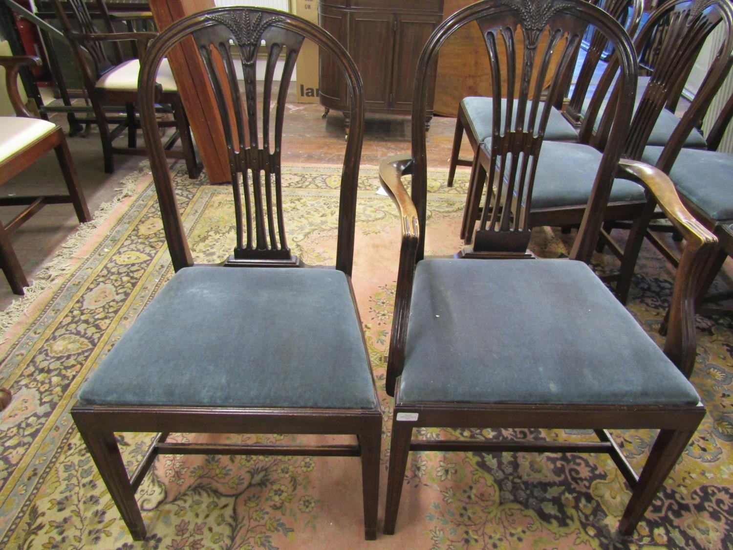 A set of eight (2+6) Hepplewhite style mahogany dining chairs with carved and pierced splats with wheatear detail, within a moulded framework, raised on square tapering supports, with drop in upholstered seats, c.1900
