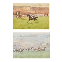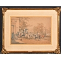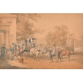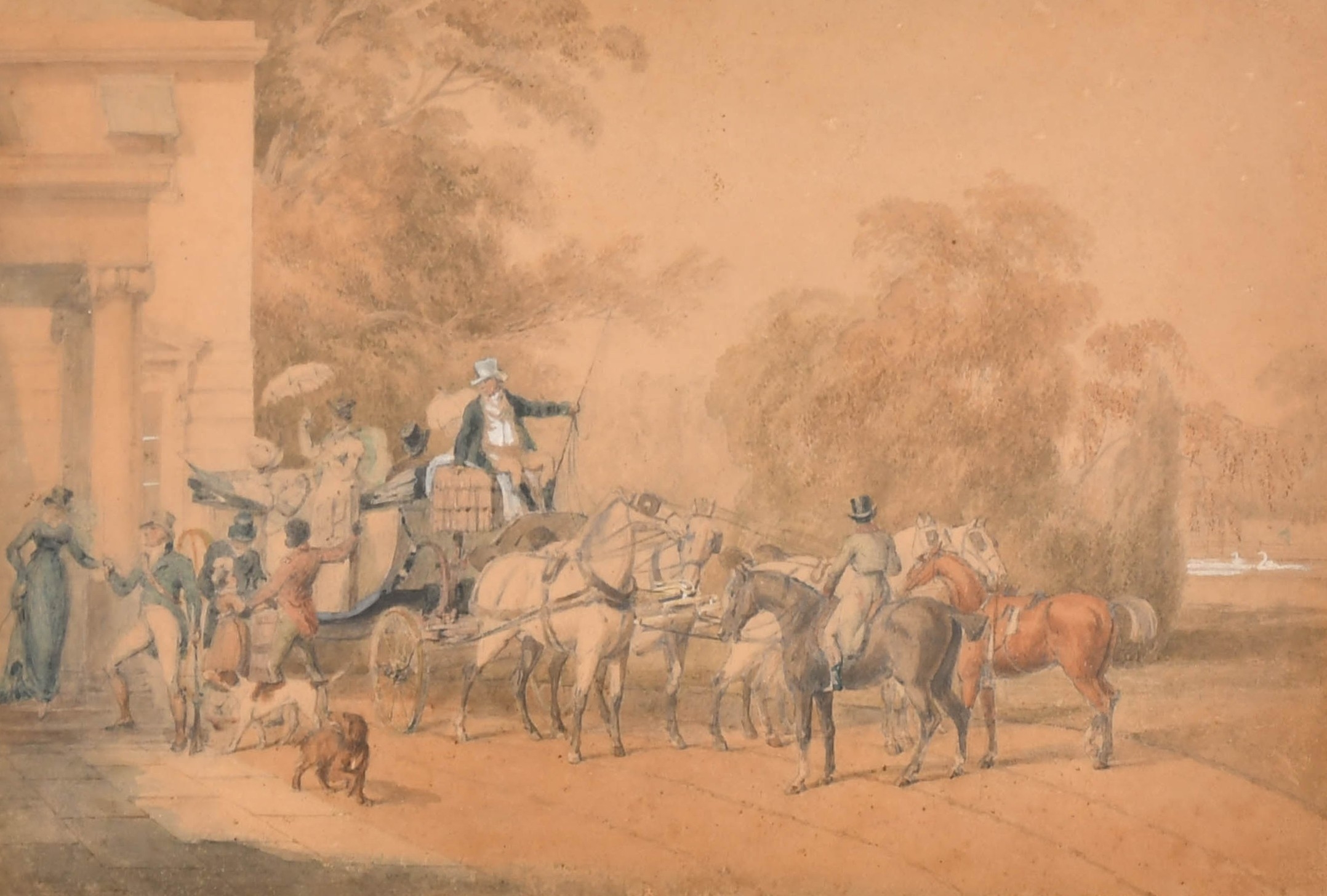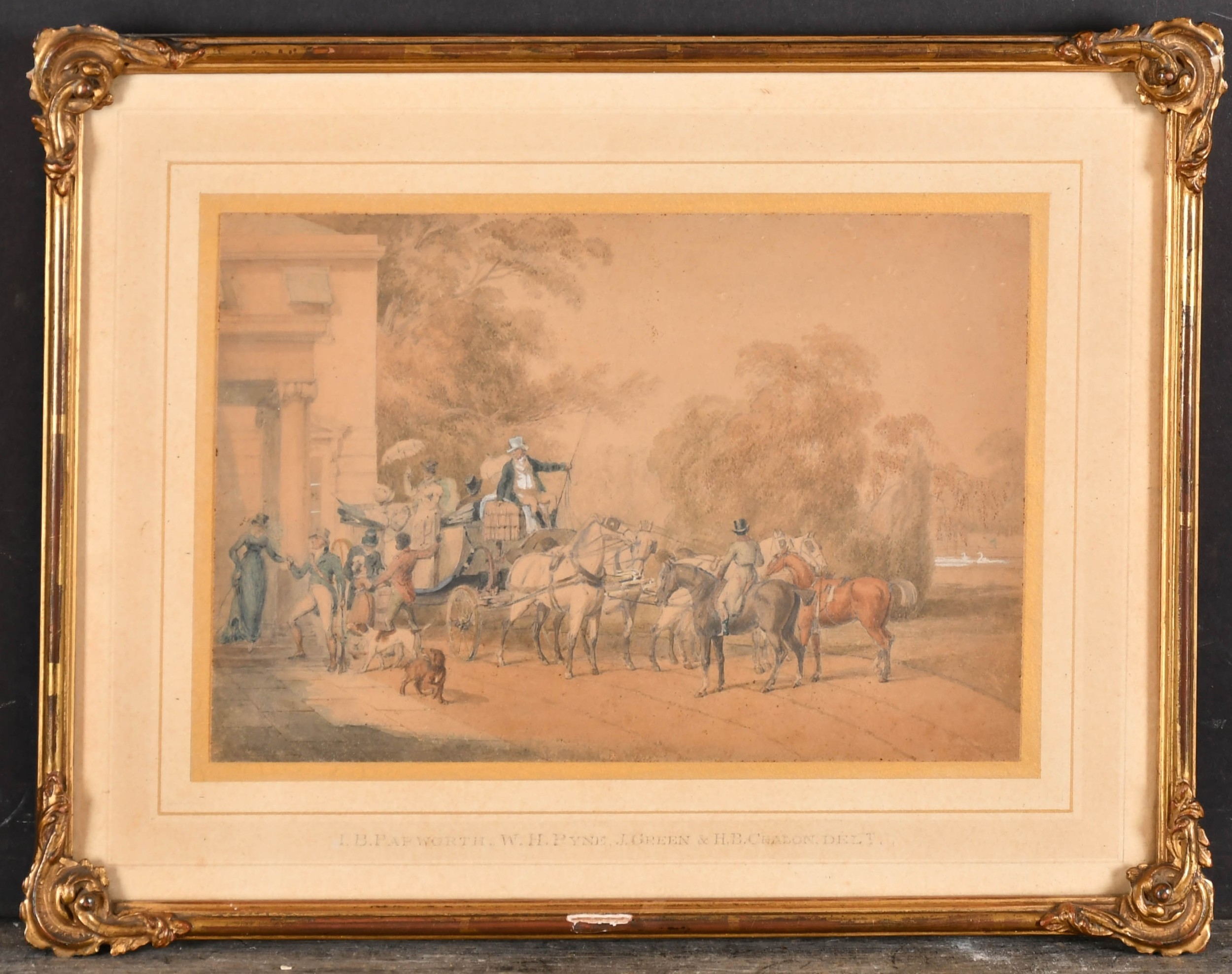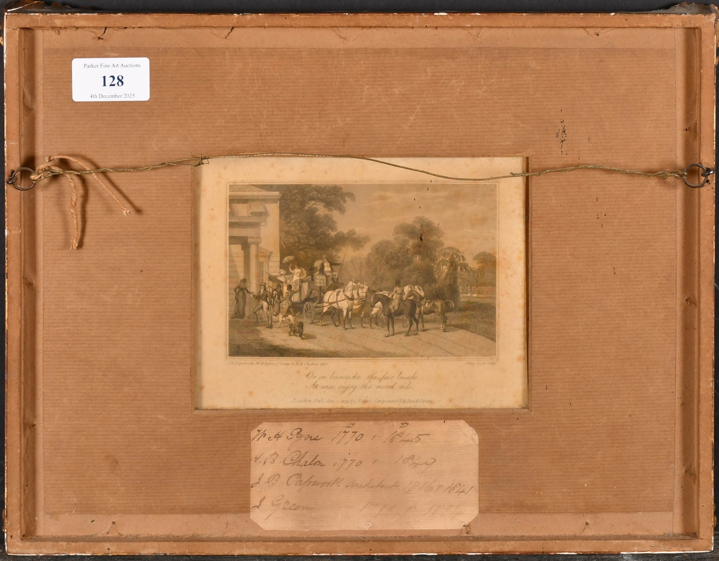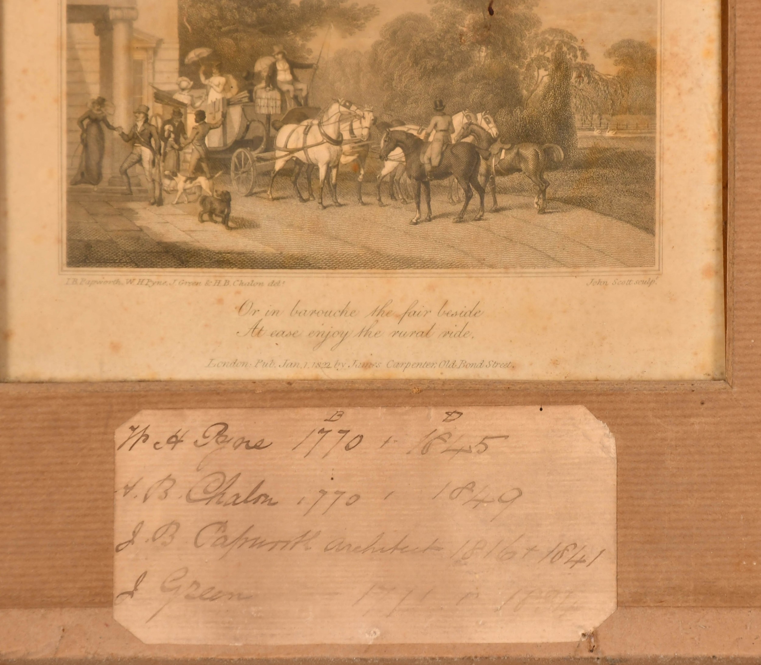 John Buonarotti Papworth (1775-1847), William Henry Pyne (1769-1843), James Green (1771-1837). Henry Bernard Chalon (1770-1849) British. "Or in barouche the fair beside, At ease enjoy the rural ride", Watercolour, Inscribed on the mount and inscribed on a label verso, and also with the engraving by John Scott verso, 6.4" x 9.5" (16.2 x 24.2cm)